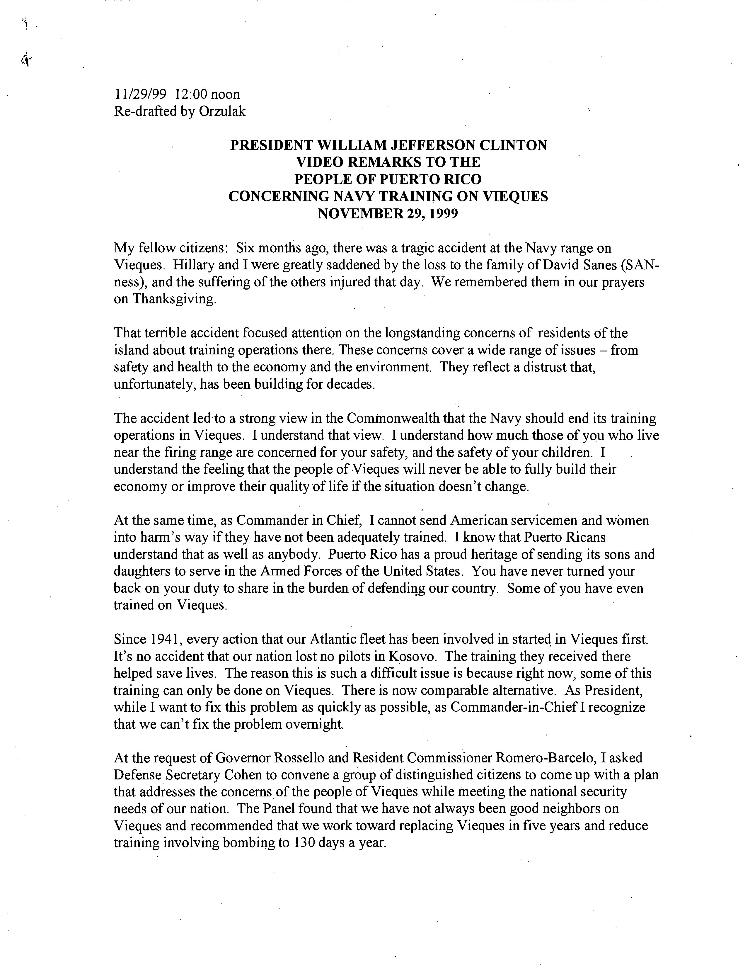 - 11/29/99 12:00 noon Re-drafted by Orzulak PRESIDENT WILLIAM JEFFERSON CLINTON VIDEO REMARKS TO THE PEOPLE OF PUERTO RICO CONCERNING NAVY TRAINING ON VIEQUES NOVEMBER 29, 1999 My fellow citizens: Six months ago, there was a tragic accident at the Navy range on Vieques. Hillary and I were greatly saddened by the loss to the family of David Sanes (SAN- ness), and the suffering of the others injured that day. We remembered them in our prayers on Thanksgiving. That terrible accident focused attention on the longstanding concerns of residents of the island about training operations there. These concerns cover a wide range of issues – from safety and health to the economy and the environment. They reflect a distrust that, unfortunately, has been building for decades. The accident led to a strong view in the Commonwealth that the Navy should end its training operations in Vieques. I understand that view. I understand how much those of you who live near the firing range are concerned for your safety, and the safety of your children. I understand the feeling that the people of Vieques will never be able to fully build their economy or improve their quality of life if the situation doesn't change. At the same time, as Commander in Chief, I cannot send American servicemen and women into harm's way if they have not been adequately trained. I know that Puerto Ricans understand that as well as anybody. Puerto Rico has a proud heritage of sending its sons and daughters to serve in the Armed Forces of the United States. You have never turned your back on your duty to share in the burden of defending our country. Some of you have even trained on Vieques. Since 1941, every action that our Atlantic fleet has been involved in started in Vieques first. It's no accident that our nation lost no pilots in Kosovo. The training they received there helped save lives. The reason this is such a difficult issue is because right now, some of this training can only be done on Vieques. There is now comparable alternative. As President, while I want to fix this problem as quickly as possible, as Commander-in-Chief I recognize that we can't fix the problem overnight. At the request of Governor Rossello and Resident Commissioner Romero-Barcelo, I asked Defense Secretary Cohen to convene a group of distinguished citizens to come up with a plan that addresses the concerns of the people of Vieques while meeting the national security needs of our nation. The Panel found that we have not always been good neighbors on Vieques and recommended that we work toward replacing Vieques in five years and reduce training involving bombing to 130 days a year.