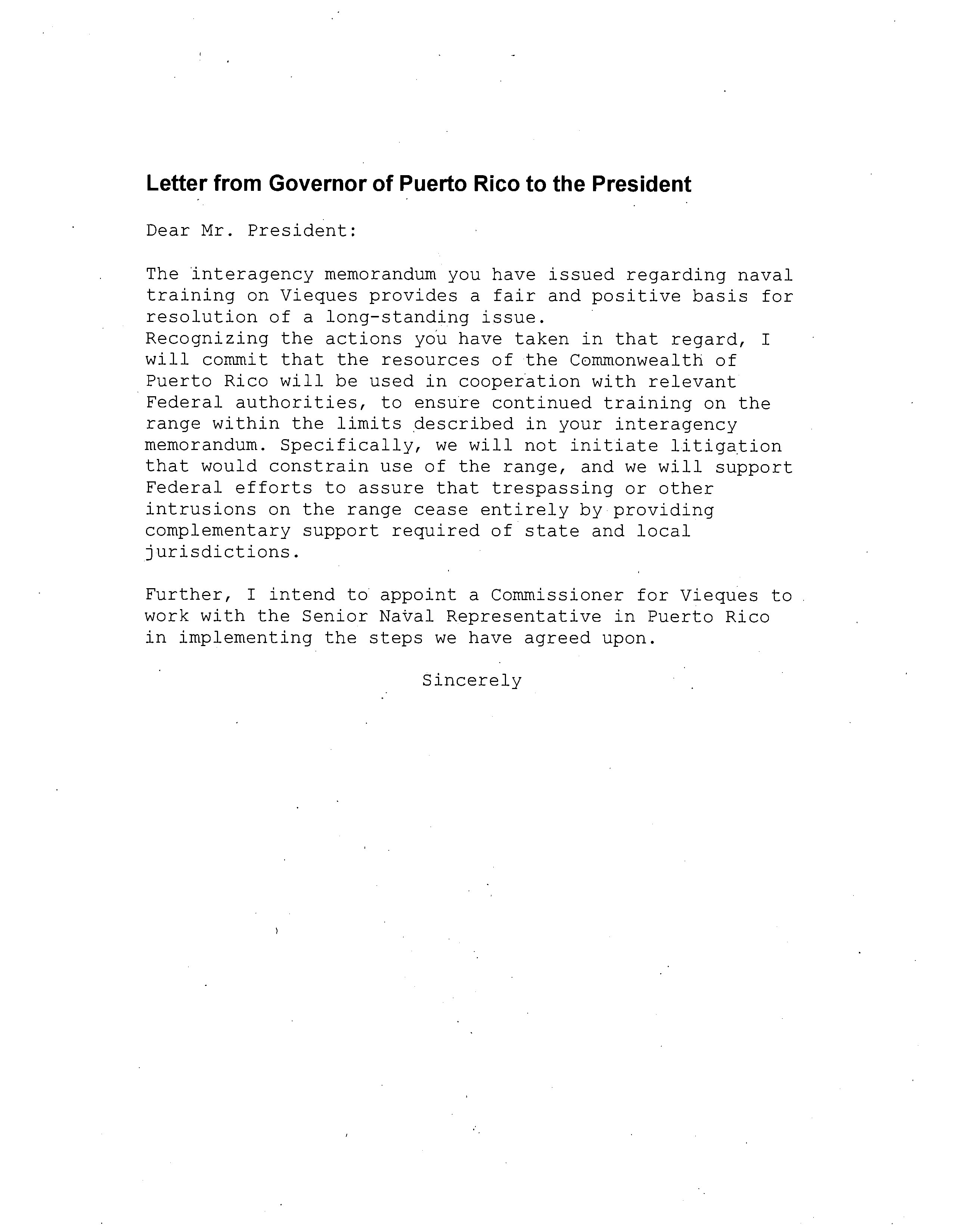 - # Letter from Governor of Puerto Rico to the President Dear Mr. President: The interagency memorandum you have issued regarding naval training on Vieques provides a fair and positive basis for resolution of a long-standing issue. Recognizing the actions you have taken in that regard, I will commit that the resources of the Commonwealth of Puerto Rico will be used in cooperation with relevant Federal authorities, to ensure continued training on the range within the limits described in your interagency memorandum. Specifically, we will not initiate litigation that would constrain use of the range, and we will support Federal efforts to assure that trespassing or other intrusions on the range cease entirely by providing complementary support required of state and local jurisdictions. Further, I intend to appoint a Commissioner for Vieques to work with the Senior Naval Representative in Puerto Rico in implementing the steps we have agreed upon. Sincerely