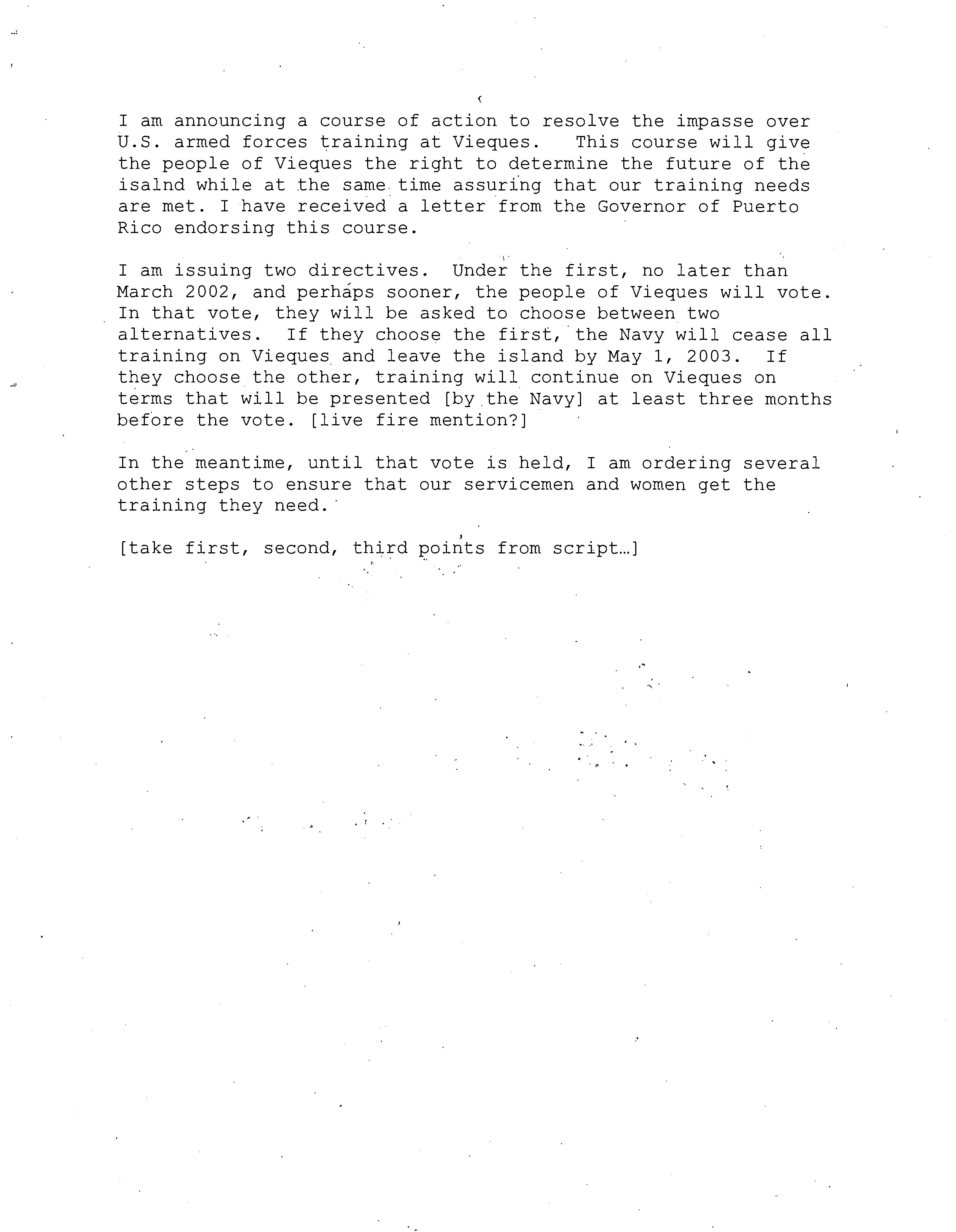 - I am announcing a course of action to resolve the impasse over U.S. armed forces training at Vieques. This course will give the people of Vieques the right to determine the future of the isalnd while at the same time assuring that our training needs are met. I have received a letter from the Governor of Puerto Rico endorsing this course. I am issuing two directives. Under the first, no later than March 2002, and perhaps sooner, the people of Vieques will vote. In that vote, they will be asked to choose between two alternatives. If they choose the first, the Navy will cease all training on Vieques and leave the island by May 1, 2003. If they choose the other, training will continue on Vieques on terms that will be presented [by the Navy] at least three months before the vote. [live fire mention?] In the meantime, until that vote is held, I am ordering several other steps to ensure that our servicemen and women get the training they need. [take first, second, third points from script...]