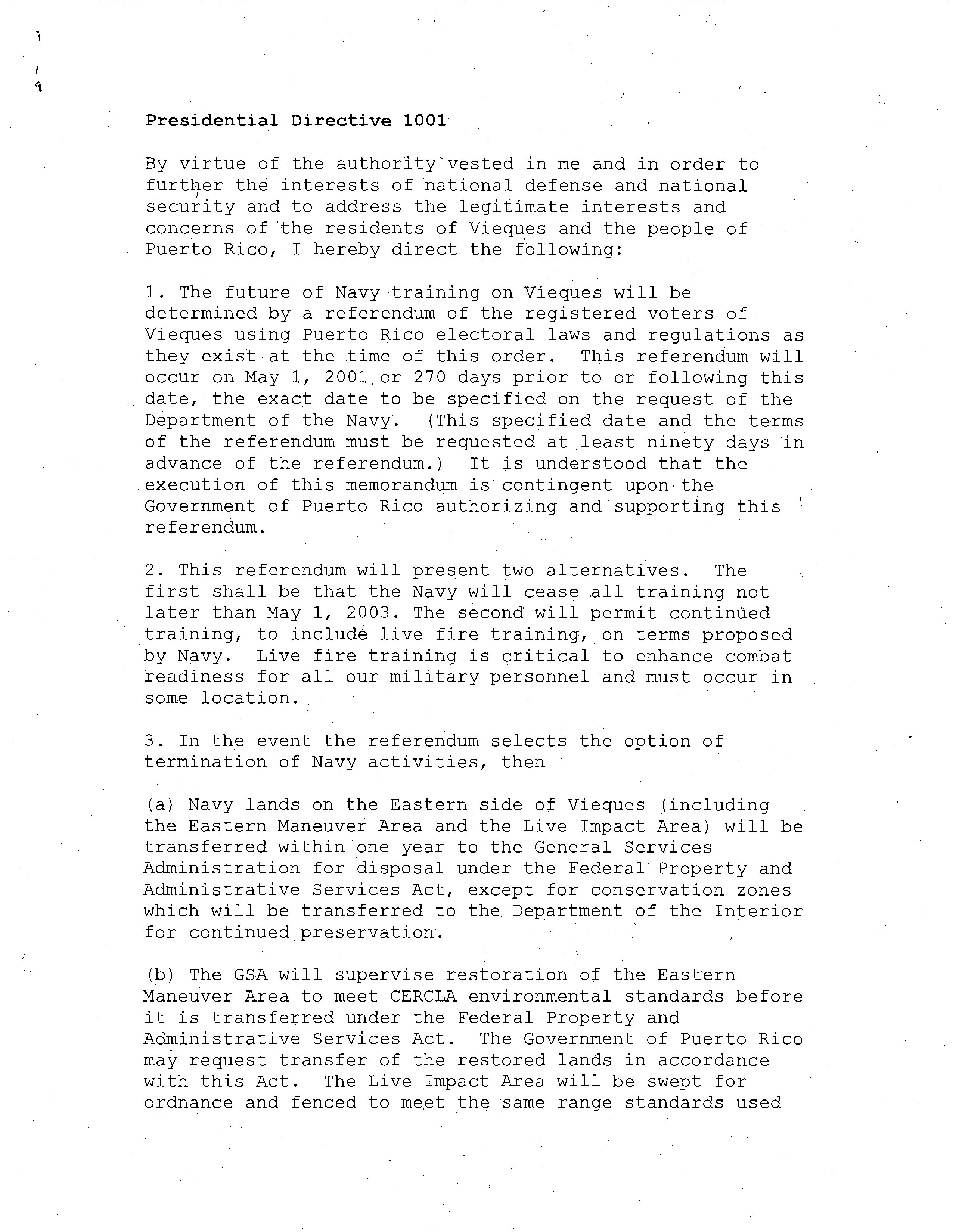 - Presidential Directive 1001 By virtue of the authority vested in me and in order to further the interests of national defense and national security and to address the legitimate interests and concerns of the residents of Vieques and the people of Puerto Rico, I hereby direct the following: 1. The future of Navy training on Vieques will be determined by a referendum of the registered voters of Vieques using Puerto Rico electoral laws and regulations as they exist at the time of this order. This referendum will occur on May 1, 2001 or 270 days prior to or following this date, the exact date to be specified on the request of the Department of the Navy. (This specified date and the terms of the referendum must be requested at least ninety days in advance of the referendum.) It is understood that the execution of this memorandum is contingent upon the Government of Puerto Rico authorizing and supporting this referendum. 2. This referendum will present two alternatives. The first shall be that the Navy will cease all training not later than May 1, 2003. The second will permit continued training, to include live fire training, on terms proposed by Navy. Live fire training is critical to enhance combat readiness for all our military personnel and must occur in some location. 3. In the event the referendum selects the option of termination of Navy activities, then (a) Navy lands on the Eastern side of Vieques (including the Eastern Maneuver Area and the Live Impact Area) will be transferred within one year to the General Services Administration for disposal under the Federal Property and Administrative Services Act, except for conservation zones which will be transferred to the Department of the Interior for continued preservation. (b) The GSA will supervise restoration of the Eastern Maneuver Area to meet CERCLA environmental standards before it is transferred under the Federal Property and Administrative Services Act. The Government of Puerto Rico may request transfer of the restored lands in accordance with this Act. The Live Impact Area will be swept for ordnance and fenced to meet the same range standards used