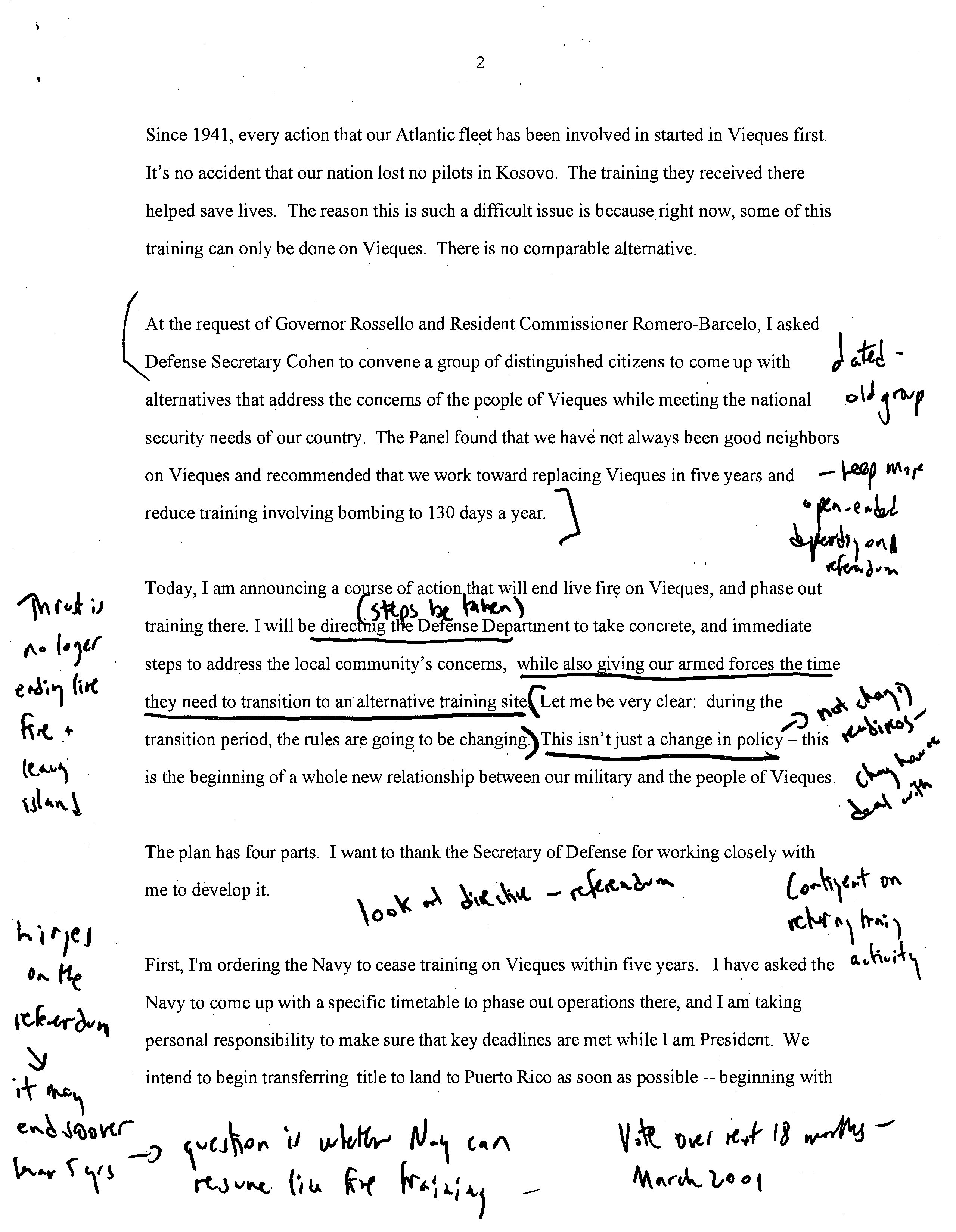 - 2 Since 1941, every action that our Atlantic fleet has been involved in started in Vieques first. It's no accident that our nation lost no pilots in Kosovo. The training they received there helped save lives. The reason this is such a difficult issue is because right now, some of this training can only be done on Vieques. There is no comparable alternative. At the request of Governor Rossello and Resident Commissioner Romero-Barcelo, I asked Defense Secretary Cohen to convene a group of distinguished citizens to come up with alternatives that address the concerns of the people of Vieques while meeting the national security needs of our country. The Panel found that we have not always been good neighbors on Vieques and recommended that we work toward replacing Vieques in five years and reduce training involving bombing to 130 days a year. dated - old group - keep more open-ended - Appendix on a - Freedom Today, I am announcing a course of action that will end live fire on Vieques, and phase out training there. I will be directing the Defense Department to take concrete, and immediate steps to address the local community’s concerns, while also giving our armed forces the time they need to transition to an alternative training site. Let me be very clear: during the transition period, the rules are going to be changing. This isn’t just a change in policy – this is the beginning of a whole new relationship between our military and the people of Vieques. not change - Ventilators - Change - Deal with The plan has four parts. I want to thank the Secretary of Defense for working closely with me to develop it. look at directive - referendum Contingent on releasing training activity First, I’m ordering the Navy to cease training on Vieques within five years. I have asked the Navy to come up with a specific timetable to phase out operations there, and I am taking personal responsibility to make sure that key deadlines are met while I am President. We intend to begin transferring title to land to Puerto Rico as soon as possible -- beginning with guestion is whether Navy can resume life for training Vote over next 18 months – March 2001