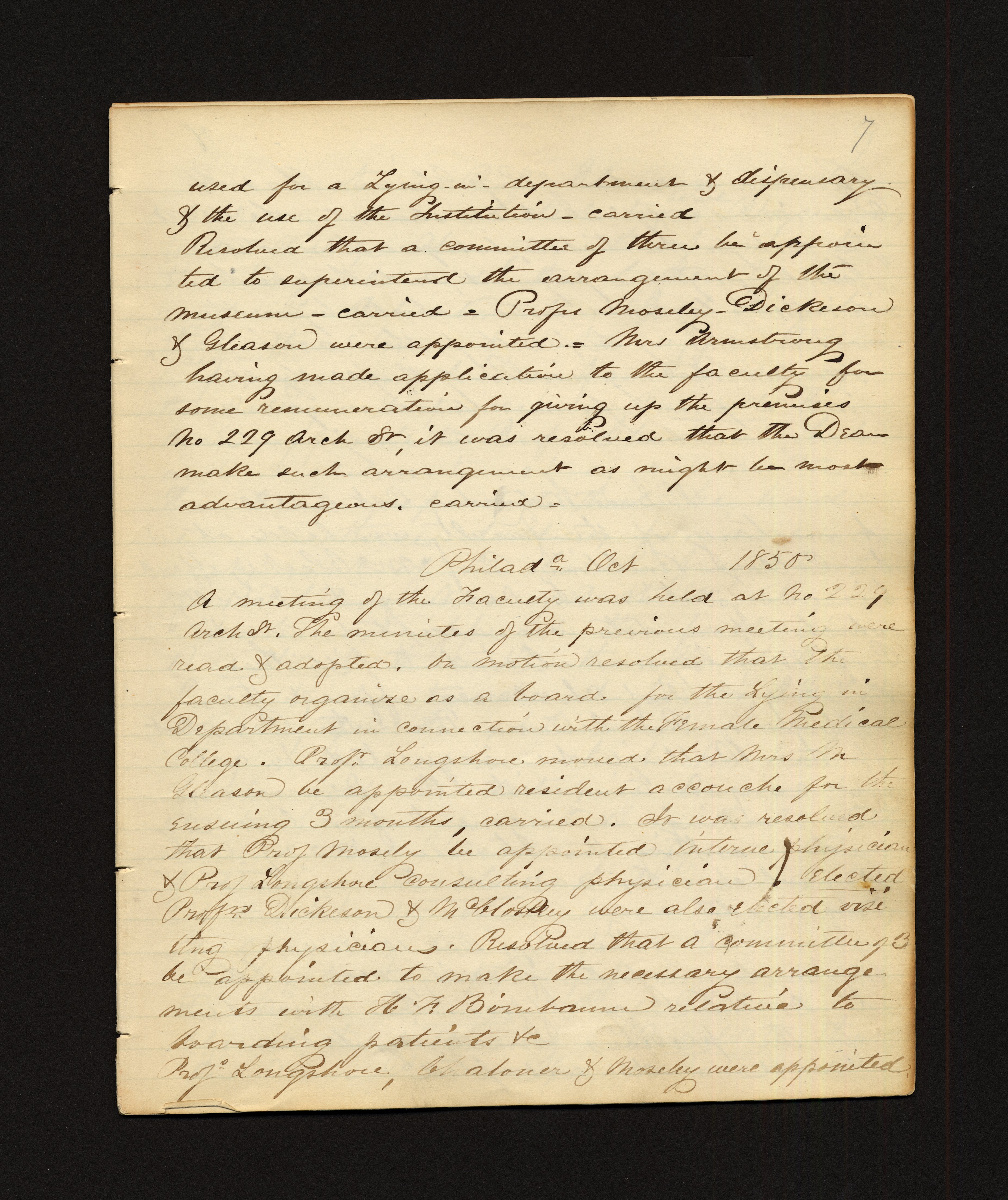 - 7 used for a Lyng. in. department & dispensary & the use of the Institution - carried Resolved that a committee of three be appointed to superintend the arrangement of the museum - carried = Profs. Moseley - Dickeson & Gleason were appointed. Mrs Armstrong having made application to the faculty for some remuneration for giving up the premises No 229 Arch St, it was resolved that the Dear make such arrangement as might be most advantageous, carried. Philada Oct 1850 A meeting of the Faculty was held at No 229 Arch St. The minutes of the previous meeting were read & adopted. On motion resolved that the faculty organize as a board for the Lying in Department in connection with the Female Medical College. Profs. Longshore moved that Mrs M Gleason be appointed resident accouche for the ensuing 3 months, carried. It was resolved that Prof Moseley be appointed Interne physician & Prof Longshore consulting physician. Elected Profs. Dickeson & M. Moseley were also elected visiting physician. Resolved that a committee be appointed to make the necessary arrangements with H. R. Bonbaum relative to boarding patients &c Prof. Longshore, Chaloner & Moseley were appointed