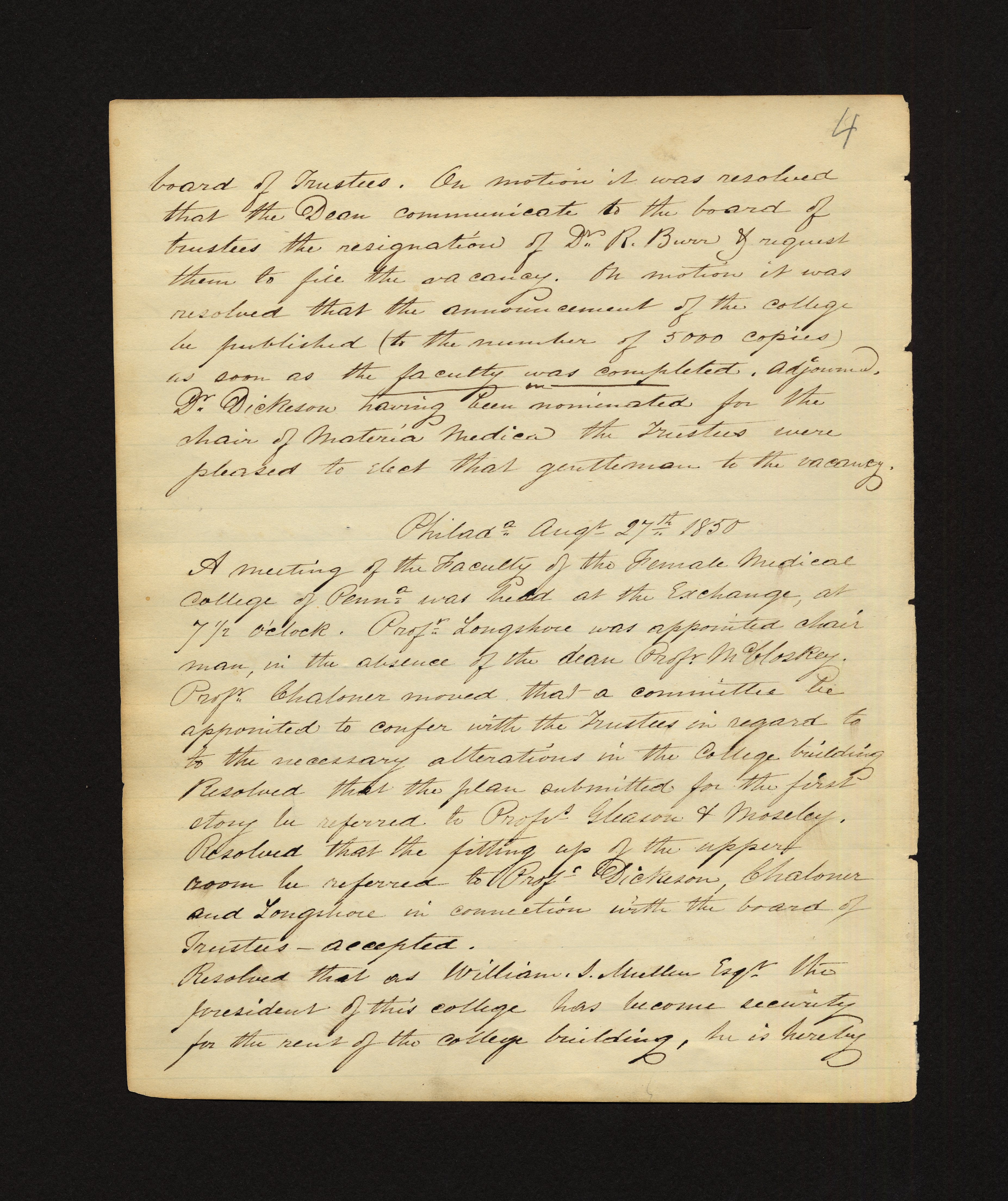 - 4 board of Trustees. On motion it was resolved that the Dean communicate to the board of trustees the resignation of Dr. R. Burr & request them to file the vacancy. On motion it was resolved that the announcement of the college be published (to the number of 5000 copies) as soon as the faculty was completed. Adjourned. Dr. Dickeson having been nominated for the chair of Materia Medica the Trustees were pleased to elect that gentleman to the vacancy. Philada Augt 27th 1850 A meeting of the Faculty of the Female Medical College of Penn was held at the Exchange, at 7 1/2 o'clock. Prof. Longshore was appointed chairman, in the absence of the Dean Prof. McCloskey. Prof. Chaloner moved that a committee be appointed to confer with the Trustees in regard to the necessary alterations in the college building. Resolved that the plan submitted for the first story be referred to Prof. Gleason & Mosely. Resolved that the fitting up of the upper room be referred to Prof. Dickeson, Chaloner and Longshore in connection with the board of Trustees - accepted. Resolved that as William J. Mullen Esq. the president of this college has become security for the rent of the college building, he is hereby