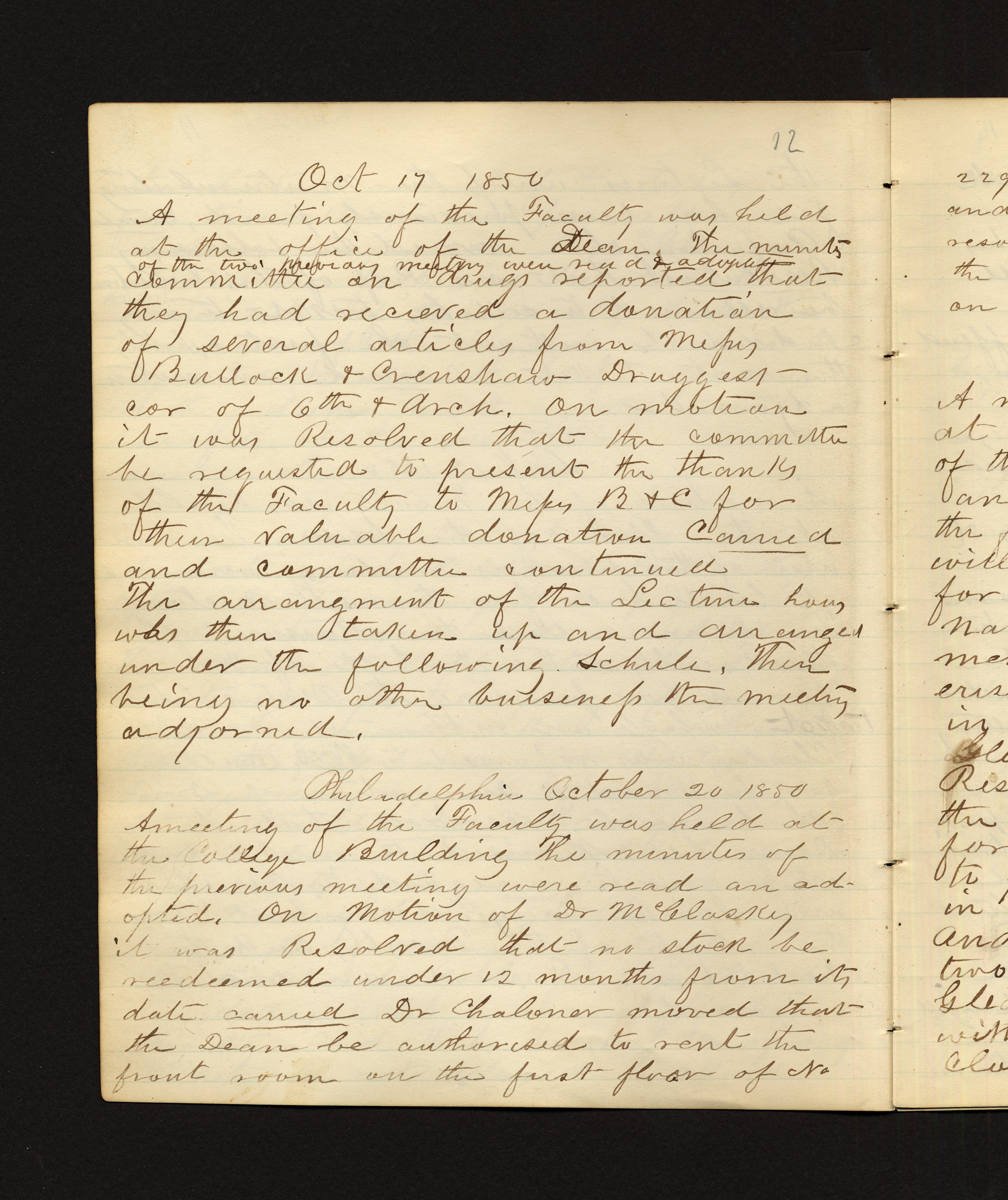 - Oct 17 1850 A meeting of the Faculty was held at the office of the Dean. The minutes of the two previous meetings were read & adopted. Committee on drugs reported that they had received a donation of several articles from Messrs Bullock & Crenshaw Draygess - cor of 6th & Arch. On motion it was resolved that the committee be requested to present the thanks of the Faculty to Messrs B & C for their valuable donation carried and committee continued. The arrangement of the Lecture house was then taken up and arranged under the following. Schule. There being no other business the meeting adjourned. Philadelphia October 20 1850 A meeting of the Faculty was held at the College Building. The minutes of the previous meeting were read and adopted. On motion of Dr McCluskey it was resolved that no stock be redeemed under 12 months from its date carried Dr Chaloner moved that the Dean be authorised to rent the front room on the first floor of No