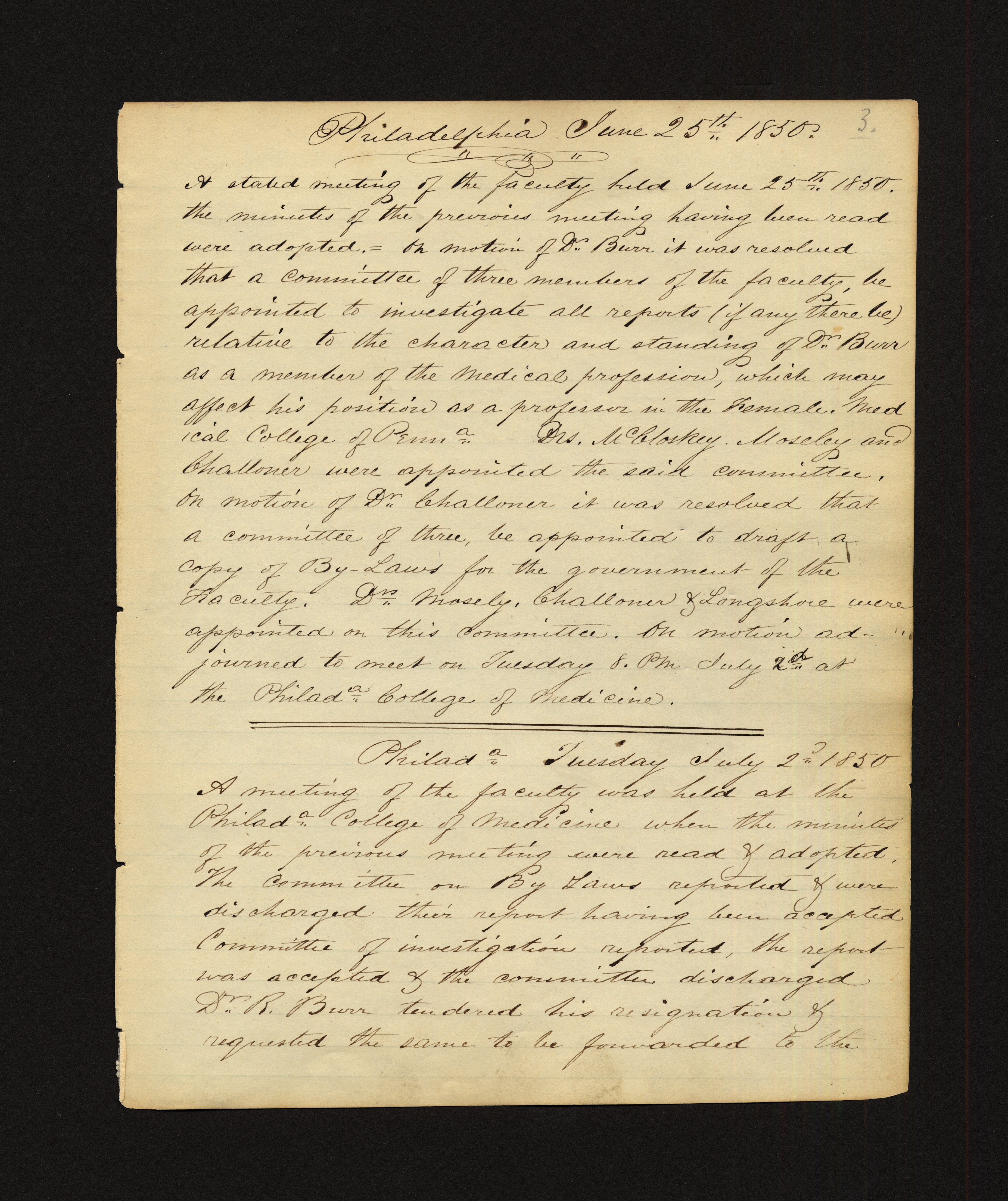 - Philadelphia June 25th 1850. A stated meeting of the faculty held June 25th 1850. The minutes of the previous meeting having been read were adopted. In motion of Dr. Burr it was resolved that a committee of three members of the faculty, be appointed to investigate all reports (if any there be) relative to the character and standing of Dr. Burr as a member of the Medical profession, which may affect his position as a professor in the Female Medical College of Penn. Drs. McCloskey, Moseley and Challoner were appointed the said committee. On motion of Dr. Challoner it was resolved that a committee of three, be appointed to draft a copy of By-Laws for the government of the Faculty. Drs. Moseley, Challoner & Longshore were appointed on this committee. On motion adjourned to meet on Tuesday 8. PM July 2nd at the Philadelphia College of Medicine. Philadelphia Tuesday July 2nd 1850 A meeting of the faculty was held at the Philadelphia College of Medicine when the minutes of the previous meeting were read and adopted. The committee on By-Laws reported and were discharged. Their report having been accepted. Committee of investigation reported, the report was accepted and the committee discharged. Dr. R. Burr tendered his resignation and requested the same to be forwarded to the