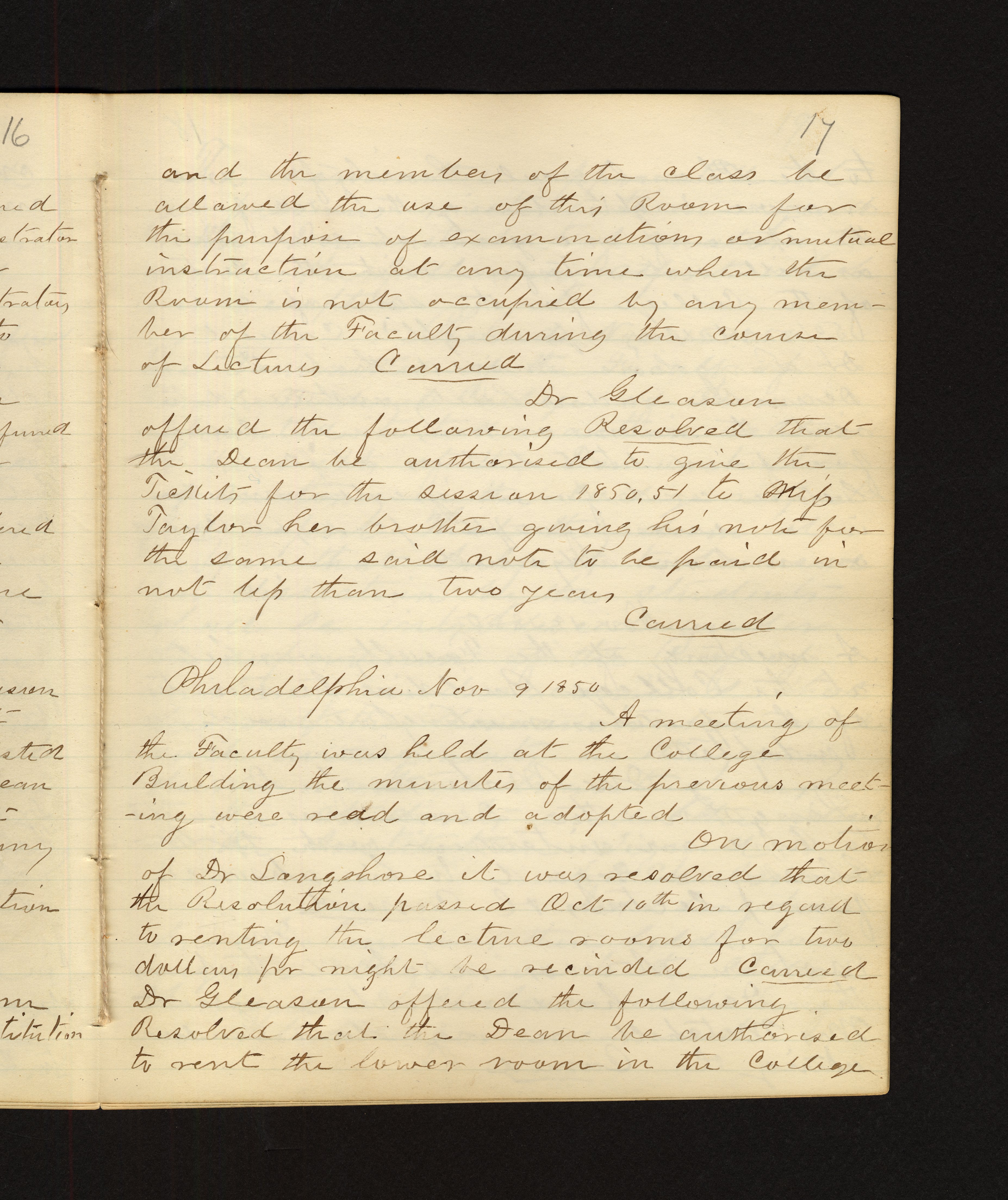 - 17 and the members of the class be allowed the use of this Room for the purpose of examinations or mutual instruction at any time when the Room is not occupied by any member of the Faculty during the course of Lectures. Carried Dr Gleason offered the following Resolved that the Dean be authorised to give the Tickets for the session 1850, 51 to Miss Taylor her brother giving his note for the same said note to be paid in not less than two years Carried Philadelphia Nov 9 1850 A meeting of the Faculty was held at the College Building the minutes of the previous meeting were read and adopted On motion of Dr Langshore it was resolved that the Resolution passed Oct 10th in regard to renting the lecture rooms for two dollars for night be recinded. Carried Dr Gleason offered the following Resolved that the Dean be authorised to rent the lower room in the College