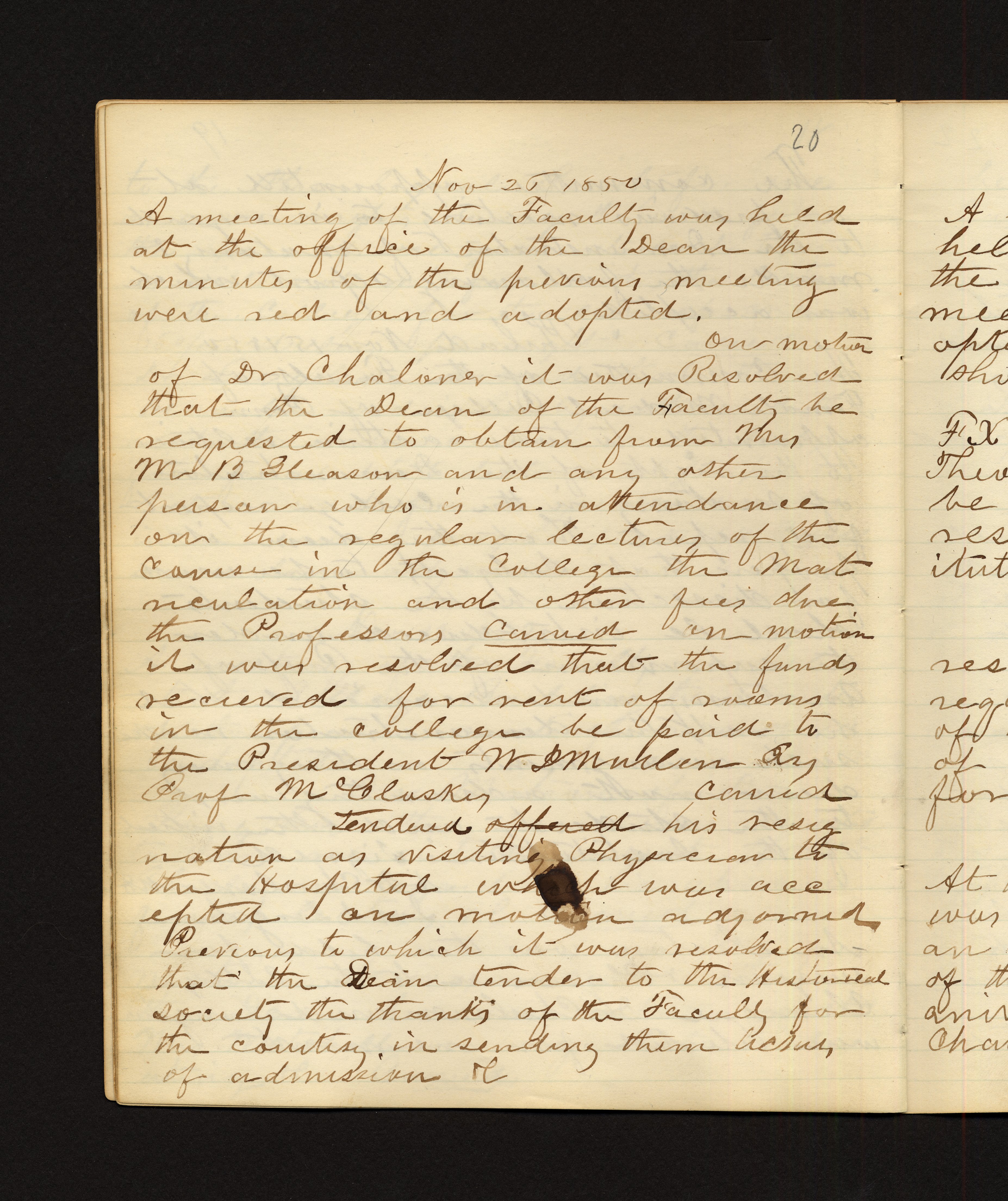 - 20 Nov 26 1850 A meeting of the Faculty was held at the office of the Dean the minutes of the previous meeting were red and adopted. On motion of Dr. Chaloner it was Resolved that the Dean of the Faculty be requested to obtain from Mrs. M B Gleason and any other person who is in attendance on the regular lectures of the course in the College the Mat. reculation and other fees due the Professors carried on motion it was resolved that the funds received for rent of rooms in the College be paid to the President W D Mullen Esq Prof McCluskey Carrie Tendered his resignation as visiting Physician to the Hospital which was accepted on motion adjourned. Previous to which it was resolved that the Dean tender to the Historical Society the thanks of the Faculty for the courtesy in sending them a copy of admission &c
