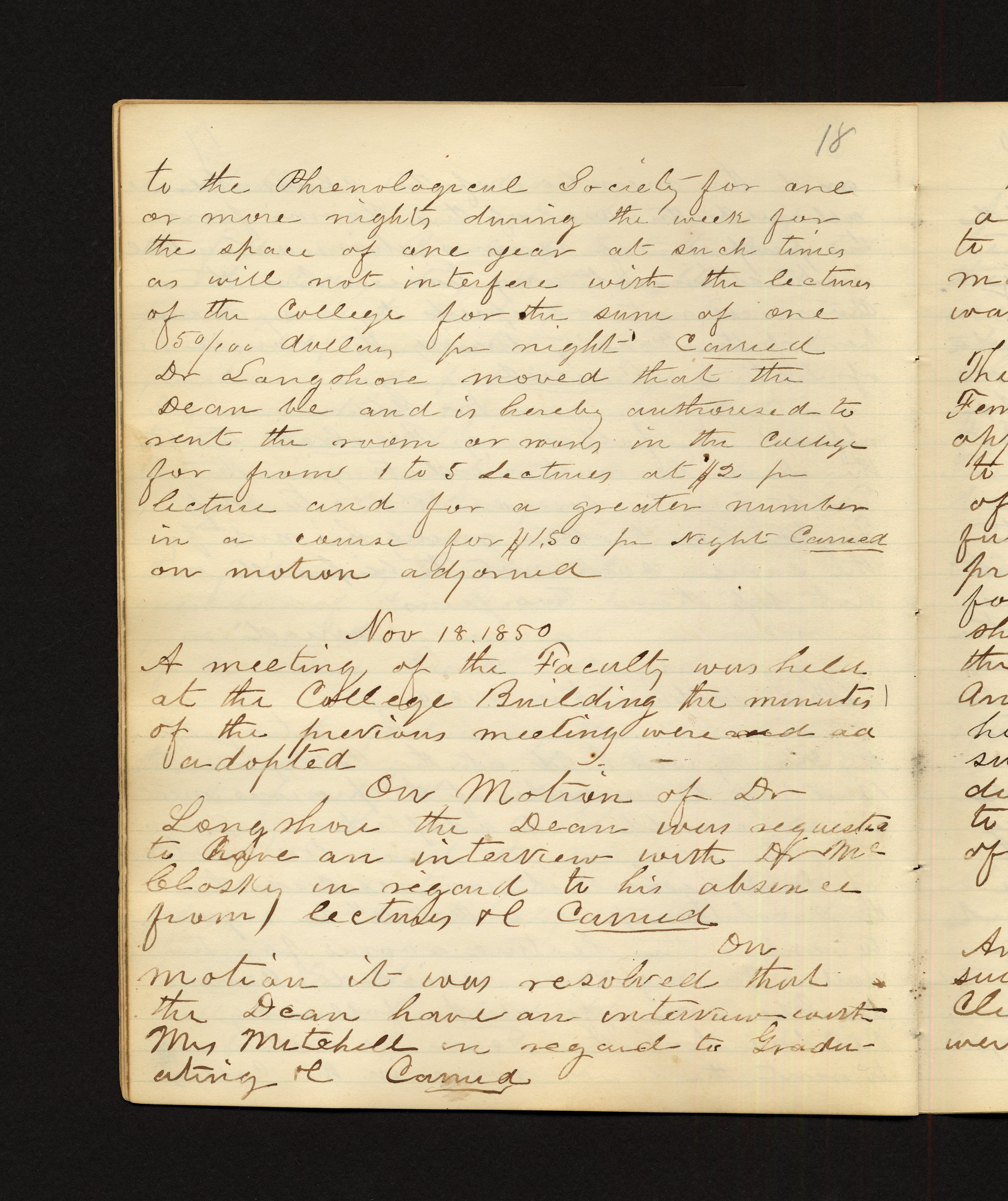 - 18 to the Phenological Society for one or more nights during the week for the space of one year at such times as will not interfere with the lectures of the College for the sum of one 50/100 dollars per night. Carried Dr Langshore moved that the Dean be and is hereby authorized to rent the room or rooms in the College for from 1 to 5 lectures at $12 per lecture and for a greater number in a course for $1.50 per night. Carried on motion adjourned. Nov 18, 1850 A meeting of the Faculty was held at the College Building, the minutes of the previous meeting were adopted. On motion of Dr. Langshore the Dean was requested to have an interview with Dr. McClosky in regard to his absence from lectures. Carried. On motion it was resolved that the Dean have an interview with Mrs. Mitchell in regard to Graduating. Carried.