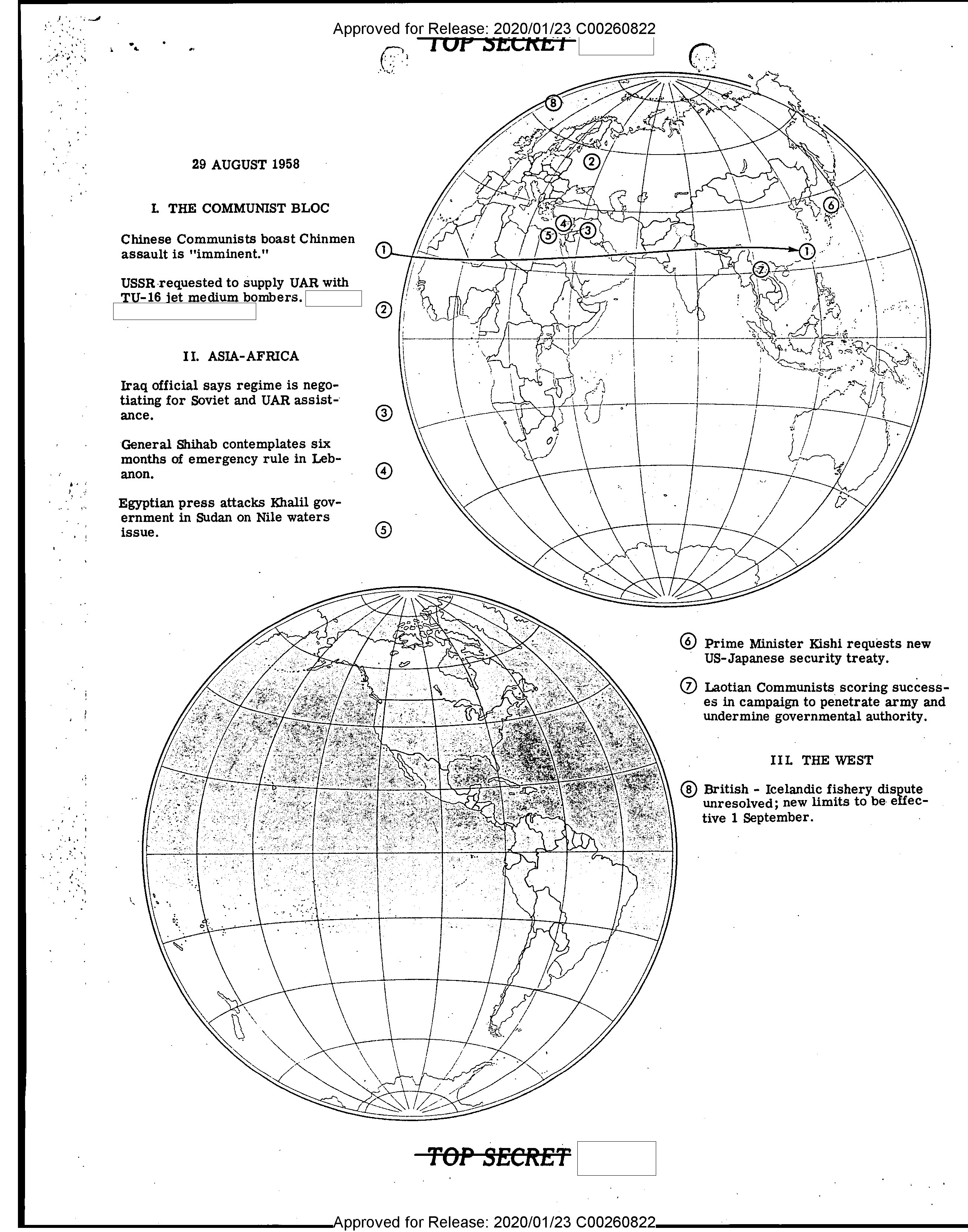 - Approved for Release: 2020/01/23 C00260822 TOP SECRET 29 AUGUST 1958 ## I. THE COMMUNIST BLOC Chinese Communists boast Chinmen assault is "imminent." USSR requested to supply UAR with TU-16 jet medium bombers. ## II. ASIA-AFRICA Iraq official says regime is negotiating for Soviet and UAR assistance. General Shihab contemplates six months of emergency rule in Lebanon. Egyptian press attacks Khalil government in Sudan on Nile waters issue.   - 6 Prime Minister Kishi requests new US-Japanese security treaty. - 7 Laotian Communists scoring successes in campaign to penetrate army and undermine governmental authority. ## III. THE WEST - 8 British - Icelandic fishery dispute unresolved; new limits to be effective 1 September. TOP SECRET Approved for Release: 2020/01/23 C00260822