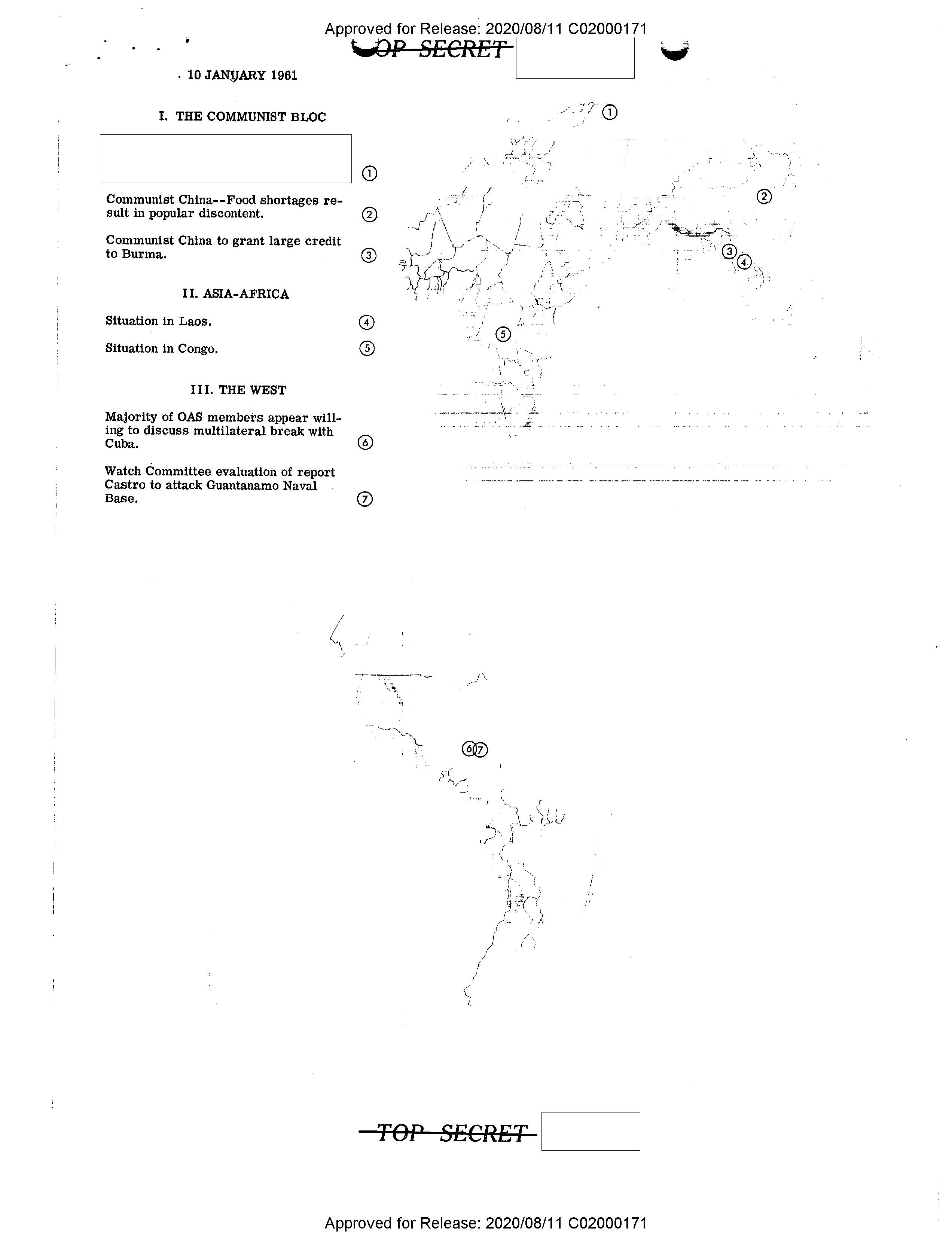 - Approved for Release: 2020/08/11 C02000171 OP SECRET 10 JANUARY 1961 # I. THE COMMUNIST BLOC Communist China--Food shortages result in popular discontent. ② Communist China to grant large credit to Burma. ③ # II. ASIA-AFRICA Situation in Laos. ④ Situation in Congo. ⑤ # III. THE WEST Majority of OAS members appear willing to discuss multilateral break with Cuba. ⑥ Watch Committee evaluation of report Castro to attack Guantanamo Naval Base. ⑦   TOP SECRET Approved for Release: 2020/08/11 C02000171