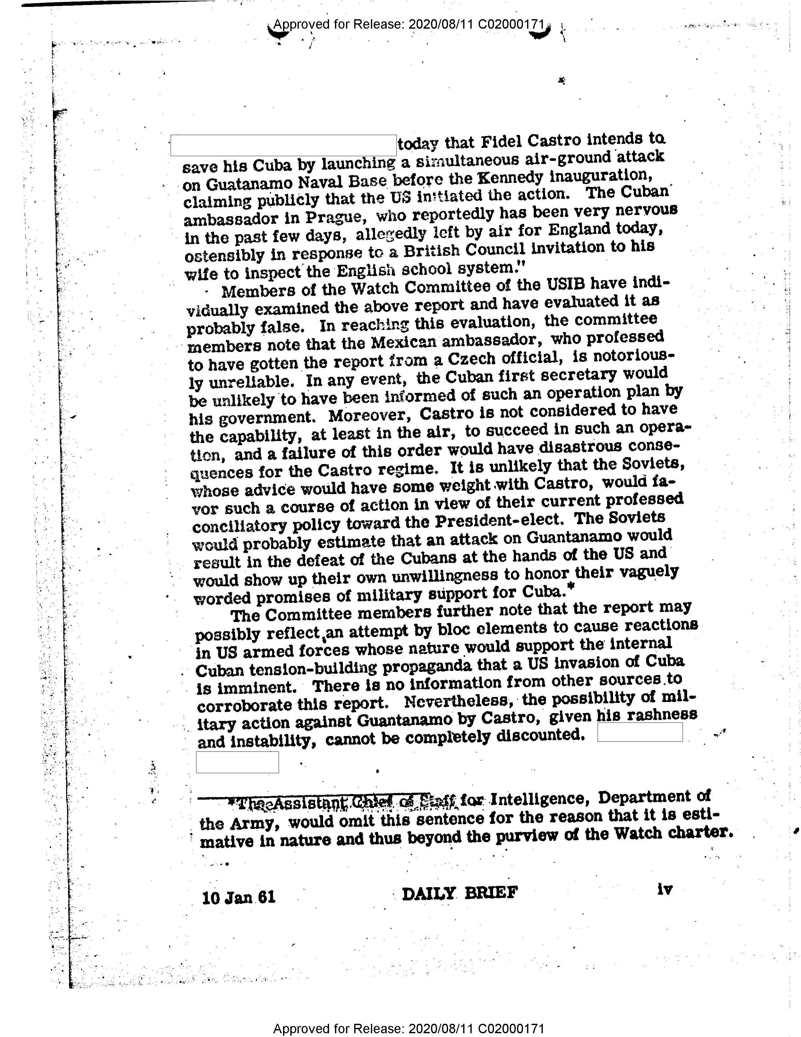 - Approved for Release: 2020/08/11 C02000171 today that Fidel Castro intends to save his Cuba by launching a simultaneous air-ground attack on Guatanamo Naval Base before the Kennedy inauguration, claiming publicly that the US initiated the action. The Cuban ambassador in Prague, who reportedly has been very nervous in the past few days, allegedly left by air for England today, ostensibly in response to a British Council invitation to his wife to inspect the English school system." Members of the Watch Committee of the USIB have individually examined the above report and have evaluated it as probably false. In reaching this evaluation, the committee members note that the Mexican ambassador, who professed to have gotten the report from a Czech official, is notoriously unreliable. In any event, the Cuban first secretary would be unlikely to have been informed of such an operation plan by his government. Moreover, Castro is not considered to have the capability, at least in the air, to succeed in such an operation, and a failure of this order would have disastrous consequences for the Castro regime. It is unlikely that the Soviets, whose advice would have some weight with Castro, would favor such a course of action in view of their current professed conciliatory policy toward the President-elect. The Soviets would probably estimate that an attack on Guantanamo would result in the defeat of the Cubans at the hands of the US and would show up their own unwillingness to honor their vaguely worded promises of military support for Cuba.* The Committee members further note that the report may possibly reflect an attempt by bloc elements to cause reactions in US armed forces whose nature would support the internal Cuban tension-building propaganda that a US invasion of Cuba is imminent. There is no information from other sources to corroborate this report. Nevertheless, the possibility of military action against Guantanamo by Castro, given his rashness and instability, cannot be completely discounted. *The Assistant Chief of Staff for Intelligence, Department of the Army, would omit this sentence for the reason that it is estimative in nature and thus beyond the purview of the Watch charter. 10 Jan 61 DAILY BRIEF iv Approved for Release: 2020/08/11 C02000171