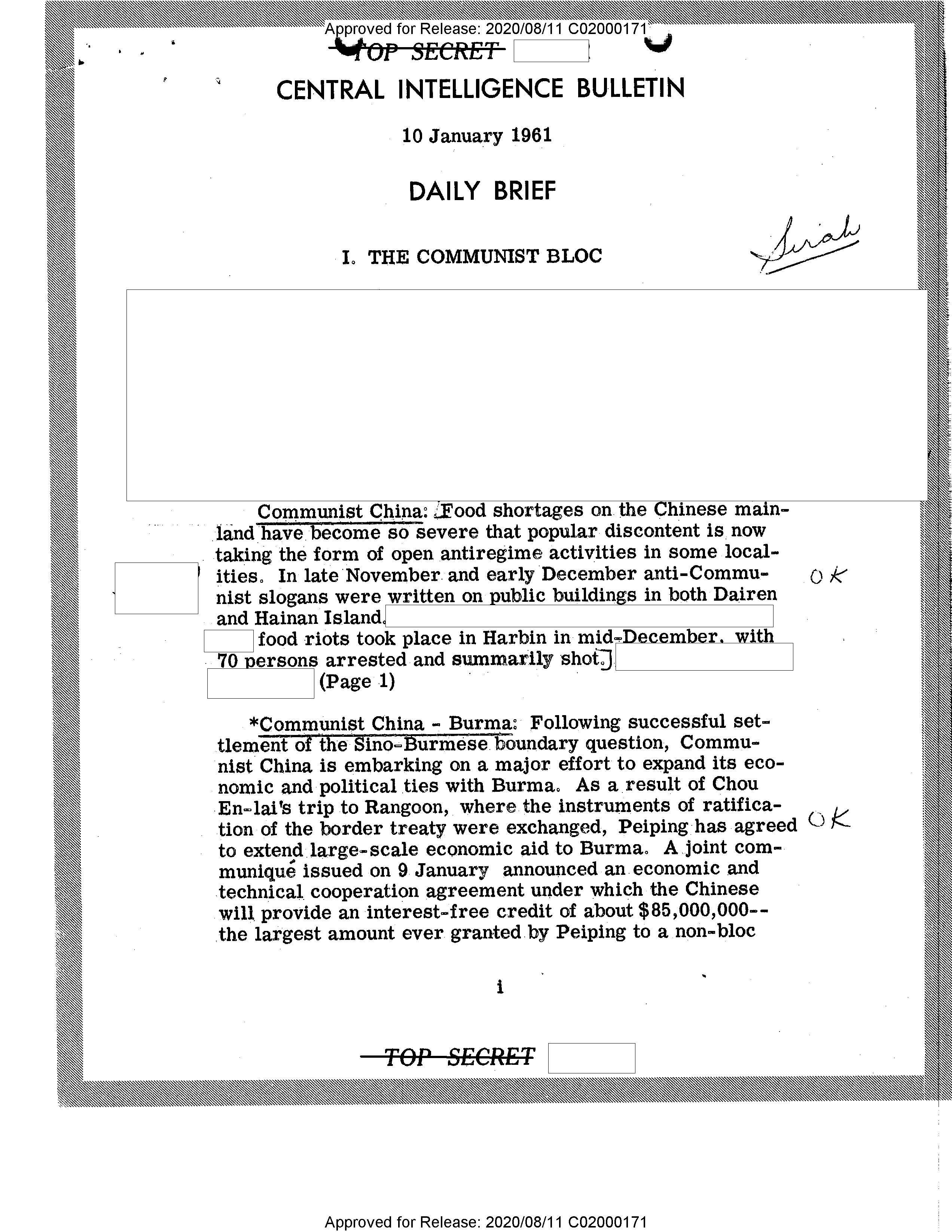 - Approved for Release: 2020/08/11 C02000171 TOP SECRET # CENTRAL INTELLIGENCE BULLETIN 10 January 1961 DAILY BRIEF I. THE COMMUNIST BLOC  Communist China: Food shortages on the Chinese mainland have become so severe that popular discontent is now taking the form of open antiregime activities in some localities. In late November and early December anti-Communist slogans were written on public buildings in both Dairen and Hainan Island. food riots took place in Harbin in mid-December, with 70 persons arrested and summarily shot. (Page 1) *Communist China - Burma: Following successful settlement of the Sino-Burmese boundary question, Communist China is embarking on a major effort to expand its economic and political ties with Burma. As a result of Chou En-lai's trip to Rangoon, where the instruments of ratification of the border treaty were exchanged, Peiping has agreed to extend large-scale economic aid to Burma. A joint communiqué issued on 9 January announced an economic and technical cooperation agreement under which the Chinese will provide an interest-free credit of about $85,000,000-- the largest amount ever granted by Peiping to a non-bloc i TOP SECRET Approved for Release: 2020/08/11 C02000171
