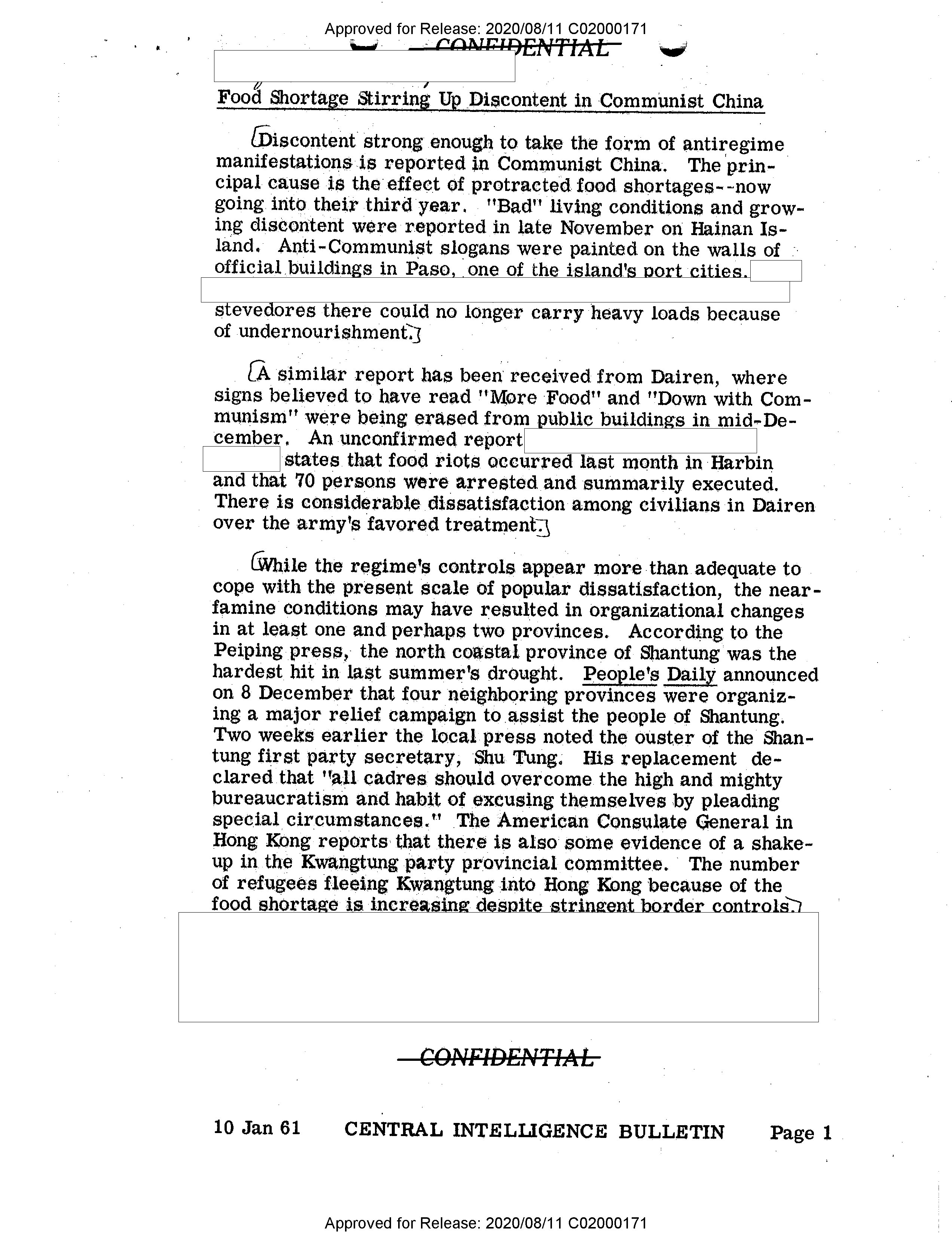 - Approved for Release: 2020/08/11 C02000171 CONFIDENTIAL # Food Shortage Stirring Up Discontent in Communist China Discontent strong enough to take the form of antiregime manifestations is reported in Communist China. The principal cause is the effect of protracted food shortages--now going into their third year. "Bad" living conditions and growing discontent were reported in late November on Hainan Island. Anti-Communist slogans were painted on the walls of official buildings in Paso, one of the island's port cities. stevedores there could no longer carry heavy loads because of undernourishment. A similar report has been received from Dairen, where signs believed to have read "More Food" and "Down with Communism" were being erased from public buildings in mid-December. An unconfirmed report states that food riots occurred last month in Harbin and that 70 persons were arrested and summarily executed. There is considerable dissatisfaction among civilians in Dairen over the army's favored treatment. While the regime's controls appear more than adequate to cope with the present scale of popular dissatisfaction, the near-famine conditions may have resulted in organizational changes in at least one and perhaps two provinces. According to the Peiping press, the north coastal province of Shantung was the hardest hit in last summer's drought. People's Daily announced on 8 December that four neighboring provinces were organizing a major relief campaign to assist the people of Shantung. Two weeks earlier the local press noted the ouster of the Shantung first party secretary, Shu Tung. His replacement declared that "all cadres should overcome the high and mighty bureaucratism and habit of excusing themselves by pleading special circumstances." The American Consulate General in Hong Kong reports that there is also some evidence of a shake-up in the Kwangtung party provincial committee. The number of refugees fleeing Kwangtung into Hong Kong because of the food shortage is increasing despite stringent border controls. CONFIDENTIAL 10 Jan 61 CENTRAL INTELLIGENCE BULLETIN Page 1 Approved for Release: 2020/08/11 C02000171