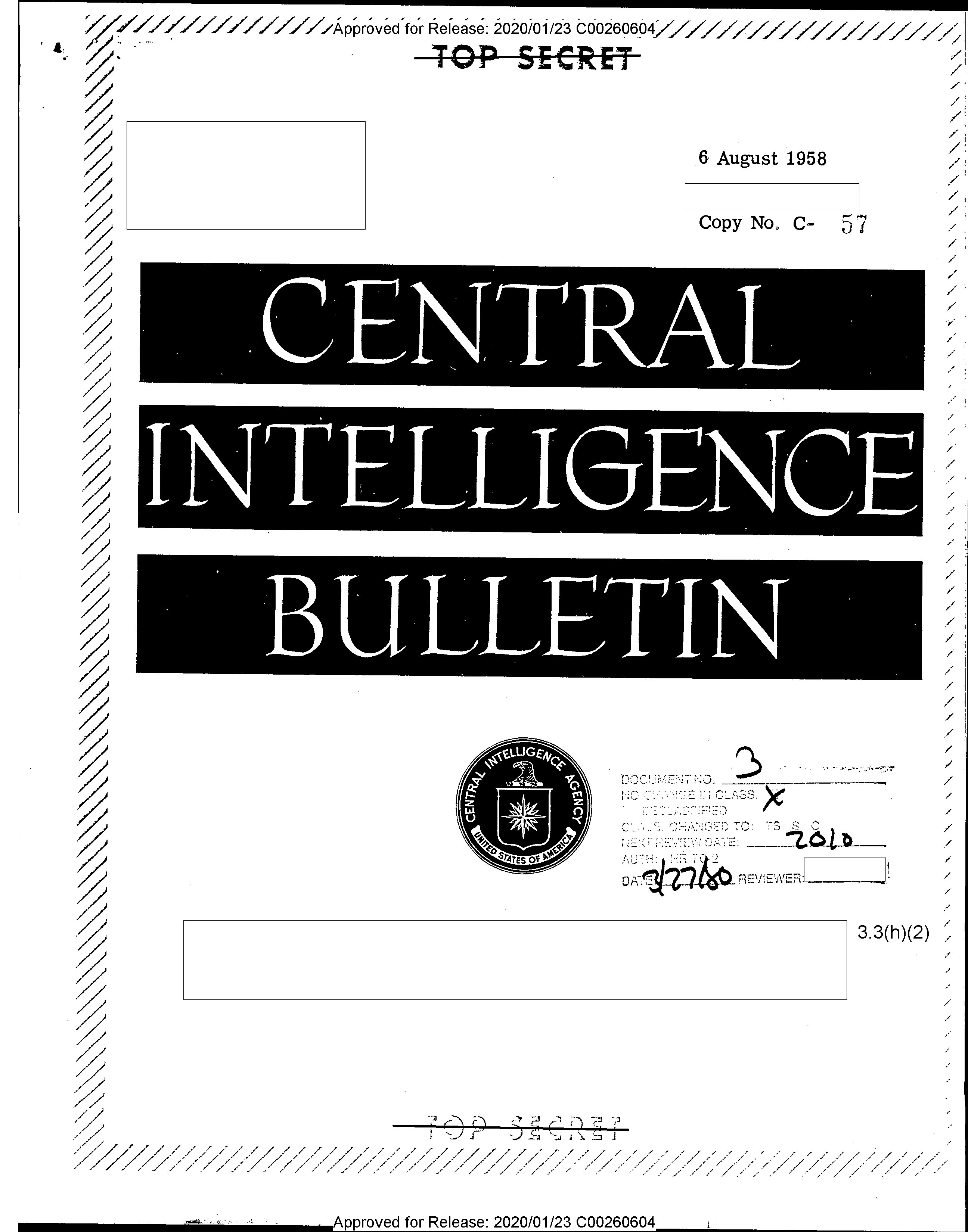 - Approved for Release: 2020/01/23 C00260604 TOP SECRET 6 August 1958 Copy No. C- 57 # CENTRAL INTELLIGENCE BULLETIN  DOCUMENT NO. 3 NO CHANGE IN CLASS. X ESTABLISHED CLASS. CHANGED TO: TS S C NEXT REVIEW DATE: 2010 AUTH: HR 70-2 DATE: 3/27/80 REVIEWER: 3.3(h)(2) TOP SECRET Approved for Release: 2020/01/23 C00260604