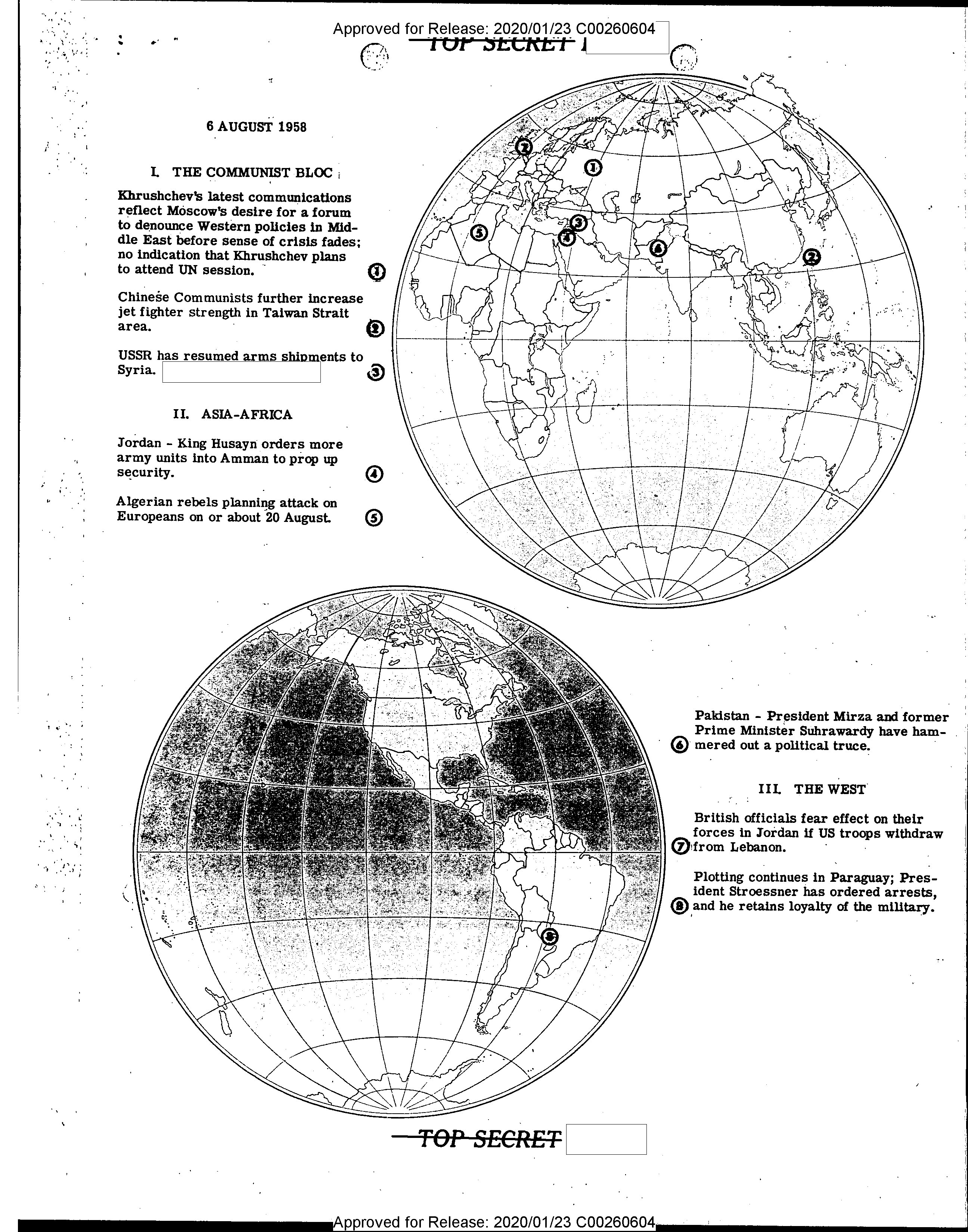 - Approved for Release: 2020/01/23 C00260604 TOP SECRET 6 AUGUST 1958 I. THE COMMUNIST BLOC Khrushchev's latest communications reflect Moscow's desire for a forum to denounce Western policies in Middle East before sense of crisis fades; no indication that Khrushchev plans to attend UN session. Chinese Communists further increase jet fighter strength in Taiwan Strait area. USSR has resumed arms shipments to Syria. II. ASIA-AFRICA Jordan - King Husayn orders more army units into Amman to prop up security. Algerian rebels planning attack on Europeans on or about 20 August.   Pakistan - President Mirza and former Prime Minister Suhrawardy have hammered out a political truce. III. THE WEST British officials fear effect on their forces in Jordan if US troops withdraw from Lebanon. Plotting continues in Paraguay; President Stroessner has ordered arrests, and he retains loyalty of the military. Approved for Release: 2020/01/23 C00260604