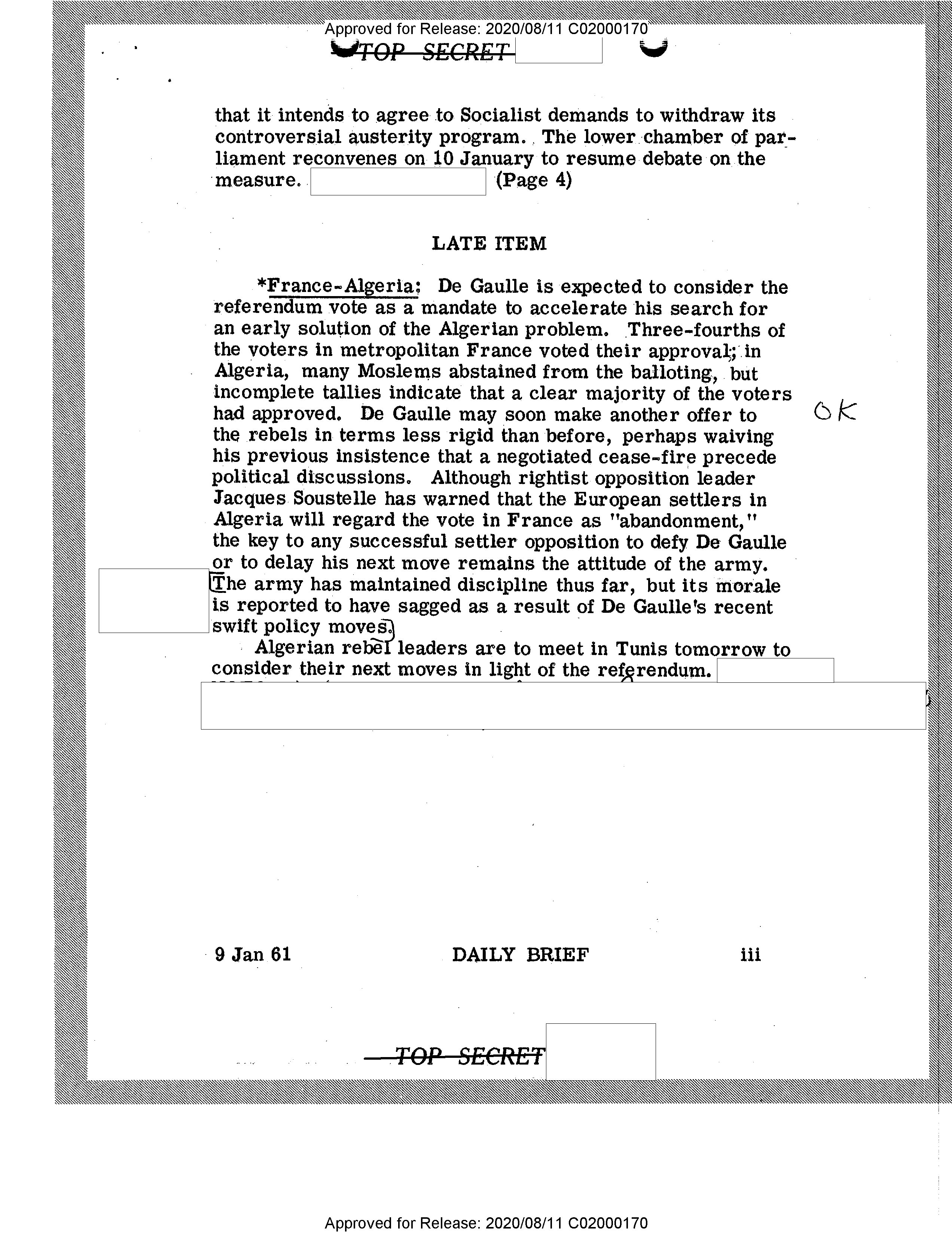 - Approved for Release: 2020/08/11 C02000170 TOP SECRET that it intends to agree to Socialist demands to withdraw its controversial austerity program. The lower chamber of parliament reconvenes on 10 January to resume debate on the measure. (Page 4) LATE ITEM *France-Algeria: De Gaulle is expected to consider the referendum vote as a mandate to accelerate his search for an early solution of the Algerian problem. Three-fourths of the voters in metropolitan France voted their approval; in Algeria, many Moslems abstained from the balloting, but incomplete tallies indicate that a clear majority of the voters had approved. De Gaulle may soon make another offer to the rebels in terms less rigid than before, perhaps waiving his previous insistence that a negotiated cease-fire precede political discussions. Although rightist opposition leader Jacques Soustelle has warned that the European settlers in Algeria will regard the vote in France as "abandonment," the key to any successful settler opposition to defy De Gaulle or to delay his next move remains the attitude of the army. The army has maintained discipline thus far, but its morale is reported to have sagged as a result of De Gaulle's recent swift policy moves. Algerian rebel leaders are to meet in Tunis tomorrow to consider their next moves in light of the referendum. OK 9 Jan 61 DAILY BRIEF iii TOP SECRET Approved for Release: 2020/08/11 C02000170
