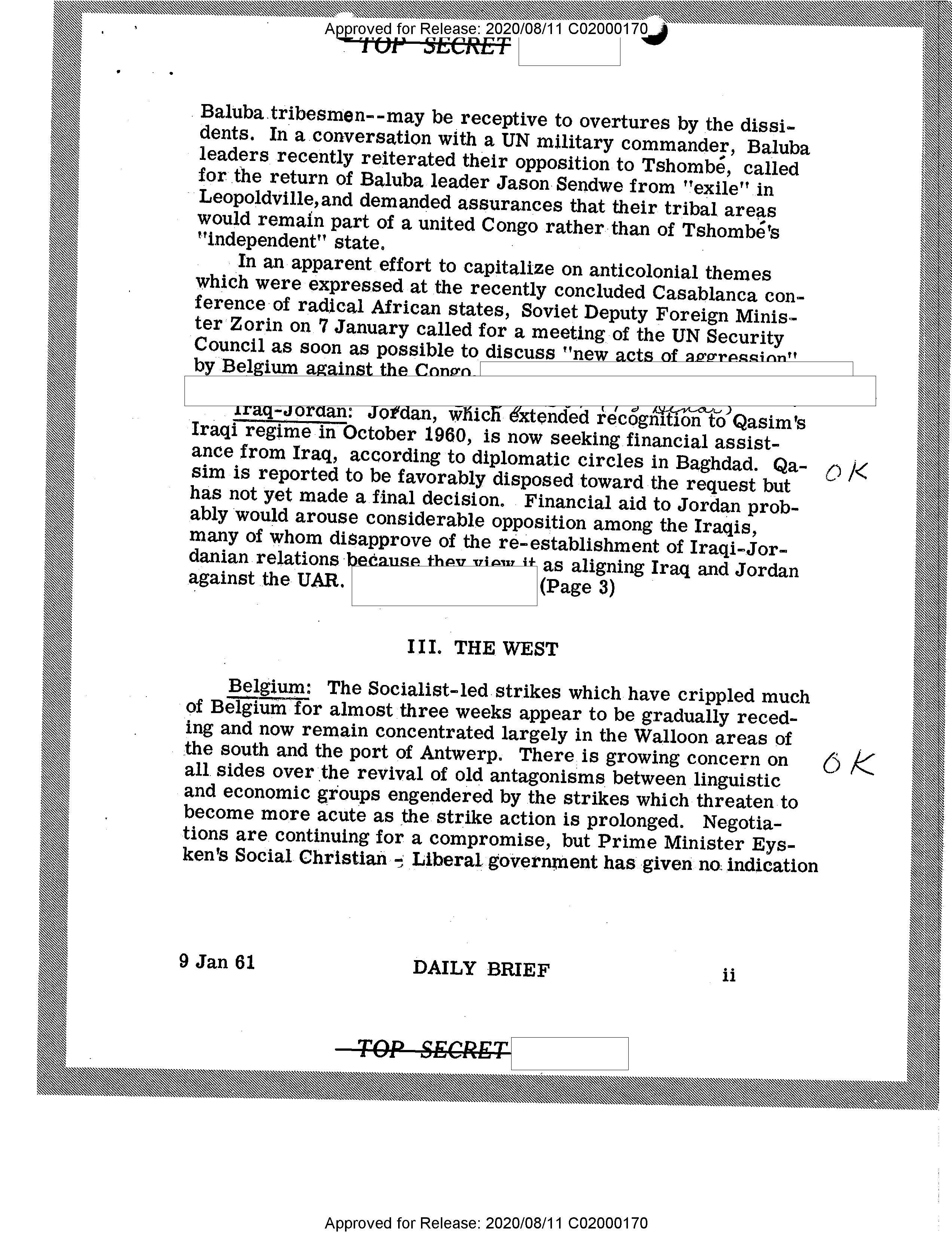 - Approved for Release: 2020/08/11 C02000170 Baluba tribesmen--may be receptive to overtures by the dissidents. In a conversation with a UN military commander, Baluba leaders recently reiterated their opposition to Tshombé, called for the return of Baluba leader Jason Sendwe from "exile" in Leopoldville, and demanded assurances that their tribal areas would remain part of a united Congo rather than of Tshombé's "independent" state. In an apparent effort to capitalize on anticolonial themes which were expressed at the recently concluded Casablanca conference of radical African states, Soviet Deputy Foreign Minister Zorin on 7 January called for a meeting of the UN Security Council as soon as possible to discuss "new acts of aggression" by Belgium against the Congo. Iraq-Jordan: Jordan, which extended recognition to Qasim's Iraqi regime in October 1960, is now seeking financial assistance from Iraq, according to diplomatic circles in Baghdad. Qasim is reported to be favorably disposed toward the request but has not yet made a final decision. Financial aid to Jordan probably would arouse considerable opposition among the Iraqis, many of whom disapprove of the re-establishment of Iraqi-Jordanian relations because they view it as aligning Iraq and Jordan against the UAR. (Page 3) III. THE WEST Belgium: The Socialist-led strikes which have crippled much of Belgium for almost three weeks appear to be gradually receding and now remain concentrated largely in the Walloon areas of the south and the port of Antwerp. There is growing concern on all sides over the revival of old antagonisms between linguistic and economic groups engendered by the strikes which threaten to become more acute as the strike action is prolonged. Negotiations are continuing for a compromise, but Prime Minister Eysken's Social Christian - Liberal government has given no indication 9 Jan 61 DAILY BRIEF ii Approved for Release: 2020/08/11 C02000170