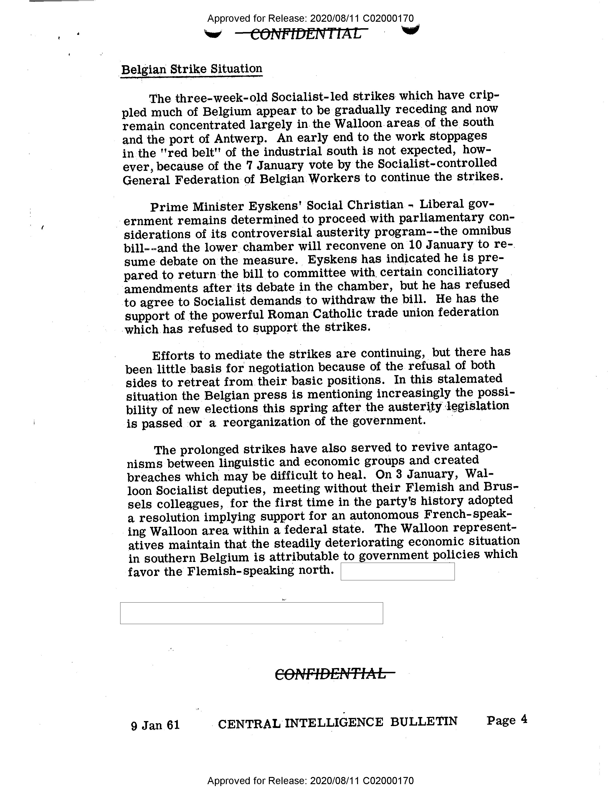 - Approved for Release: 2020/08/11 C02000170 CONFIDENTIAL # Belgian Strike Situation The three-week-old Socialist-led strikes which have crippled much of Belgium appear to be gradually receding and now remain concentrated largely in the Walloon areas of the south and the port of Antwerp. An early end to the work stoppages in the "red belt" of the industrial south is not expected, however, because of the 7 January vote by the Socialist-controlled General Federation of Belgian Workers to continue the strikes. Prime Minister Eyskens' Social Christian - Liberal government remains determined to proceed with parliamentary considerations of its controversial austerity program--the omnibus bill--and the lower chamber will reconvene on 10 January to resume debate on the measure. Eyskens has indicated he is prepared to return the bill to committee with certain conciliatory amendments after its debate in the chamber, but he has refused to agree to Socialist demands to withdraw the bill. He has the support of the powerful Roman Catholic trade union federation which has refused to support the strikes. Efforts to mediate the strikes are continuing, but there has been little basis for negotiation because of the refusal of both sides to retreat from their basic positions. In this stalemated situation the Belgian press is mentioning increasingly the possibility of new elections this spring after the austerity legislation is passed or a reorganization of the government. The prolonged strikes have also served to revive antagonisms between linguistic and economic groups and created breaches which may be difficult to heal. On 3 January, Walloon Socialist deputies, meeting without their Flemish and Brussels colleagues, for the first time in the party's history adopted a resolution implying support for an autonomous French-speaking Walloon area within a federal state. The Walloon representatives maintain that the steadily deteriorating economic situation in southern Belgium is attributable to government policies which favor the Flemish-speaking north. CONFIDENTIAL 9 Jan 61 CENTRAL INTELLIGENCE BULLETIN Page 4 Approved for Release: 2020/08/11 C02000170