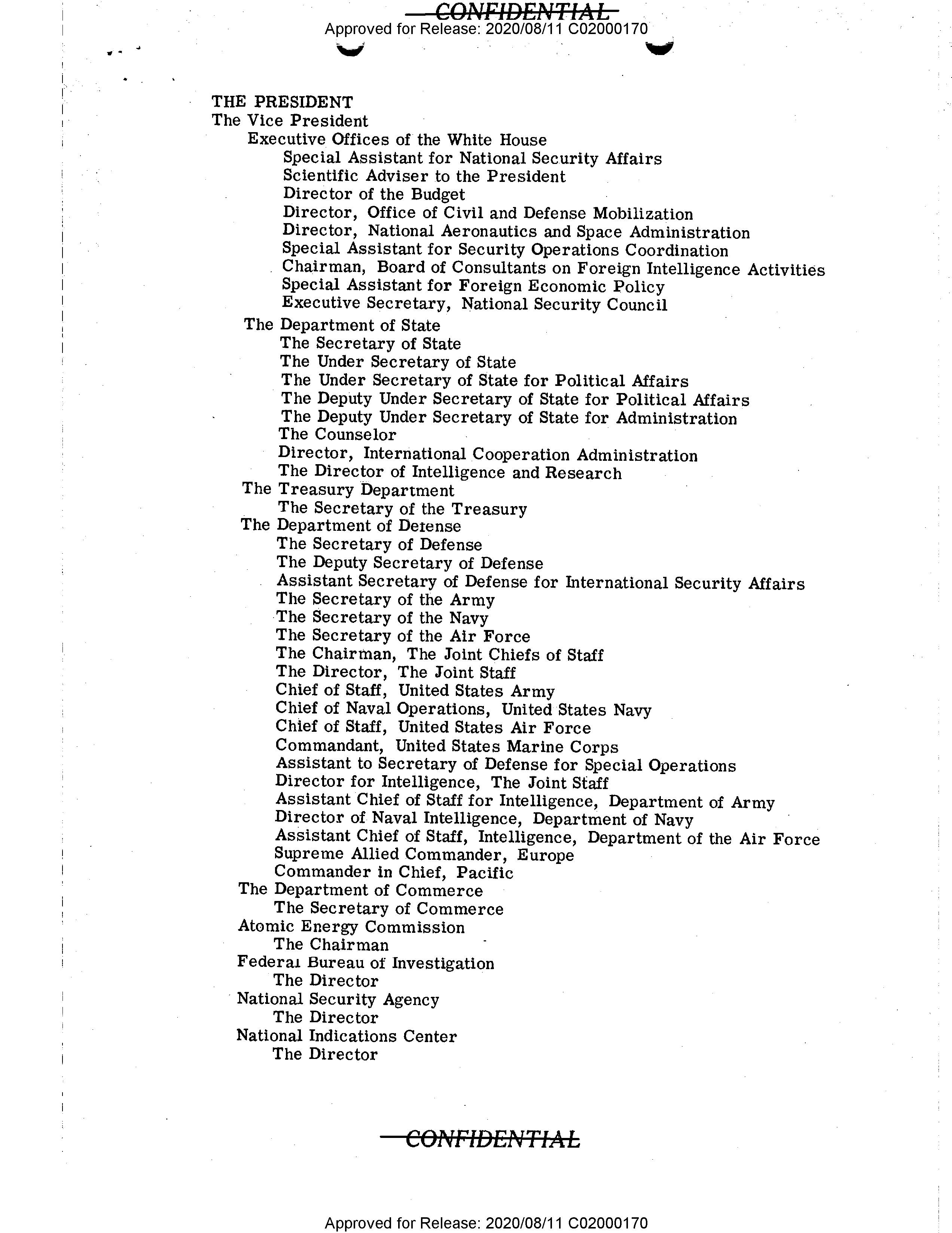 - CONFIDENTIAL Approved for Release: 2020/08/11 C02000170 # THE PRESIDENT ## The Vice President ### Executive Offices of the White House - Special Assistant for National Security Affairs - Scientific Adviser to the President - Director of the Budget - Director, Office of Civil and Defense Mobilization - Director, National Aeronautics and Space Administration - Special Assistant for Security Operations Coordination - Chairman, Board of Consultants on Foreign Intelligence Activities - Special Assistant for Foreign Economic Policy - Executive Secretary, National Security Council ## The Department of State - The Secretary of State - The Under Secretary of State - The Under Secretary of State for Political Affairs - The Deputy Under Secretary of State for Political Affairs - The Deputy Under Secretary of State for Administration - The Counselor - Director, International Cooperation Administration - The Director of Intelligence and Research ## The Treasury Department - The Secretary of the Treasury ## The Department of Defense - The Secretary of Defense - The Deputy Secretary of Defense - Assistant Secretary of Defense for International Security Affairs - The Secretary of the Army - The Secretary of the Navy - The Secretary of the Air Force - The Chairman, The Joint Chiefs of Staff - The Director, The Joint Staff - Chief of Staff, United States Army - Chief of Naval Operations, United States Navy - Chief of Staff, United States Air Force - Commandant, United States Marine Corps - Assistant to Secretary of Defense for Special Operations - Director for Intelligence, The Joint Staff - Assistant Chief of Staff for Intelligence, Department of Army - Director of Naval Intelligence, Department of Navy - Assistant Chief of Staff, Intelligence, Department of the Air Force - Supreme Allied Commander, Europe - Commander in Chief, Pacific ## The Department of Commerce - The Secretary of Commerce ## Atomic Energy Commission - The Chairman ## Federal Bureau of Investigation - The Director ## National Security Agency - The Director ## National Indications Center - The Director CONFIDENTIAL Approved for Release: 2020/08/11 C02000170
