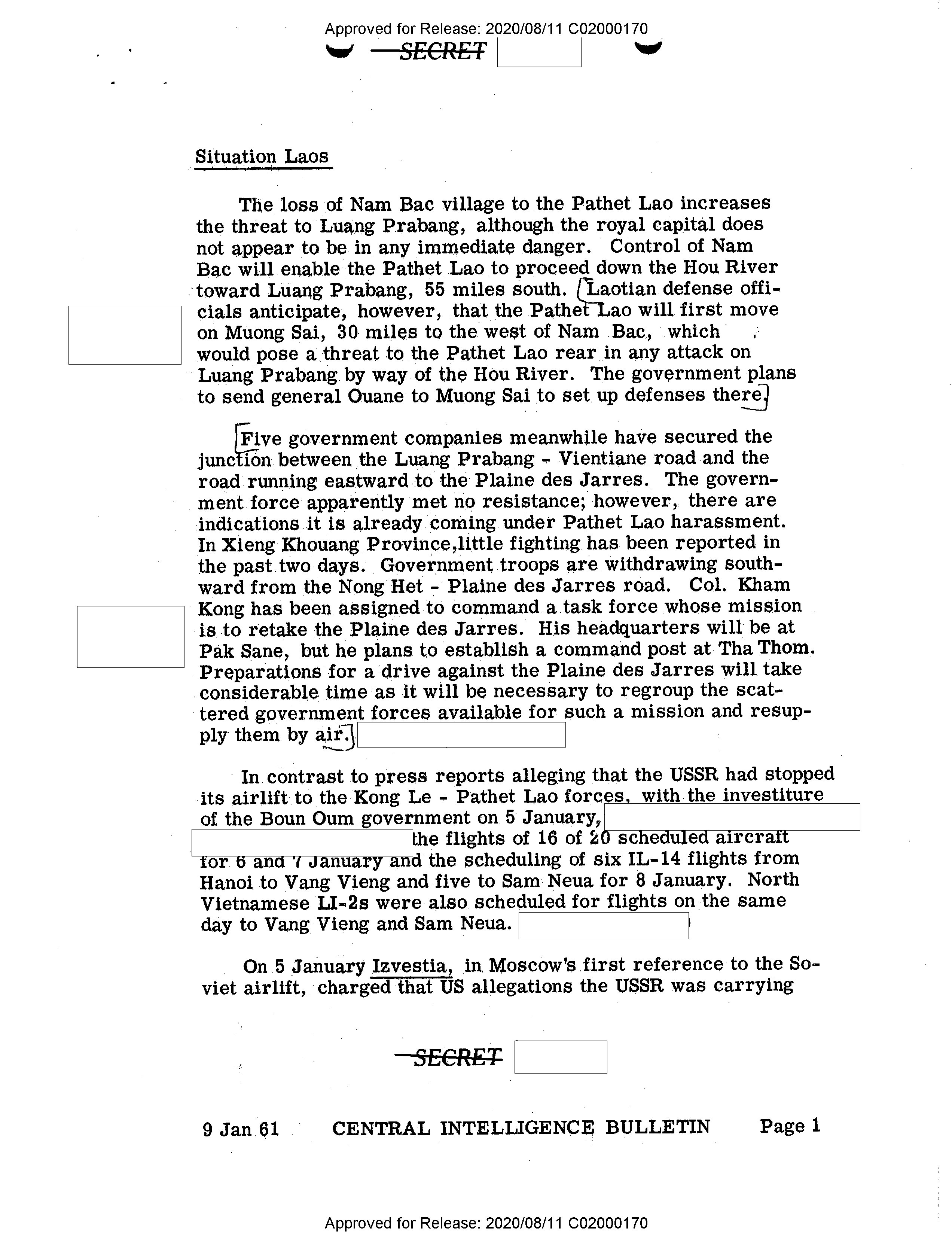 - Approved for Release: 2020/08/11 C02000170 SECRET # Situation Laos The loss of Nam Bac village to the Pathet Lao increases the threat to Luang Prabang, although the royal capital does not appear to be in any immediate danger. Control of Nam Bac will enable the Pathet Lao to proceed down the Hou River toward Luang Prabang, 55 miles south. [Laotian defense officials anticipate, however, that the Pathet Lao will first move on Muong Sai, 30 miles to the west of Nam Bac, which would pose a threat to the Pathet Lao rear in any attack on Luang Prabang by way of the Hou River. The government plans to send general Ouane to Muong Sai to set up defenses there.] [Five government companies meanwhile have secured the junction between the Luang Prabang - Vientiane road and the road running eastward to the Plaine des Jarres. The government force apparently met no resistance; however, there are indications it is already coming under Pathet Lao harassment. In Xieng Khouang Province, little fighting has been reported in the past two days. Government troops are withdrawing southward from the Nong Het - Plaine des Jarres road. Col. Kham Kong has been assigned to command a task force whose mission is to retake the Plaine des Jarres. His headquarters will be at Pak Sane, but he plans to establish a command post at Tha Thom. Preparations for a drive against the Plaine des Jarres will take considerable time as it will be necessary to regroup the scattered government forces available for such a mission and resupply them by air.] In contrast to press reports alleging that the USSR had stopped its airlift to the Kong Le - Pathet Lao forces, with the investiture of the Boun Oum government on 5 January, the flights of 16 of 20 scheduled aircraft for 6 and 7 January and the scheduling of six IL-14 flights from Hanoi to Vang Vieng and five to Sam Neua for 8 January. North Vietnamese LI-2s were also scheduled for flights on the same day to Vang Vieng and Sam Neua. On 5 January Izvestia, in Moscow's first reference to the Soviet airlift, charged that US allegations the USSR was carrying SECRET 9 Jan 61 CENTRAL INTELLIGENCE BULLETIN Page 1 Approved for Release: 2020/08/11 C02000170