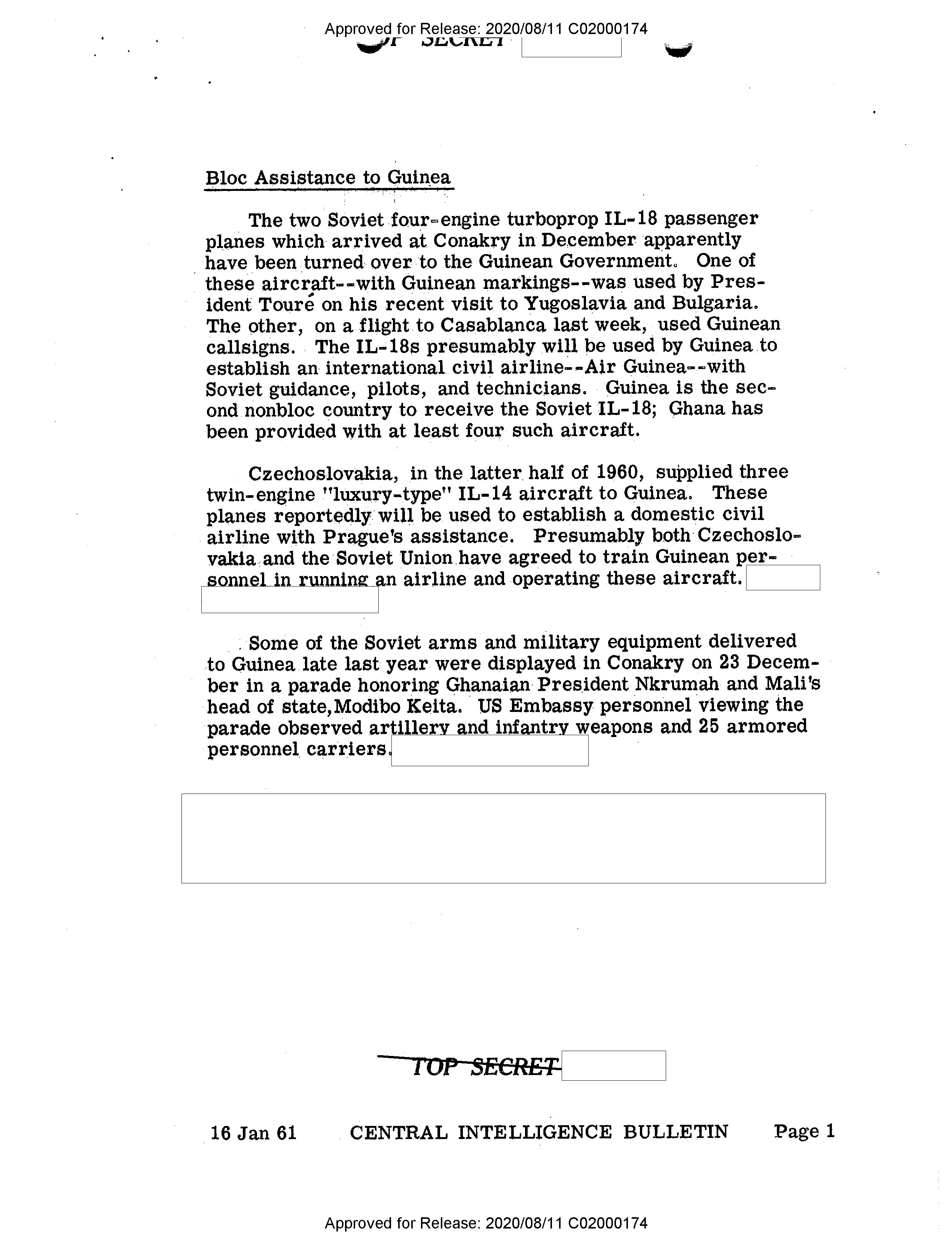 - Approved for Release: 2020/08/11 C02000174 # Bloc Assistance to Guinea The two Soviet four-engine turboprop IL-18 passenger planes which arrived at Conakry in December apparently have been turned over to the Guinean Government. One of these aircraft--with Guinean markings--was used by President Touré on his recent visit to Yugoslavia and Bulgaria. The other, on a flight to Casablanca last week, used Guinean callsigns. The IL-18s presumably will be used by Guinea to establish an international civil airline--Air Guinea--with Soviet guidance, pilots, and technicians. Guinea is the second nonbloc country to receive the Soviet IL-18; Ghana has been provided with at least four such aircraft. Czechoslovakia, in the latter half of 1960, supplied three twin-engine "luxury-type" IL-14 aircraft to Guinea. These planes reportedly will be used to establish a domestic civil airline with Prague's assistance. Presumably both Czechoslovakia and the Soviet Union have agreed to train Guinean personnel in running an airline and operating these aircraft. Some of the Soviet arms and military equipment delivered to Guinea late last year were displayed in Conakry on 23 December in a parade honoring Ghanaian President Nkrumah and Mali's head of state, Modibo Keita. US Embassy personnel viewing the parade observed artillery and infantry weapons and 25 armored personnel carriers. TOP SECRET 16 Jan 61 CENTRAL INTELLIGENCE BULLETIN Page 1 Approved for Release: 2020/08/11 C02000174