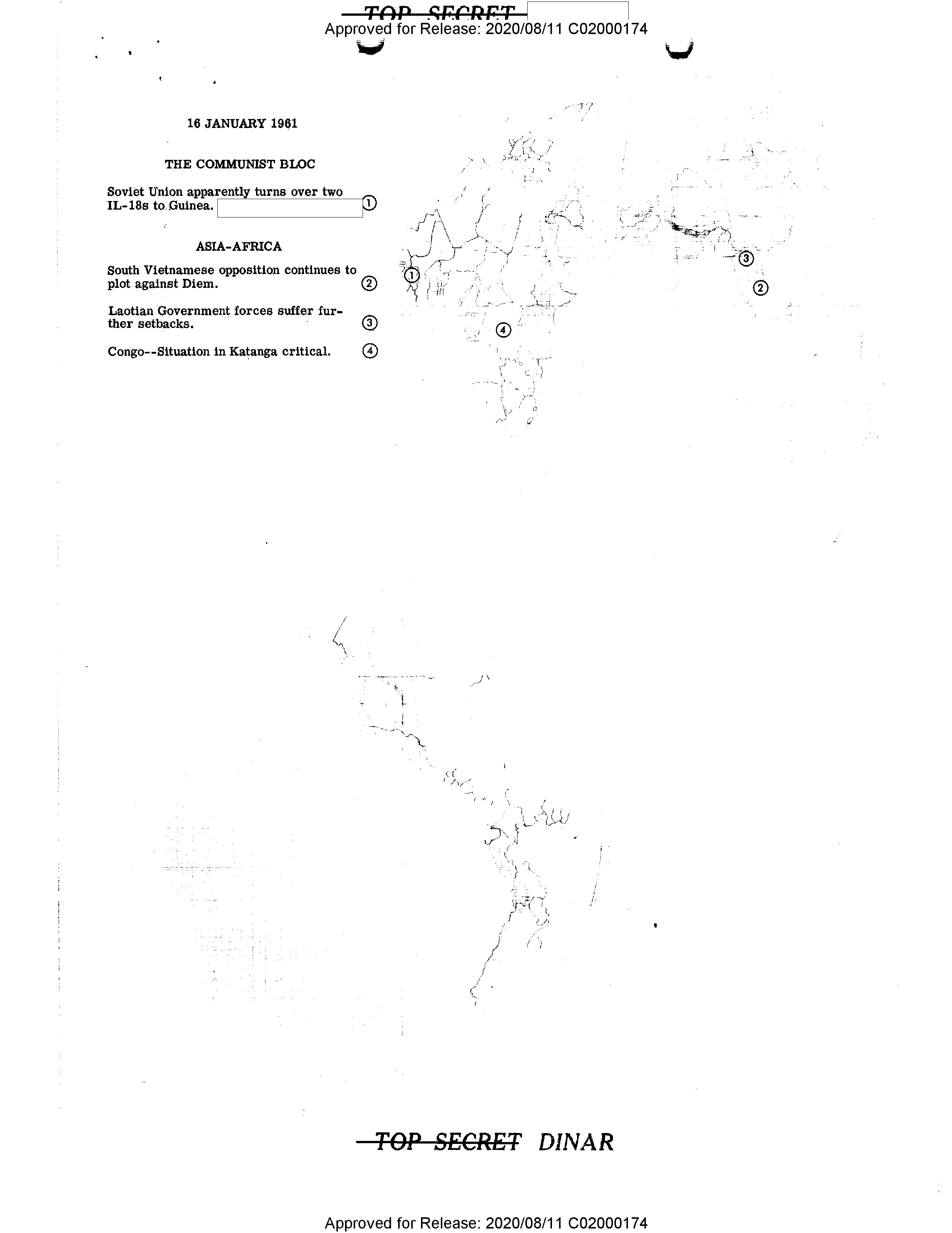 - TOP SECRET Approved for Release: 2020/08/11 C02000174 16 JANUARY 1961 ## THE COMMUNIST BLOC Soviet Union apparently turns over two IL-18s to Guinea. ① ## ASIA-AFRICA South Vietnamese opposition continues to plot against Diem. ② Laotian Government forces suffer further setbacks. ③ Congo--Situation in Katanga critical. ④   TOP SECRET DINAR Approved for Release: 2020/08/11 C02000174