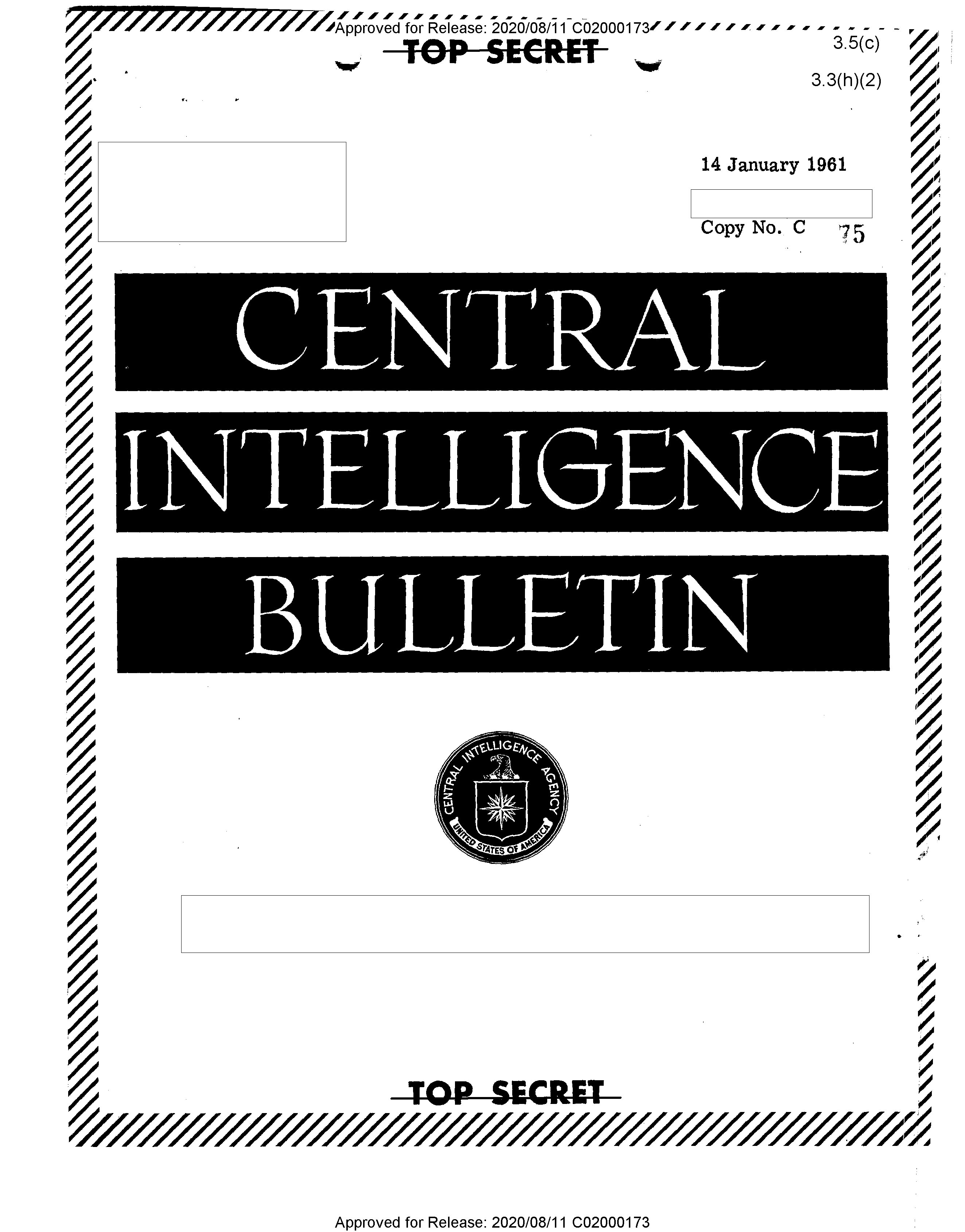 - Approved for Release: 2020/08/11 C02000173 3.5(c) 3.3(h)(2) # TOP SECRET 14 January 1961 Copy No. C 75 # CENTRAL INTELLIGENCE BULLETIN  TOP SECRET Approved for Release: 2020/08/11 C02000173