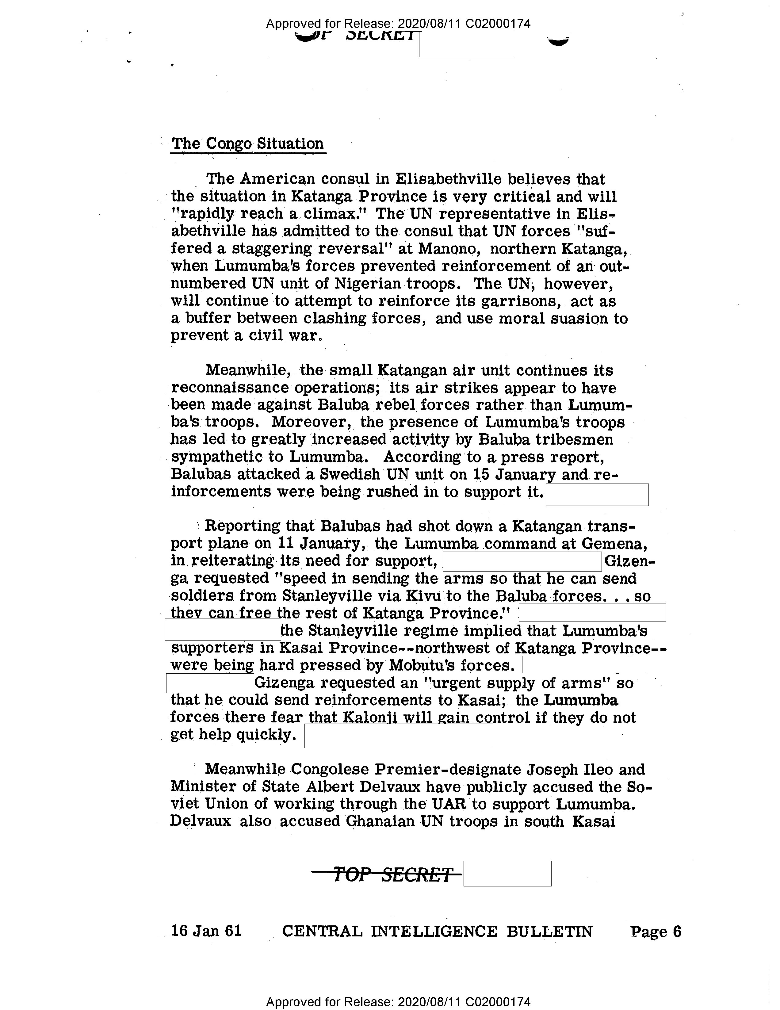 - Approved for Release: 2020/08/11 C02000174 TOP SECRET # The Congo Situation The American consul in Elisabethville believes that the situation in Katanga Province is very critical and will "rapidly reach a climax." The UN representative in Elisabethville has admitted to the consul that UN forces "suffered a staggering reversal" at Manono, northern Katanga, when Lumumba's forces prevented reinforcement of an outnumbered UN unit of Nigerian troops. The UN, however, will continue to attempt to reinforce its garrisons, act as a buffer between clashing forces, and use moral suasion to prevent a civil war. Meanwhile, the small Katangan air unit continues its reconnaissance operations; its air strikes appear to have been made against Baluba rebel forces rather than Lumumba's troops. Moreover, the presence of Lumumba's troops has led to greatly increased activity by Baluba tribesmen sympathetic to Lumumba. According to a press report, Balubas attacked a Swedish UN unit on 15 January and reinforcements were being rushed in to support it. Reporting that Balubas had shot down a Katangan transport plane on 11 January, the Lumumba command at Gemena, in reiterating its need for support, Gizenga requested "speed in sending the arms so that he can send soldiers from Stanleyville via Kivu to the Baluba forces...so they can free the rest of Katanga Province." the Stanleyville regime implied that Lumumba's supporters in Kasai Province--northwest of Katanga Province--were being hard pressed by Mobutu's forces. Gizenga requested an "urgent supply of arms" so that he could send reinforcements to Kasai; the Lumumba forces there fear that Kalonji will gain control if they do not get help quickly. Meanwhile Congolese Premier-designate Joseph Ileo and Minister of State Albert Delvaux have publicly accused the Soviet Union of working through the UAR to support Lumumba. Delvaux also accused Ghanaian UN troops in south Kasai TOP SECRET 16 Jan 61 CENTRAL INTELLIGENCE BULLETIN Page 6 Approved for Release: 2020/08/11 C02000174