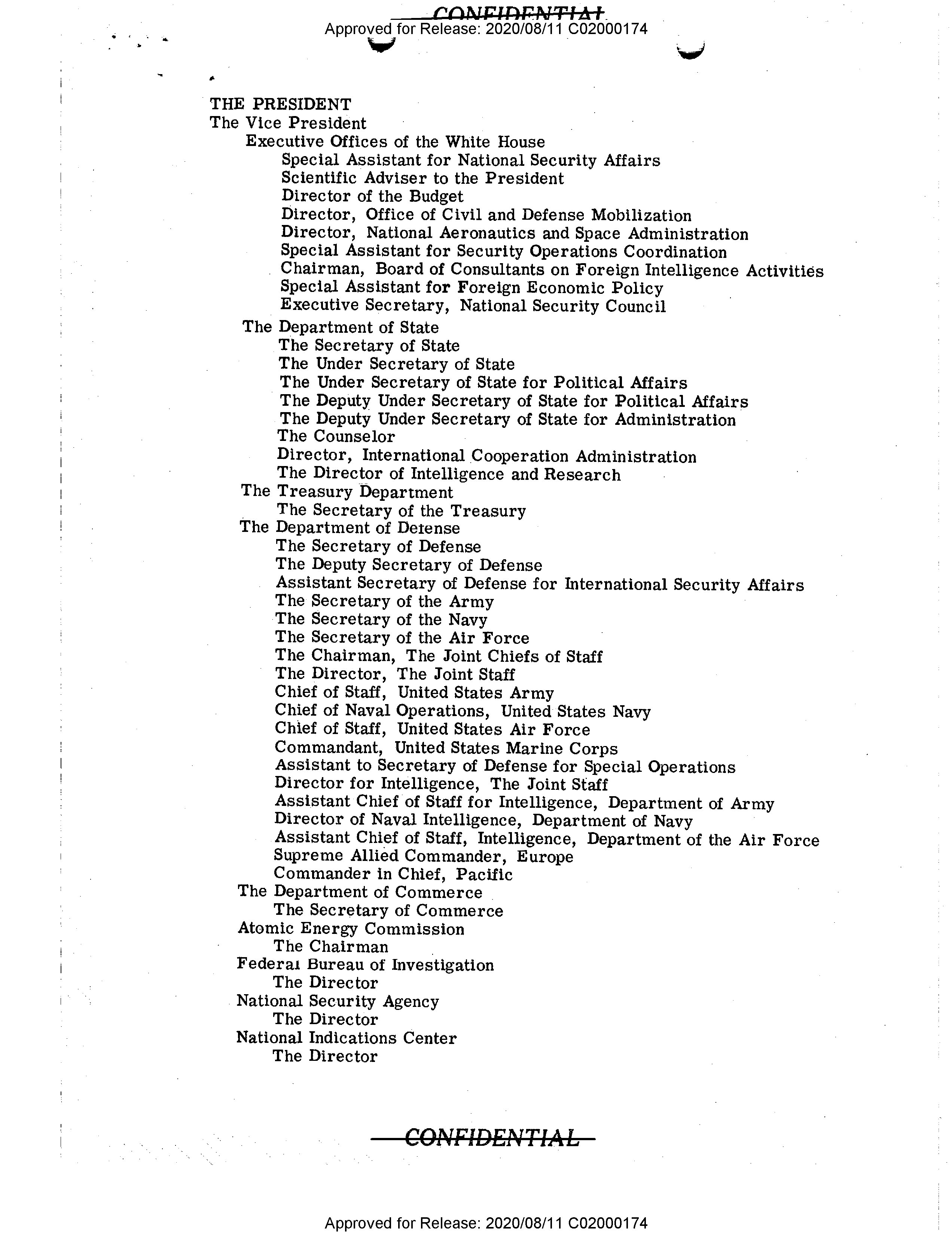 - CONFIDENTIAL Approved for Release: 2020/08/11 C02000174 # THE PRESIDENT ## The Vice President ### Executive Offices of the White House - Special Assistant for National Security Affairs - Scientific Adviser to the President - Director of the Budget - Director, Office of Civil and Defense Mobilization - Director, National Aeronautics and Space Administration - Special Assistant for Security Operations Coordination - Chairman, Board of Consultants on Foreign Intelligence Activities - Special Assistant for Foreign Economic Policy - Executive Secretary, National Security Council ## The Department of State - The Secretary of State - The Under Secretary of State - The Under Secretary of State for Political Affairs - The Deputy Under Secretary of State for Political Affairs - The Deputy Under Secretary of State for Administration - The Counselor - Director, International Cooperation Administration - The Director of Intelligence and Research ## The Treasury Department - The Secretary of the Treasury ## The Department of Defense - The Secretary of Defense - The Deputy Secretary of Defense - Assistant Secretary of Defense for International Security Affairs - The Secretary of the Army - The Secretary of the Navy - The Secretary of the Air Force - The Chairman, The Joint Chiefs of Staff - The Director, The Joint Staff - Chief of Staff, United States Army - Chief of Naval Operations, United States Navy - Chief of Staff, United States Air Force - Commandant, United States Marine Corps - Assistant to Secretary of Defense for Special Operations - Director for Intelligence, The Joint Staff - Assistant Chief of Staff for Intelligence, Department of Army - Director of Naval Intelligence, Department of Navy - Assistant Chief of Staff, Intelligence, Department of the Air Force - Supreme Allied Commander, Europe - Commander in Chief, Pacific ## The Department of Commerce - The Secretary of Commerce ## Atomic Energy Commission - The Chairman ## Federal Bureau of Investigation - The Director ## National Security Agency - The Director ## National Indications Center - The Director CONFIDENTIAL Approved for Release: 2020/08/11 C02000174