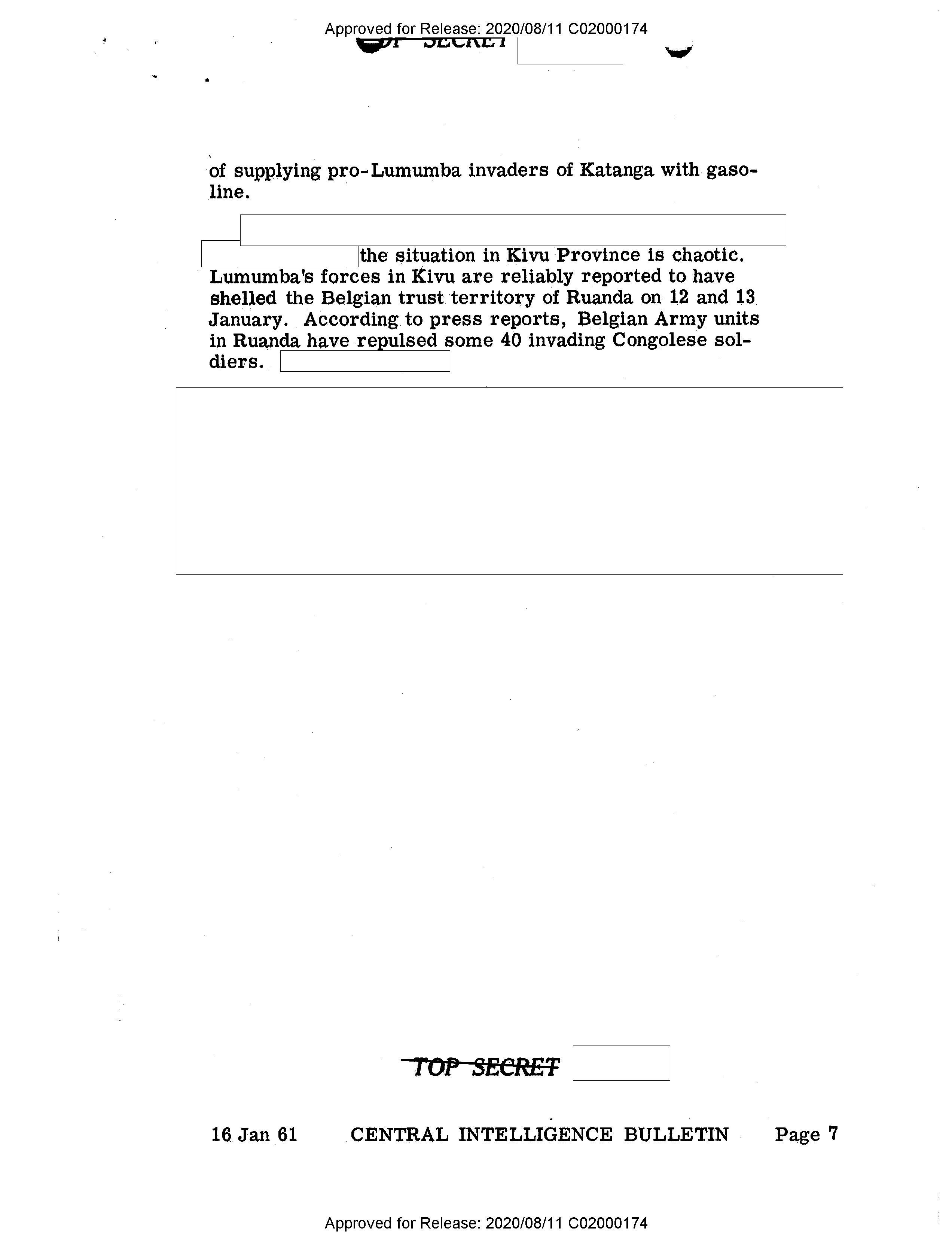 - Approved for Release: 2020/08/11 C02000174 of supplying pro-Lumumba invaders of Katanga with gasoline. the situation in Kivu Province is chaotic. Lumumba's forces in Kivu are reliably reported to have shelled the Belgian trust territory of Ruanda on 12 and 13 January. According to press reports, Belgian Army units in Ruanda have repulsed some 40 invading Congolese soldiers. TOP SECRET 16 Jan 61 CENTRAL INTELLIGENCE BULLETIN Page 7 Approved for Release: 2020/08/11 C02000174