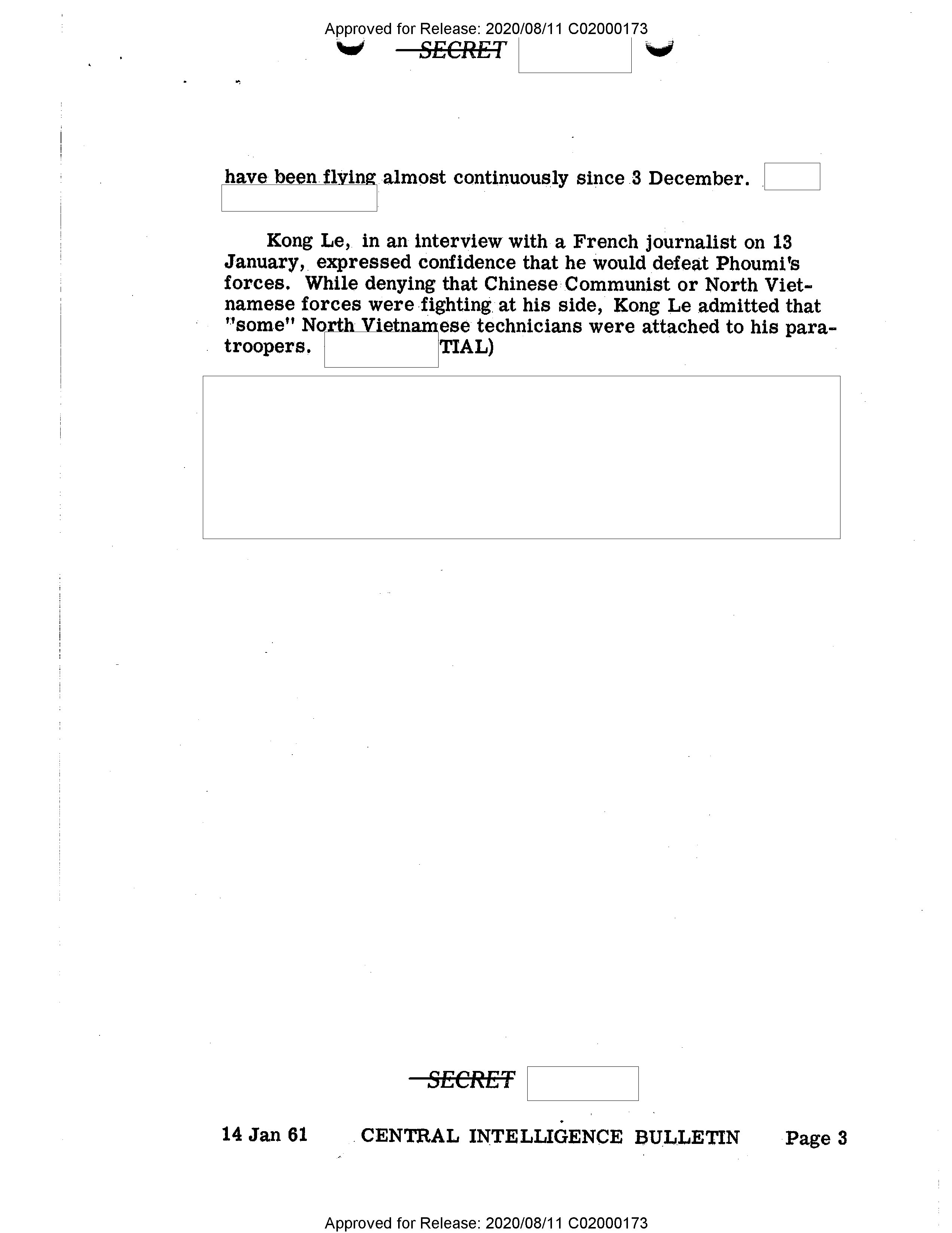- Approved for Release: 2020/08/11 C02000173 SECRET have been flying almost continuously since 3 December. Kong Le, in an interview with a French journalist on 13 January, expressed confidence that he would defeat Phoumi's forces. While denying that Chinese Communist or North Vietnamese forces were fighting at his side, Kong Le admitted that "some" North Vietnamese technicians were attached to his paratroopers. (TIAL) SECRET 14 Jan 61 CENTRAL INTELLIGENCE BULLETIN Page 3 Approved for Release: 2020/08/11 C02000173