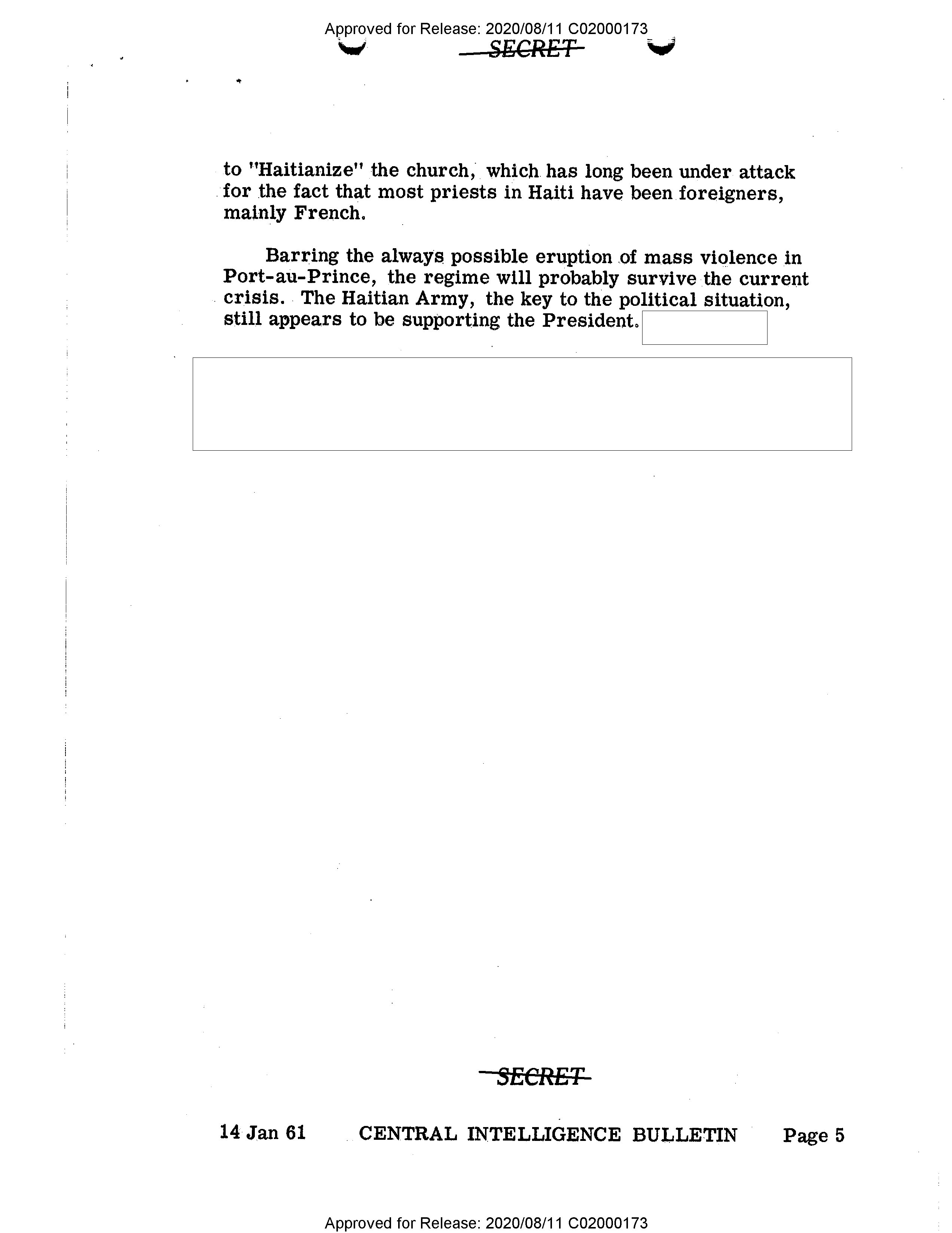 - Approved for Release: 2020/08/11 C02000173 SECRET to "Haitianize" the church, which has long been under attack for the fact that most priests in Haiti have been foreigners, mainly French. Barring the always possible eruption of mass violence in Port-au-Prince, the regime will probably survive the current crisis. The Haitian Army, the key to the political situation, still appears to be supporting the President. SECRET 14 Jan 61 CENTRAL INTELLIGENCE BULLETIN Page 5 Approved for Release: 2020/08/11 C02000173