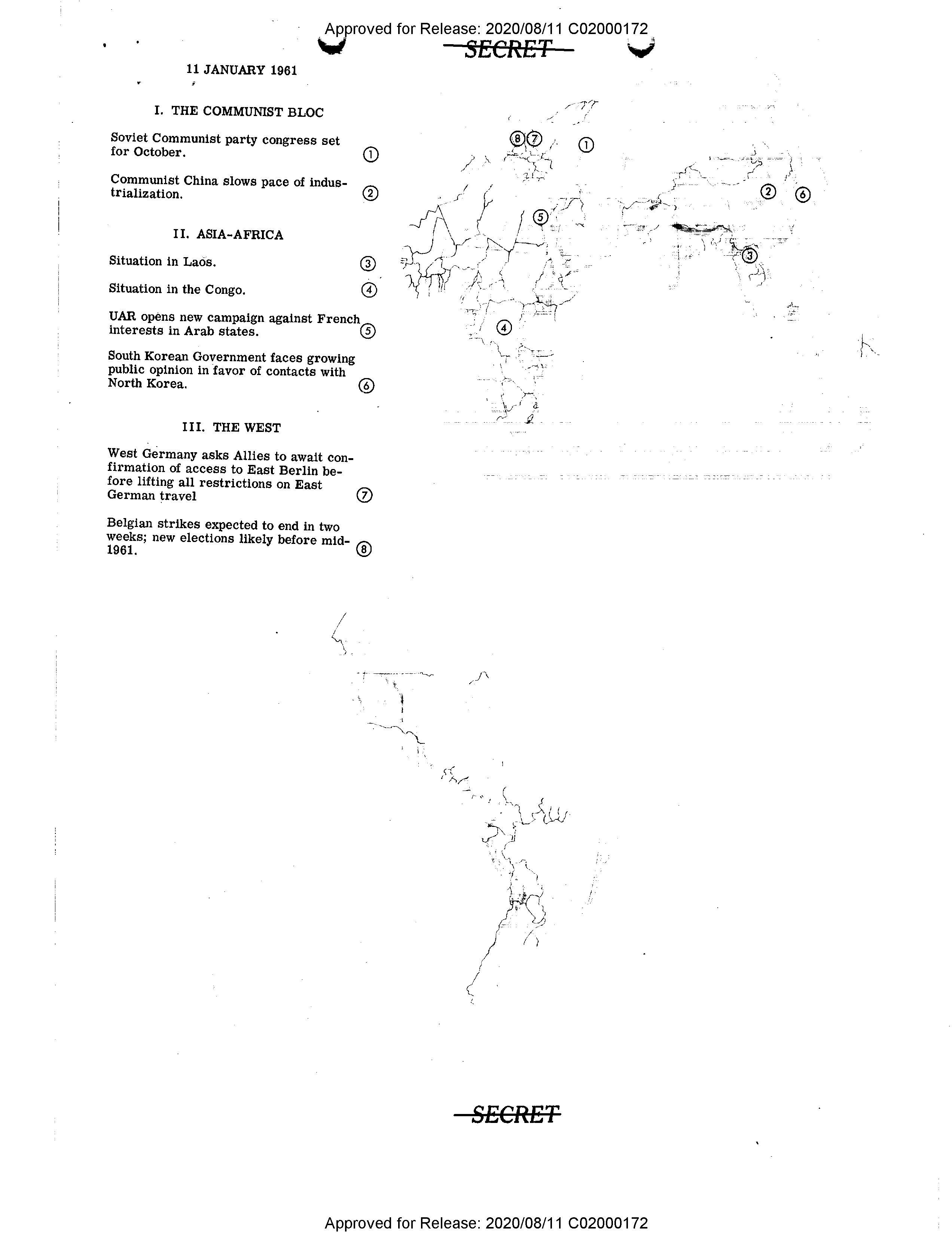 - Approved for Release: 2020/08/11 C02000172 11 JANUARY 1961 # I. THE COMMUNIST BLOC Soviet Communist party congress set for October. ① Communist China slows pace of industrialization. ② # II. ASIA-AFRICA Situation in Laos. ③ Situation in the Congo. ④ UAR opens new campaign against French interests in Arab states. ⑤ South Korean Government faces growing public opinion in favor of contacts with North Korea. ⑥ # III. THE WEST West Germany asks Allies to await confirmation of access to East Berlin before lifting all restrictions on East German travel ⑦ Belgian strikes expected to end in two weeks; new elections likely before mid-1961. ⑧   SECRET Approved for Release: 2020/08/11 C02000172