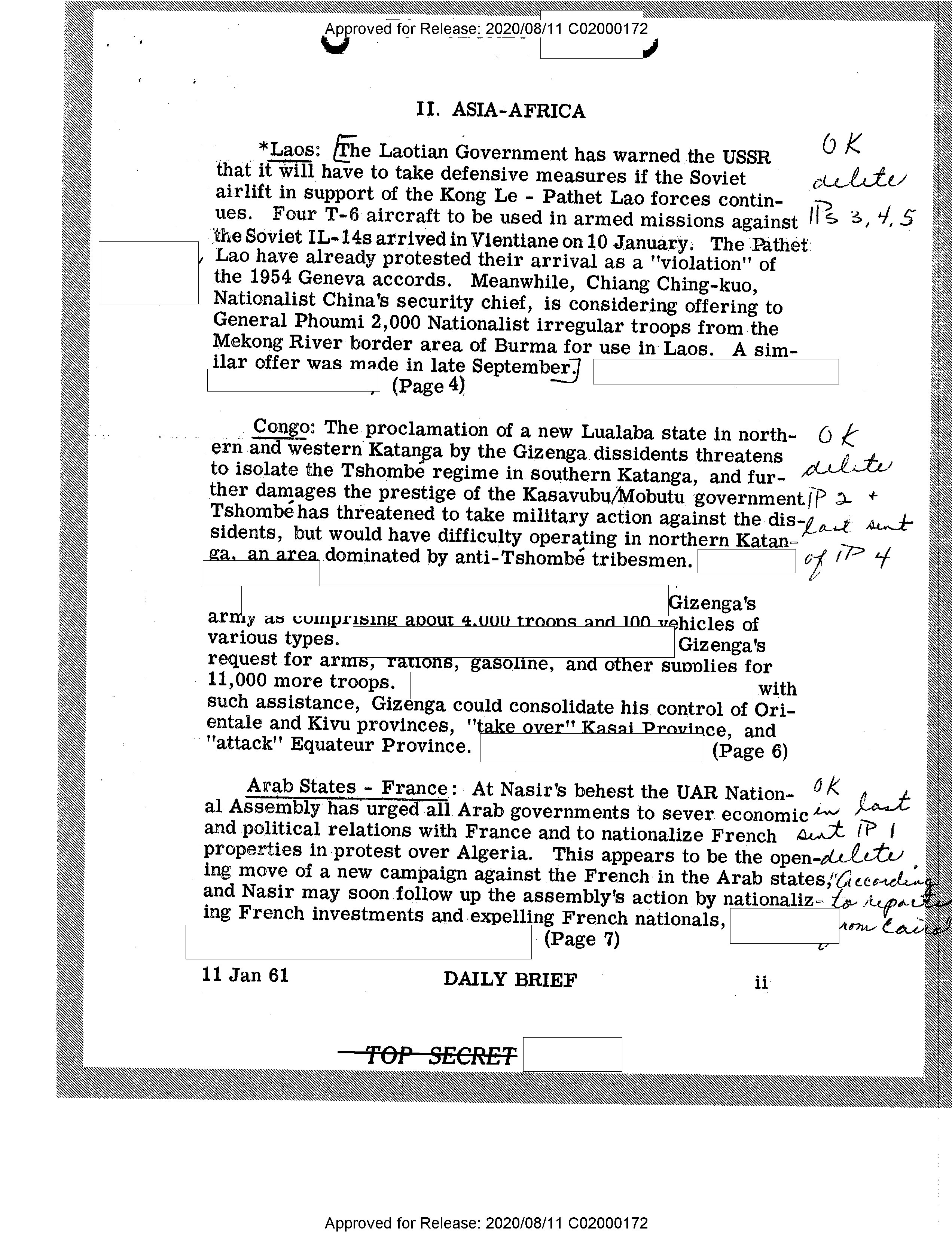 - Approved for Release: 2020/08/11 C02000172 ## II. ASIA-AFRICA *Laos: The Laotian Government has warned the USSR that it will have to take defensive measures if the Soviet airlift in support of the Kong Le - Pathet Lao forces continues. Four T-6 aircraft to be used in armed missions against the Soviet IL-14s arrived in Vientiane on 10 January. The Pathet Lao have already protested their arrival as a "violation" of the 1954 Geneva accords. Meanwhile, Chiang Ching-kuo, Nationalist China's security chief, is considering offering to General Phoumi 2,000 Nationalist irregular troops from the Mekong River border area of Burma for use in Laos. A similar offer was made in late September. (Page 4) *OK delete IP 3, 4, 5 *Congo: The proclamation of a new Lualaba state in northern and western Katanga by the Gizenga dissidents threatens to isolate the Tshombé regime in southern Katanga, and further damages the prestige of the Kasavubu/Mobutu government Tshombé has threatened to take military action against the dissidents, but would have difficulty operating in northern Katanga, an area dominated by anti-Tshombé tribesmen. *OK delete IP 2 + Last sent of IP 4 *Gizenga's army as comprising about 4,000 troops and 100 vehicles of various types. Gizenga's request for arms, rations, gasoline, and other supplies for 11,000 more troops. with such assistance, Gizenga could consolidate his control of Orientale and Kivu provinces, "take over" Kasai Province, and "attack" Equateur Province. (Page 6) *Arab States - France*: At Nasir's behest the UAR National Assembly has urged all Arab governments to sever economic and political relations with France and to nationalize French properties in protest over Algeria. This appears to be the opening move of a new campaign against the French in the Arab states; and Nasir may soon follow up the assembly's action by nationalizing French investments and expelling French nationals, (Page 7) *OK sent IP 1 delete According to report from Cairo* 11 Jan 61 DAILY BRIEF ii Approved for Release: 2020/08/11 C02000172