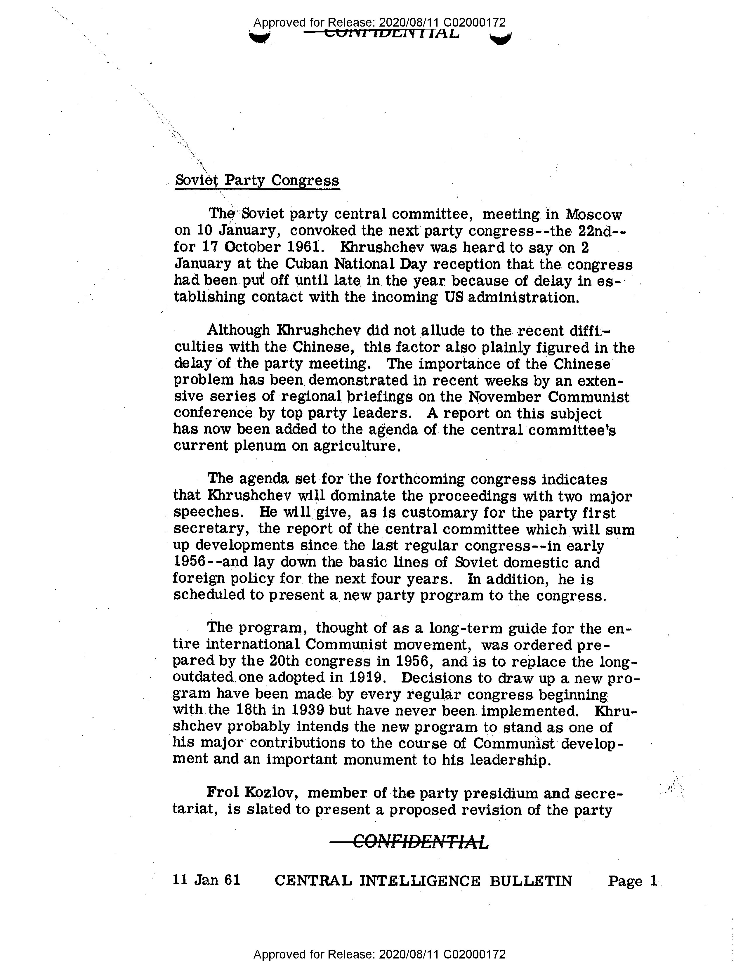 - Approved for Release: 2020/08/11 C02000172 # Soviet Party Congress The Soviet party central committee, meeting in Moscow on 10 January, convoked the next party congress--the 22nd--for 17 October 1961. Khrushchev was heard to say on 2 January at the Cuban National Day reception that the congress had been put off until late in the year because of delay in establishing contact with the incoming US administration. Although Khrushchev did not allude to the recent difficulties with the Chinese, this factor also plainly figured in the delay of the party meeting. The importance of the Chinese problem has been demonstrated in recent weeks by an extensive series of regional briefings on the November Communist conference by top party leaders. A report on this subject has now been added to the agenda of the central committee's current plenum on agriculture. The agenda set for the forthcoming congress indicates that Khrushchev will dominate the proceedings with two major speeches. He will give, as is customary for the party first secretary, the report of the central committee which will sum up developments since the last regular congress--in early 1956--and lay down the basic lines of Soviet domestic and foreign policy for the next four years. In addition, he is scheduled to present a new party program to the congress. The program, thought of as a long-term guide for the entire international Communist movement, was ordered prepared by the 20th congress in 1956, and is to replace the long-outdated one adopted in 1919. Decisions to draw up a new program have been made by every regular congress beginning with the 18th in 1939 but have never been implemented. Khrushchev probably intends the new program to stand as one of his major contributions to the course of Communist development and an important monument to his leadership. Frol Kozlov, member of the party presidium and secretariat, is slated to present a proposed revision of the party --- CONFIDENTIAL 11 Jan 61 CENTRAL INTELLIGENCE BULLETIN Page 1 Approved for Release: 2020/08/11 C02000172