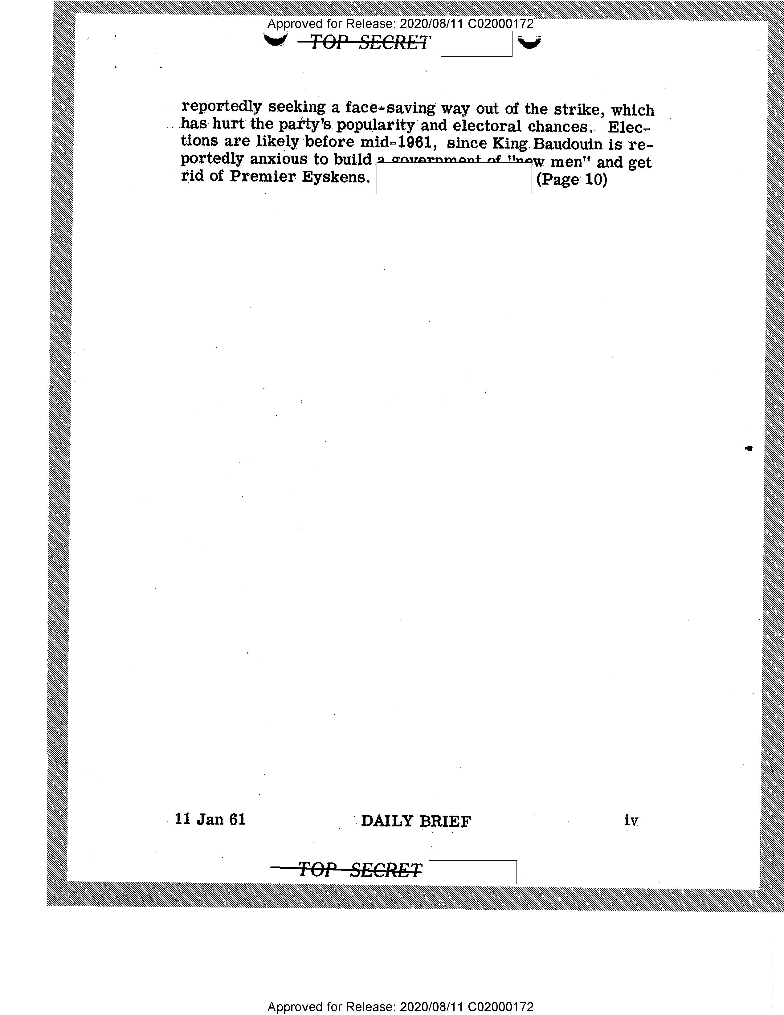 - Approved for Release: 2020/08/11 C02000172 TOP SECRET reportedly seeking a face-saving way out of the strike, which has hurt the party's popularity and electoral chances. Elections are likely before mid-1961, since King Baudouin is reportedly anxious to build a government of "new men" and get rid of Premier Eyskens. (Page 10) 11 Jan 61 DAILY BRIEF iv TOP SECRET Approved for Release: 2020/08/11 C02000172