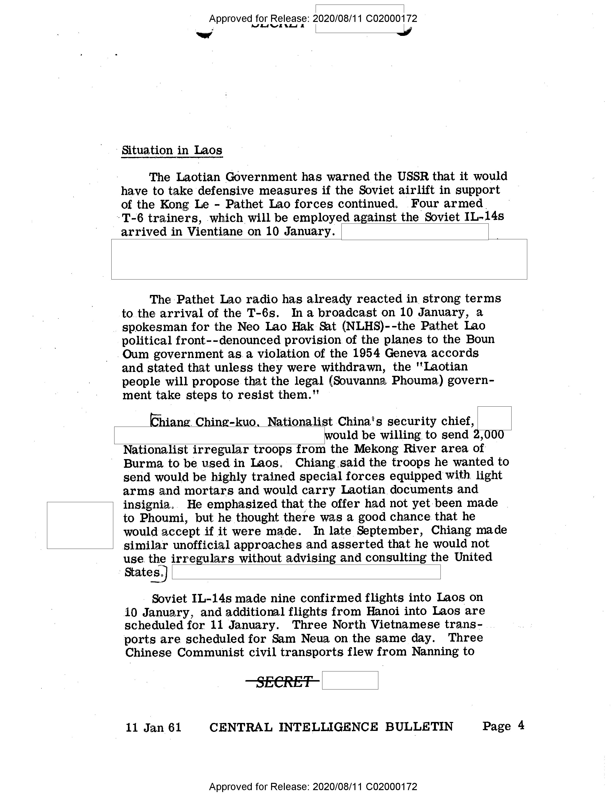 - Approved for Release: 2020/08/11 C02000172 # Situation in Laos The Laotian Government has warned the USSR that it would have to take defensive measures if the Soviet airlift in support of the Kong Le - Pathet Lao forces continued. Four armed T-6 trainers, which will be employed against the Soviet IL-14s arrived in Vientiane on 10 January. The Pathet Lao radio has already reacted in strong terms to the arrival of the T-6s. In a broadcast on 10 January, a spokesman for the Neo Lao Hak Sat (NLHS)--the Pathet Lao political front--denounced provision of the planes to the Boun Oum government as a violation of the 1954 Geneva accords and stated that unless they were withdrawn, the "Laotian people will propose that the legal (Souvanna Phouma) government take steps to resist them." Chiang Ching-kuo, Nationalist China's security chief, would be willing to send 2,000 Nationalist irregular troops from the Mekong River area of Burma to be used in Laos. Chiang said the troops he wanted to send would be highly trained special forces equipped with light arms and mortars and would carry Laotian documents and insignia. He emphasized that the offer had not yet been made to Phoumi, but he thought there was a good chance that he would accept if it were made. In late September, Chiang made similar unofficial approaches and asserted that he would not use the irregulars without advising and consulting the United States. Soviet IL-14s made nine confirmed flights into Laos on 10 January, and additional flights from Hanoi into Laos are scheduled for 11 January. Three North Vietnamese transports are scheduled for Sam Neua on the same day. Three Chinese Communist civil transports flew from Nanning to SECRET 11 Jan 61 CENTRAL INTELLIGENCE BULLETIN Page 4 Approved for Release: 2020/08/11 C02000172
