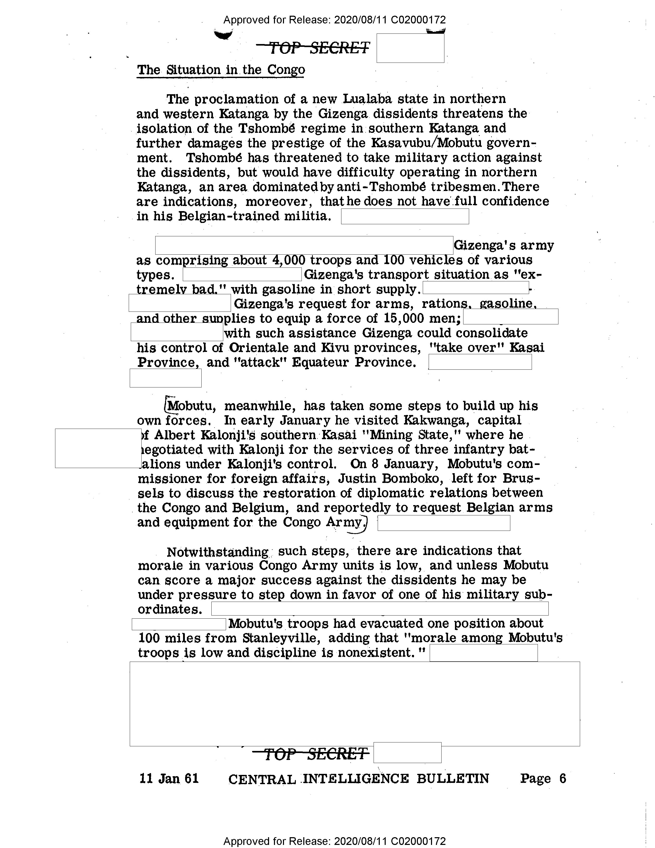 - Approved for Release: 2020/08/11 C02000172 # The Situation in the Congo The proclamation of a new Lualaba state in northern and western Katanga by the Gizenga dissidents threatens the isolation of the Tshombé regime in southern Katanga and further damages the prestige of the Kasavubu/Mobutu government. Tshombé has threatened to take military action against the dissidents, but would have difficulty operating in northern Katanga, an area dominated by anti-Tshombé tribesmen. There are indications, moreover, that he does not have full confidence in his Belgian-trained militia. Gizenga's army as comprising about 4,000 troops and 100 vehicles of various types. Gizenga's transport situation as "extremely bad," with gasoline in short supply. Gizenga's request for arms, rations, gasoline, and other supplies to equip a force of 15,000 men; with such assistance Gizenga could consolidate his control of Orientale and Kivu provinces, "take over" Kasai Province, and "attack" Equateur Province. Mobutu, meanwhile, has taken some steps to build up his own forces. In early January he visited Kakwanga, capital of Albert Kalonji's southern Kasai "Mining State," where he negotiated with Kalonji for the services of three infantry battalions under Kalonji's control. On 8 January, Mobutu's commissioner for foreign affairs, Justin Bomboko, left for Brussels to discuss the restoration of diplomatic relations between the Congo and Belgium, and reportedly to request Belgian arms and equipment for the Congo Army. Notwithstanding such steps, there are indications that morale in various Congo Army units is low, and unless Mobutu can score a major success against the dissidents he may be under pressure to step down in favor of one of his military subordinates. Mobutu's troops had evacuated one position about 100 miles from Stanleyville, adding that "morale among Mobutu's troops is low and discipline is nonexistent." # THE SECRETARY OF THE ARMY 11 Jan 61 CENTRAL INTELLIGENCE BULLETIN Page 6 Approved for Release: 2020/08/11 C02000172