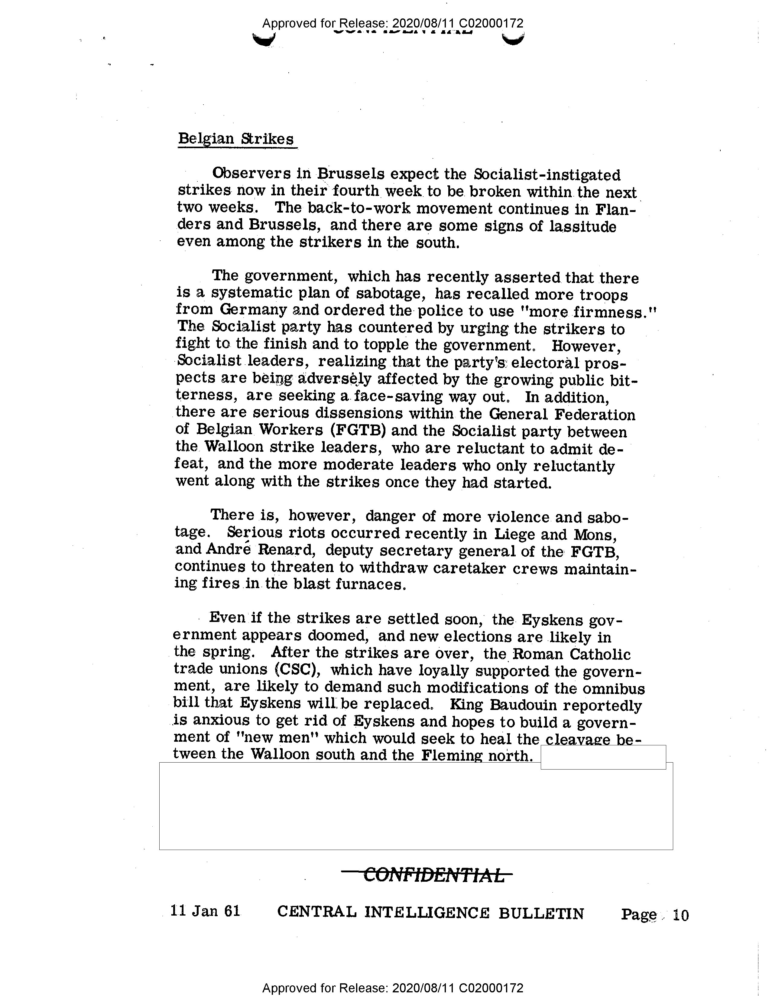 - Approved for Release: 2020/08/11 C02000172 # Belgian Strikes Observers in Brussels expect the Socialist-instigated strikes now in their fourth week to be broken within the next two weeks. The back-to-work movement continues in Flanders and Brussels, and there are some signs of lassitude even among the strikers in the south. The government, which has recently asserted that there is a systematic plan of sabotage, has recalled more troops from Germany and ordered the police to use "more firmness." The Socialist party has countered by urging the strikers to fight to the finish and to topple the government. However, Socialist leaders, realizing that the party's electoral prospects are being adversely affected by the growing public bitterness, are seeking a face-saving way out. In addition, there are serious dissensions within the General Federation of Belgian Workers (FGTB) and the Socialist party between the Walloon strike leaders, who are reluctant to admit defeat, and the more moderate leaders who only reluctantly went along with the strikes once they had started. There is, however, danger of more violence and sabotage. Serious riots occurred recently in Liege and Mons, and André Renard, deputy secretary general of the FGTB, continues to threaten to withdraw caretaker crews maintaining fires in the blast furnaces. Even if the strikes are settled soon, the Eyskens government appears doomed, and new elections are likely in the spring. After the strikes are over, the Roman Catholic trade unions (CSC), which have loyally supported the government, are likely to demand such modifications of the omnibus bill that Eyskens will be replaced. King Baudouin reportedly is anxious to get rid of Eyskens and hopes to build a government of "new men" which would seek to heal the cleavage between the Walloon south and the Fleming north. CONFIDENTIAL 11 Jan 61 CENTRAL INTELLIGENCE BULLETIN Page 10 Approved for Release: 2020/08/11 C02000172