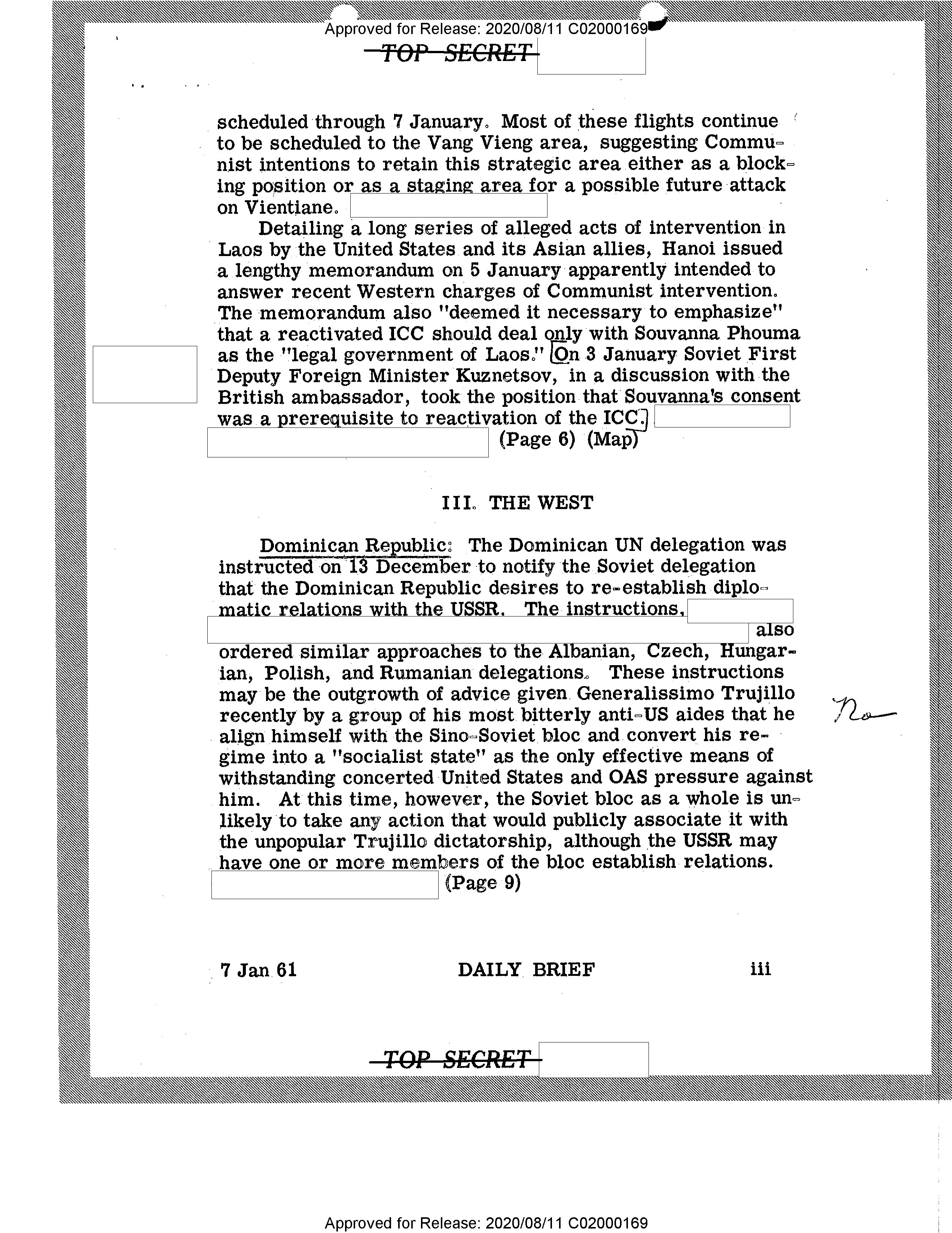 - Approved for Release: 2020/08/11 C02000169 TOP SECRET scheduled through 7 January. Most of these flights continue to be scheduled to the Vang Vieng area, suggesting Communist intentions to retain this strategic area either as a blocking position or as a staging area for a possible future attack on Vientiane. Detailing a long series of alleged acts of intervention in Laos by the United States and its Asian allies, Hanoi issued a lengthy memorandum on 5 January apparently intended to answer recent Western charges of Communist intervention. The memorandum also "deemed it necessary to emphasize" that a reactivated ICC should deal only with Souvanna Phouma as the "legal government of Laos." On 3 January Soviet First Deputy Foreign Minister Kuznetsov, in a discussion with the British ambassador, took the position that Souvanna's consent was a prerequisite to reactivation of the ICC. (Page 6) (Map) ### III. THE WEST **Dominican Republic:** The Dominican UN delegation was instructed on 13 December to notify the Soviet delegation that the Dominican Republic desires to re-establish diplomatic relations with the USSR. The instructions, also ordered similar approaches to the Albanian, Czech, Hungarian, Polish, and Rumanian delegations. These instructions may be the outgrowth of advice given Generalissimo Trujillo recently by a group of his most bitterly anti-US aides that he align himself with the Sino-Soviet bloc and convert his regime into a "socialist state" as the only effective means of withstanding concerted United States and OAS pressure against him. At this time, however, the Soviet bloc as a whole is unlikely to take any action that would publicly associate it with the unpopular Trujillo dictatorship, although the USSR may have one or more members of the bloc establish relations. (Page 9) 7 Jan 61 DAILY BRIEF iii TOP SECRET Approved for Release: 2020/08/11 C02000169