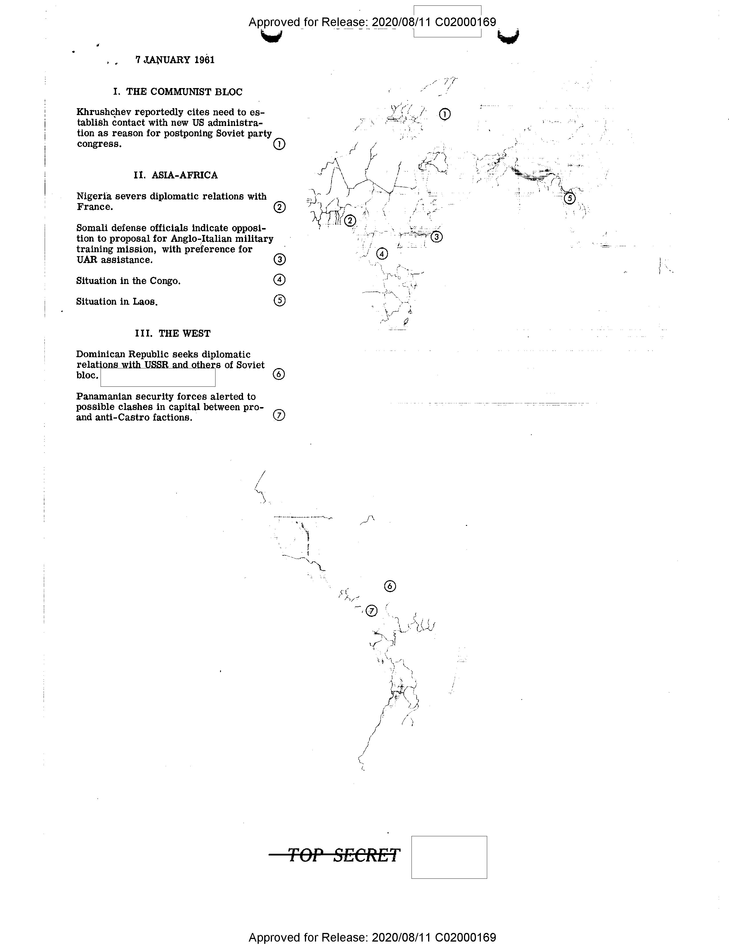 - Approved for Release: 2020/08/11 C02000169 7 JANUARY 1961 ## I. THE COMMUNIST BLOC Khrushchev reportedly cites need to establish contact with new US administration as reason for postponing Soviet party congress. 1 ## II. ASIA-AFRICA Nigeria severs diplomatic relations with France. 2 Somali defense officials indicate opposition to proposal for Anglo-Italian military training mission, with preference for UAR assistance. 3 Situation in the Congo. 4 Situation in Laos. 5 ## III. THE WEST Dominican Republic seeks diplomatic relations with USSR and others of Soviet bloc. 6 Panamanian security forces alerted to possible clashes in capital between pro- and anti-Castro factions. 7   TOP SECRET Approved for Release: 2020/08/11 C02000169