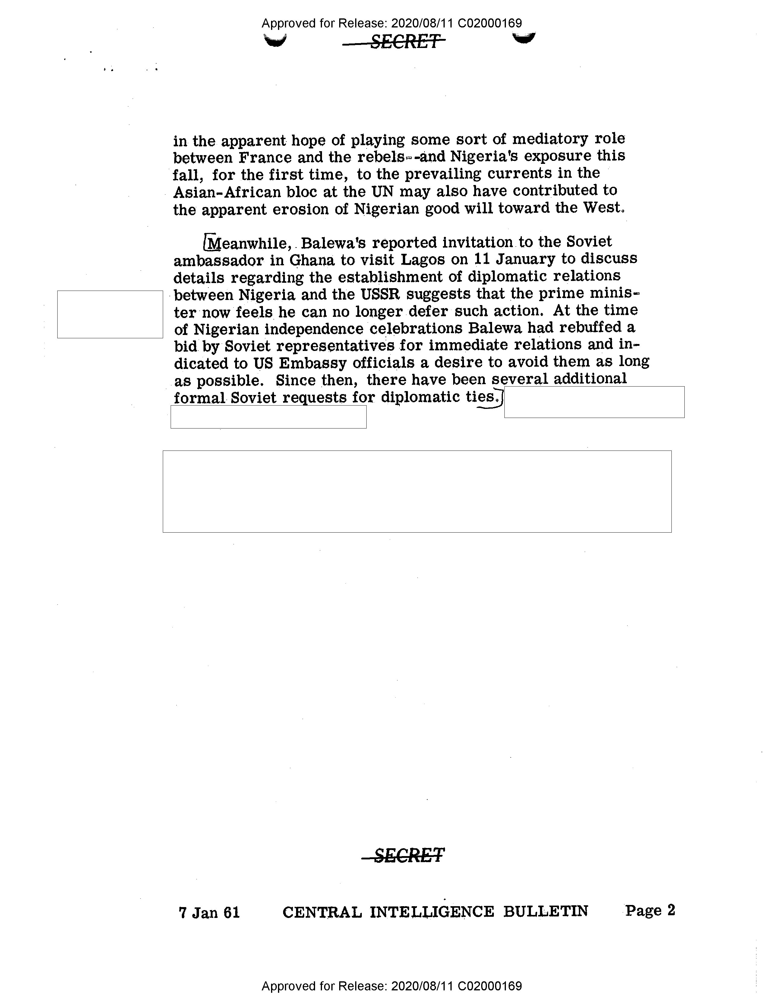 - Approved for Release: 2020/08/11 C02000169 SECRET in the apparent hope of playing some sort of mediatory role between France and the rebels--and Nigeria's exposure this fall, for the first time, to the prevailing currents in the Asian-African bloc at the UN may also have contributed to the apparent erosion of Nigerian good will toward the West. Meanwhile, Balewa's reported invitation to the Soviet ambassador in Ghana to visit Lagos on 11 January to discuss details regarding the establishment of diplomatic relations between Nigeria and the USSR suggests that the prime minister now feels he can no longer defer such action. At the time of Nigerian independence celebrations Balewa had rebuffed a bid by Soviet representatives for immediate relations and indicated to US Embassy officials a desire to avoid them as long as possible. Since then, there have been several additional formal Soviet requests for diplomatic ties. SECRET 7 Jan 61 CENTRAL INTELLIGENCE BULLETIN Page 2 Approved for Release: 2020/08/11 C02000169