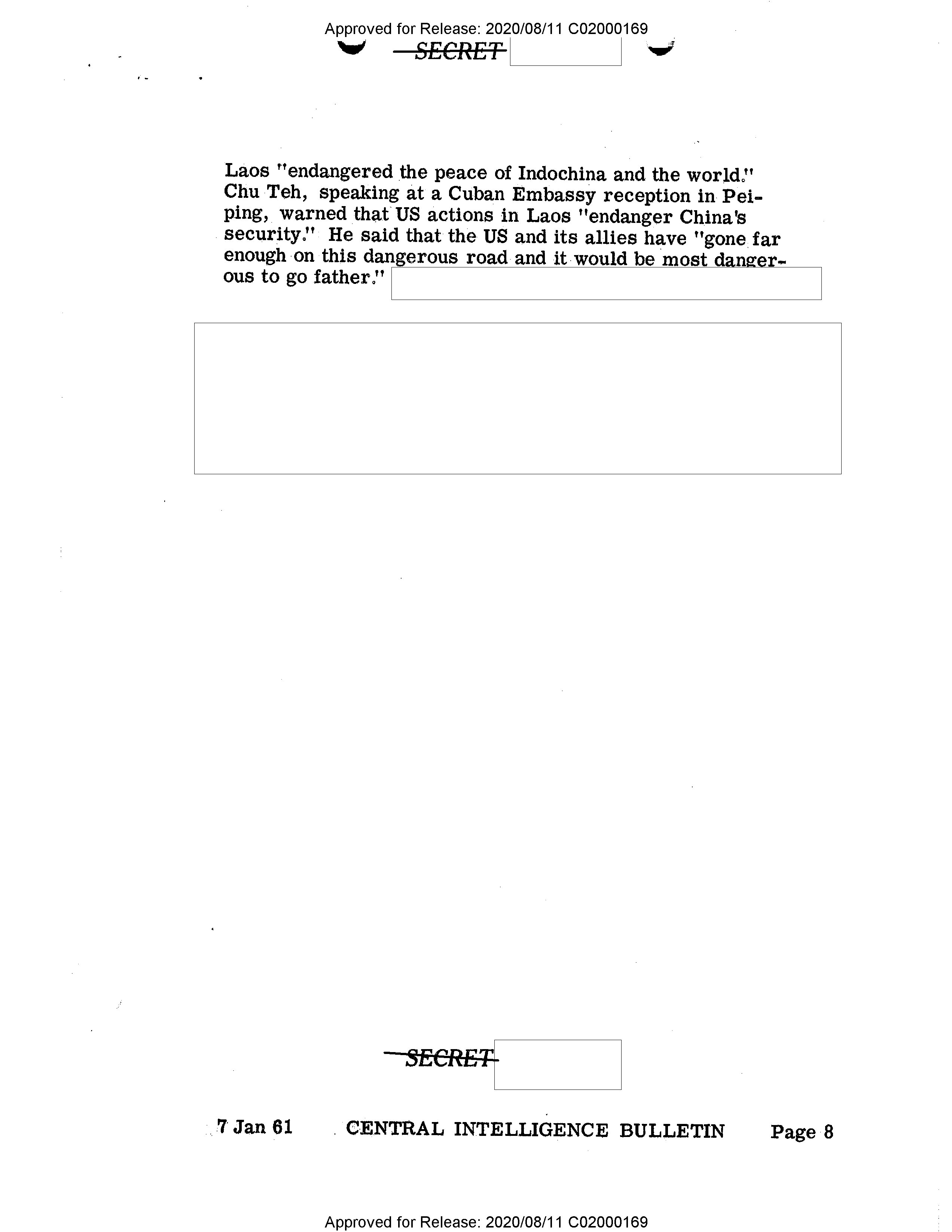 - Approved for Release: 2020/08/11 C02000169 SECRET Laos "endangered the peace of Indochina and the world." Chu Teh, speaking at a Cuban Embassy reception in Peiping, warned that US actions in Laos "endanger China's security." He said that the US and its allies have "gone far enough on this dangerous road and it would be most dangerous to go father." SECRET 7 Jan 61 CENTRAL INTELLIGENCE BULLETIN Page 8 Approved for Release: 2020/08/11 C02000169