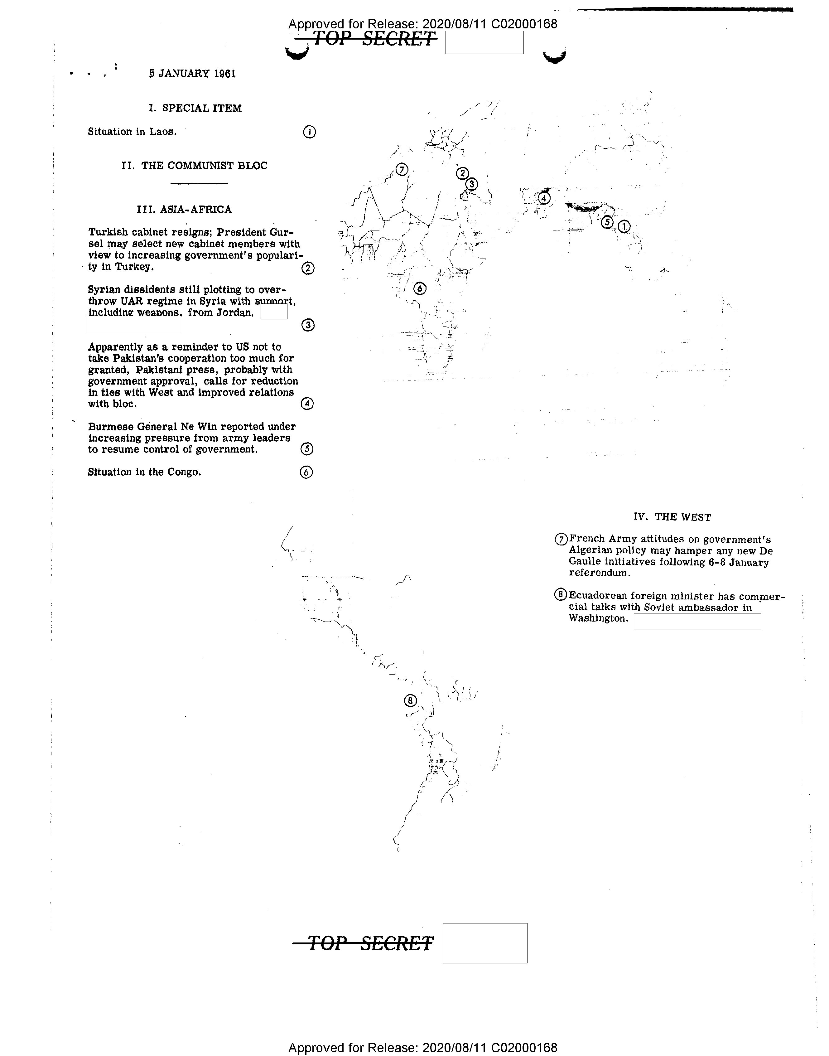- Approved for Release: 2020/08/11 C02000168 TOP SECRET 5 JANUARY 1961 I. SPECIAL ITEM Situation in Laos. II. THE COMMUNIST BLOC III. ASIA-AFRICA Turkish cabinet resigns; President Gur-sel may select new cabinet members with view to increasing government's popularity in Turkey. Syrian dissidents still plotting to overthrow UAR regime in Syria with support, including weapons, from Jordan. Apparently as a reminder to US not to take Pakistan's cooperation too much for granted, Pakistani press, probably with government approval, calls for reduction in ties with West and improved relations with bloc. Burmese General Ne Win reported under increasing pressure from army leaders to resume control of government. Situation in the Congo.  IV. THE WEST French Army attitudes on government's Algerian policy may hamper any new De Gaulle initiatives following 6-8 January referendum. Ecuadorian foreign minister has commercial talks with Soviet ambassador in Washington.  TOP SECRET Approved for Release: 2020/08/11 C02000168