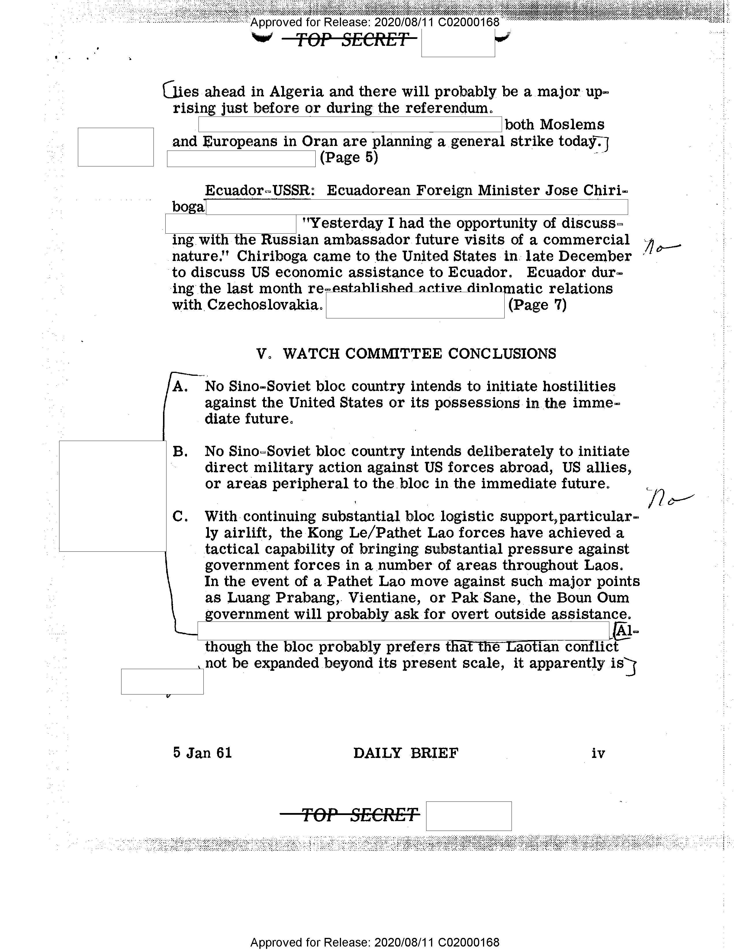 - Approved for Release: 2020/08/11 C02000168 TOP SECRET lies ahead in Algeria and there will probably be a major uprising just before or during the referendum. both Moslems and Europeans in Oran are planning a general strike today. (Page 5) Ecuador-USSR: Ecuadorean Foreign Minister Jose Chiriboga "Yesterday I had the opportunity of discussing with the Russian ambassador future visits of a commercial nature." Chiriboga came to the United States in late December to discuss US economic assistance to Ecuador. Ecuador during the last month re-established active diplomatic relations with Czechoslovakia. (Page 7) V. WATCH COMMITTEE CONCLUSIONS A. No Sino-Soviet bloc country intends to initiate hostilities against the United States or its possessions in the immediate future. B. No Sino-Soviet bloc country intends deliberately to initiate direct military action against US forces abroad, US allies, or areas peripheral to the bloc in the immediate future. C. With continuing substantial bloc logistic support, particularly airlift, the Kong Le/Pathet Lao forces have achieved a tactical capability of bringing substantial pressure against government forces in a number of areas throughout Laos. In the event of a Pathet Lao move against such major points as Luang Prabang, Vientiane, or Pak Sane, the Boun Oum government will probably ask for overt outside assistance. Though the bloc probably prefers that the Laotian conflict not be expanded beyond its present scale, it apparently is 5 Jan 61 DAILY BRIEF iv TOP SECRET Approved for Release: 2020/08/11 C02000168