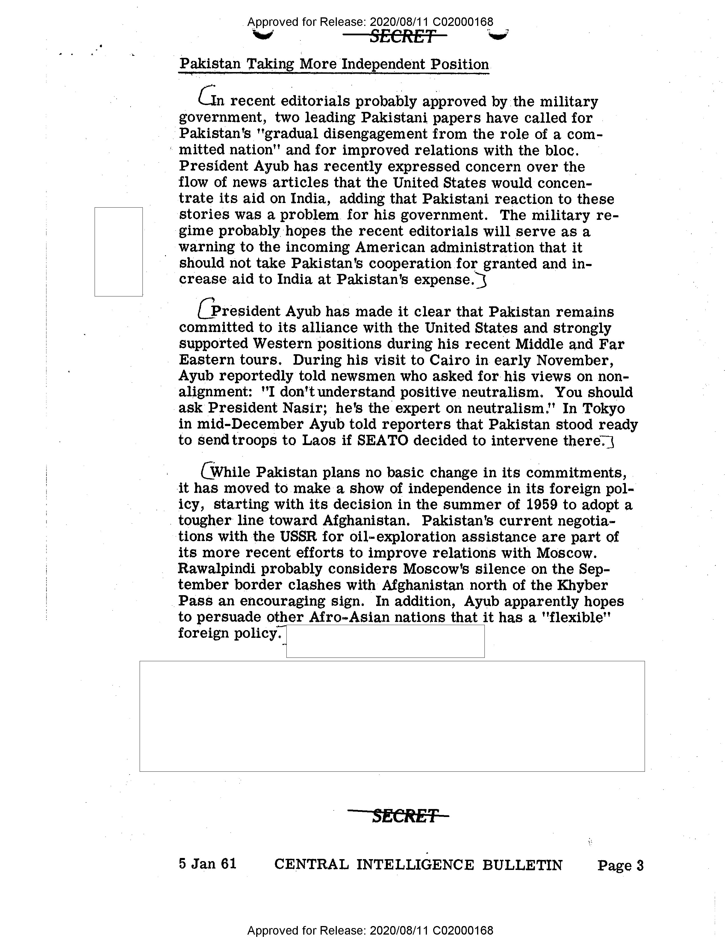 - Approved for Release: 2020/08/11 C02000168 SECRET # Pakistan Taking More Independent Position In recent editorials probably approved by the military government, two leading Pakistani papers have called for Pakistan's "gradual disengagement from the role of a committed nation" and for improved relations with the bloc. President Ayub has recently expressed concern over the flow of news articles that the United States would concentrate its aid on India, adding that Pakistani reaction to these stories was a problem for his government. The military regime probably hopes the recent editorials will serve as a warning to the incoming American administration that it should not take Pakistan's cooperation for granted and increase aid to India at Pakistan's expense. President Ayub has made it clear that Pakistan remains committed to its alliance with the United States and strongly supported Western positions during his recent Middle and Far Eastern tours. During his visit to Cairo in early November, Ayub reportedly told newsmen who asked for his views on non-alignment: "I don't understand positive neutralism. You should ask President Nasir; he's the expert on neutralism." In Tokyo in mid-December Ayub told reporters that Pakistan stood ready to send troops to Laos if SEATO decided to intervene there. While Pakistan plans no basic change in its commitments, it has moved to make a show of independence in its foreign policy, starting with its decision in the summer of 1959 to adopt a tougher line toward Afghanistan. Pakistan's current negotiations with the USSR for oil-exploration assistance are part of its more recent efforts to improve relations with Moscow. Rawalpindi probably considers Moscow's silence on the September border clashes with Afghanistan north of the Khyber Pass an encouraging sign. In addition, Ayub apparently hopes to persuade other Afro-Asian nations that it has a "flexible" foreign policy. SECRET 5 Jan 61 CENTRAL INTELLIGENCE BULLETIN Page 3 Approved for Release: 2020/08/11 C02000168