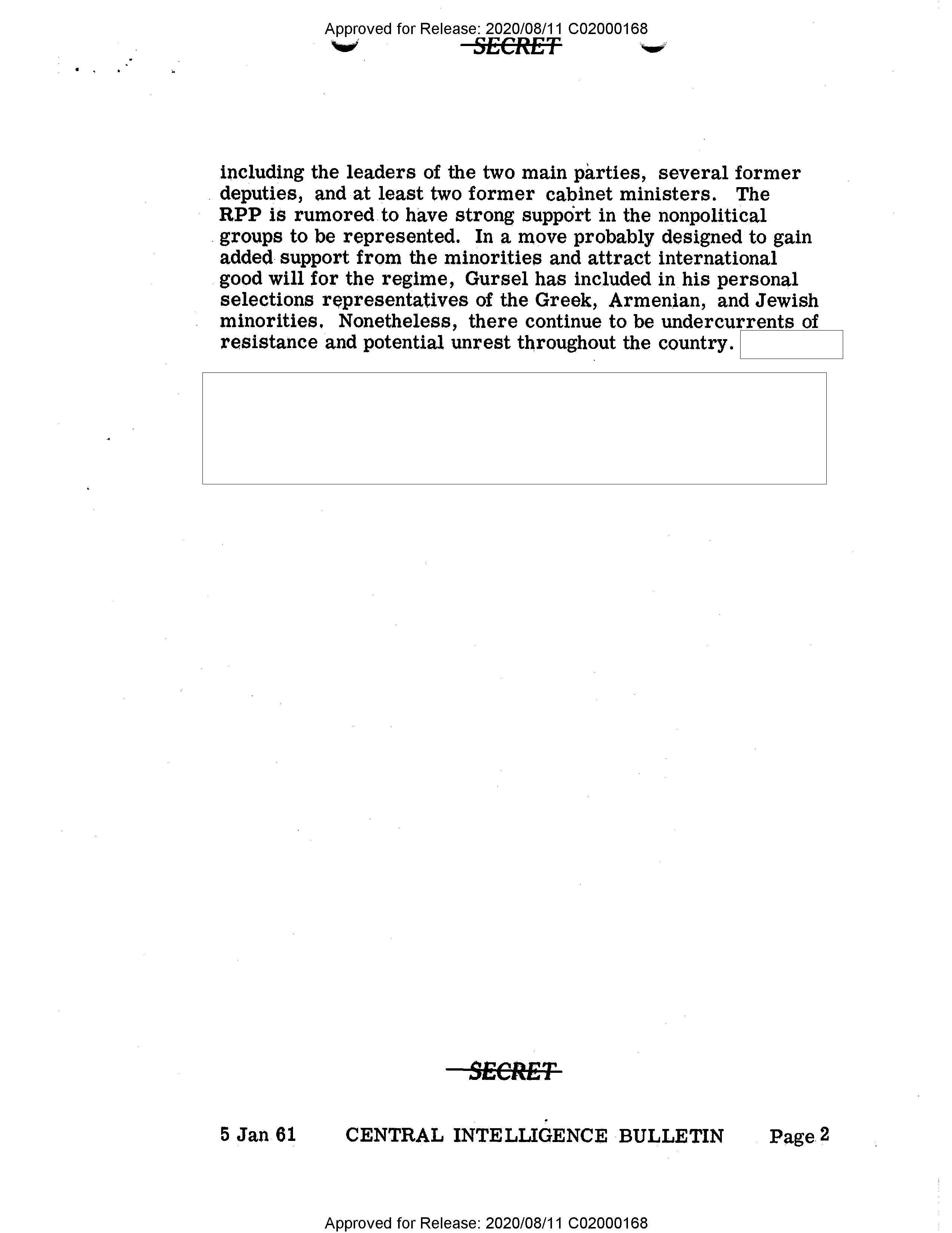 - Approved for Release: 2020/08/11 C02000168 SECRET including the leaders of the two main parties, several former deputies, and at least two former cabinet ministers. The RPP is rumored to have strong support in the nonpolitical groups to be represented. In a move probably designed to gain added support from the minorities and attract international good will for the regime, Gursel has included in his personal selections representatives of the Greek, Armenian, and Jewish minorities. Nonetheless, there continue to be undercurrents of resistance and potential unrest throughout the country. SECRET 5 Jan 61 CENTRAL INTELLIGENCE BULLETIN Page 2 Approved for Release: 2020/08/11 C02000168