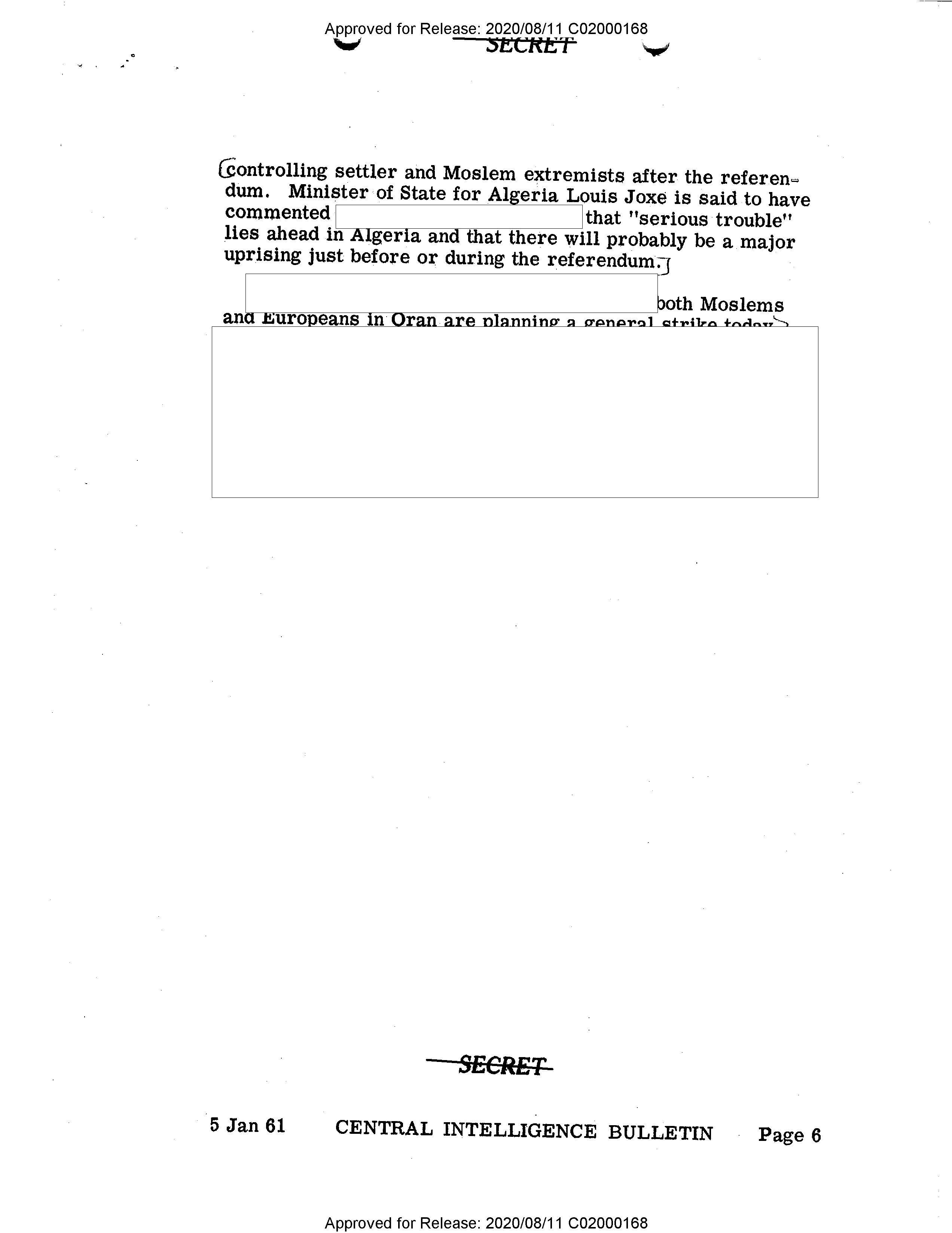 - Approved for Release: 2020/08/11 C02000168 SECRET controlling settler and Moslem extremists after the referendum. Minister of State for Algeria Louis Joxe is said to have commented that "serious trouble" lies ahead in Algeria and that there will probably be a major uprising just before or during the referendum. both Moslems and Europeans in Oran are planning a general strike today SECRET 5 Jan 61 CENTRAL INTELLIGENCE BULLETIN Page 6 Approved for Release: 2020/08/11 C02000168