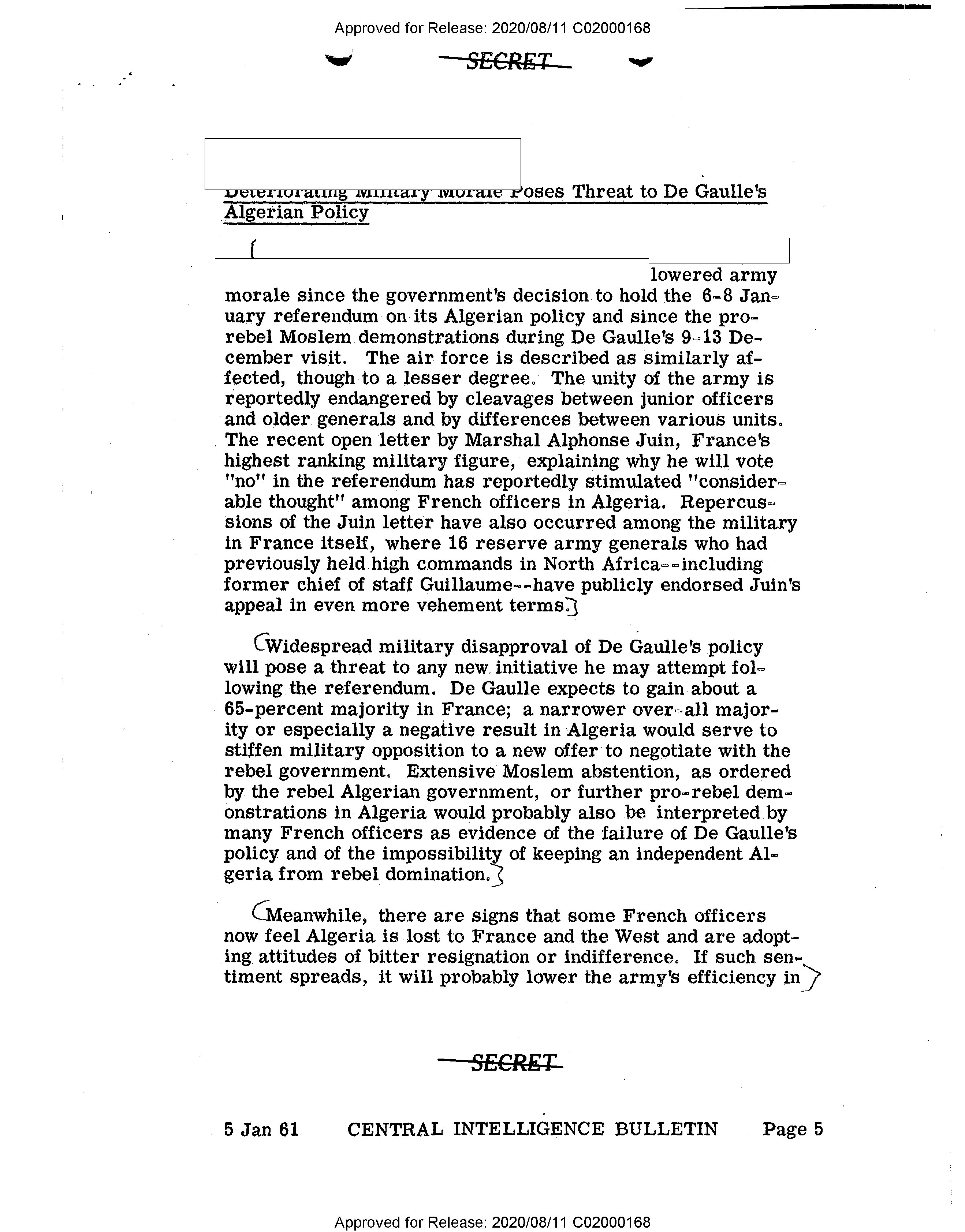 - Approved for Release: 2020/08/11 C02000168 SECRET ## Deteriorating Military Morale Poses Threat to De Gaulle's Algerian Policy lowered army morale since the government's decision to hold the 6-8 January referendum on its Algerian policy and since the pro-rebel Moslem demonstrations during De Gaulle's 9-13 December visit. The air force is described as similarly affected, though to a lesser degree. The unity of the army is reportedly endangered by cleavages between junior officers and older generals and by differences between various units. The recent open letter by Marshal Alphonse Juin, France's highest ranking military figure, explaining why he will vote "no" in the referendum has reportedly stimulated "considerable thought" among French officers in Algeria. Repercussions of the Juin letter have also occurred among the military in France itself, where 16 reserve army generals who had previously held high commands in North Africa--including former chief of staff Guillaume--have publicly endorsed Juin's appeal in even more vehement terms. Widespread military disapproval of De Gaulle's policy will pose a threat to any new initiative he may attempt following the referendum. De Gaulle expects to gain about a 65-percent majority in France; a narrower over-all majority or especially a negative result in Algeria would serve to stiffen military opposition to a new offer to negotiate with the rebel government. Extensive Moslem abstention, as ordered by the rebel Algerian government, or further pro-rebel demonstrations in Algeria would probably also be interpreted by many French officers as evidence of the failure of De Gaulle's policy and of the impossibility of keeping an independent Algeria from rebel domination. Meanwhile, there are signs that some French officers now feel Algeria is lost to France and the West and are adopting attitudes of bitter resignation or indifference. If such sentiment spreads, it will probably lower the army's efficiency in SECRET 5 Jan 61 CENTRAL INTELLIGENCE BULLETIN Page 5 Approved for Release: 2020/08/11 C02000168