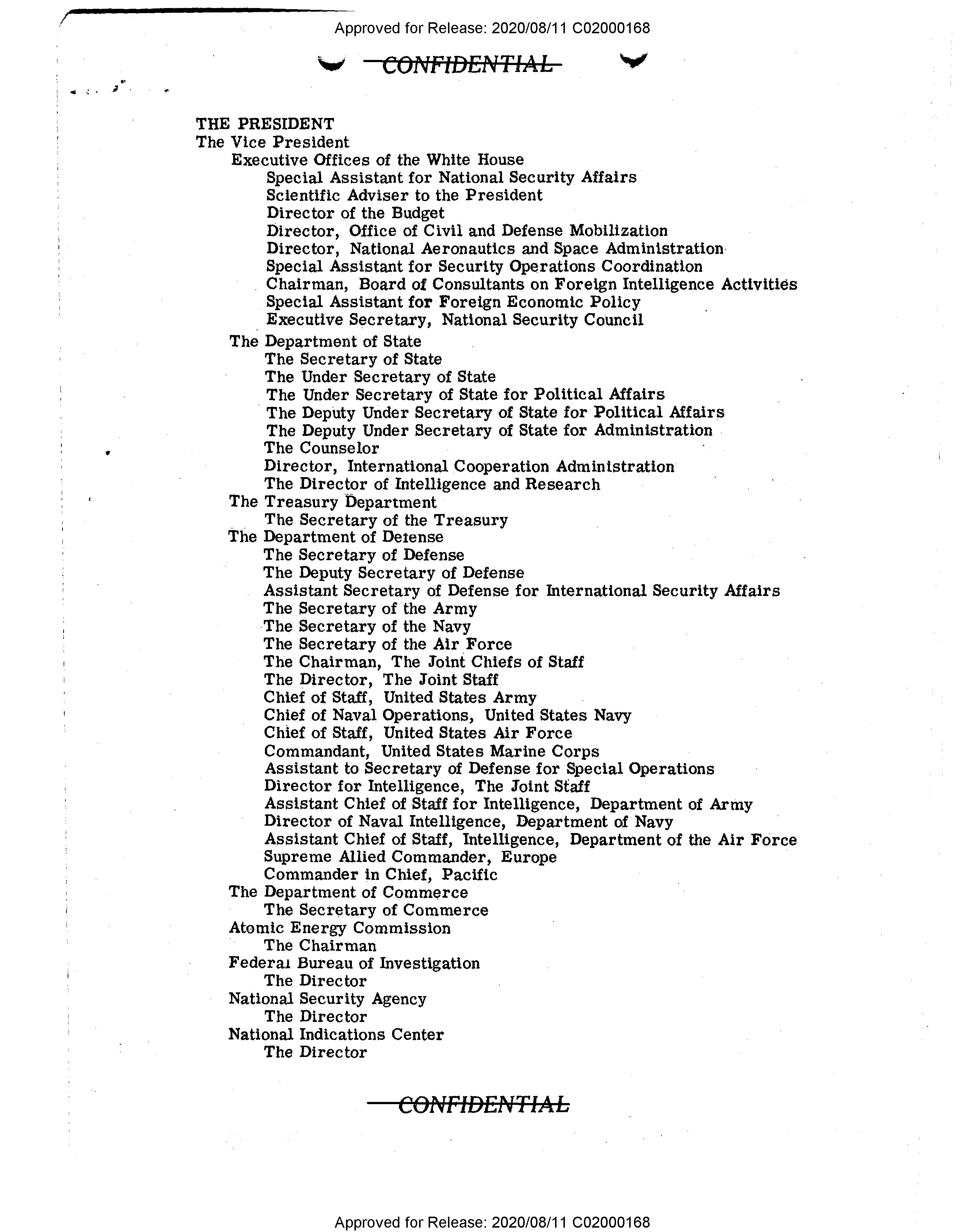 - Approved for Release: 2020/08/11 C02000168 CONFIDENTIAL # THE PRESIDENT The Vice President Executive Offices of the White House - Special Assistant for National Security Affairs - Scientific Adviser to the President - Director of the Budget - Director, Office of Civil and Defense Mobilization - Director, National Aeronautics and Space Administration - Special Assistant for Security Operations Coordination - Chairman, Board of Consultants on Foreign Intelligence Activities - Special Assistant for Foreign Economic Policy - Executive Secretary, National Security Council The Department of State - The Secretary of State - The Under Secretary of State - The Under Secretary of State for Political Affairs - The Deputy Under Secretary of State for Political Affairs - The Deputy Under Secretary of State for Administration - The Counselor - Director, International Cooperation Administration - The Director of Intelligence and Research The Treasury Department - The Secretary of the Treasury The Department of Defense - The Secretary of Defense - The Deputy Secretary of Defense - Assistant Secretary of Defense for International Security Affairs - The Secretary of the Army - The Secretary of the Navy - The Secretary of the Air Force - The Chairman, The Joint Chiefs of Staff - The Director, The Joint Staff - Chief of Staff, United States Army - Chief of Naval Operations, United States Navy - Chief of Staff, United States Air Force - Commandant, United States Marine Corps - Assistant to Secretary of Defense for Special Operations - Director for Intelligence, The Joint Staff - Assistant Chief of Staff for Intelligence, Department of Army - Director of Naval Intelligence, Department of Navy - Assistant Chief of Staff, Intelligence, Department of the Air Force - Supreme Allied Commander, Europe - Commander in Chief, Pacific The Department of Commerce - The Secretary of Commerce Atomic Energy Commission - The Chairman Federal Bureau of Investigation - The Director National Security Agency - The Director National Indications Center - The Director CONFIDENTIAL Approved for Release: 2020/08/11 C02000168